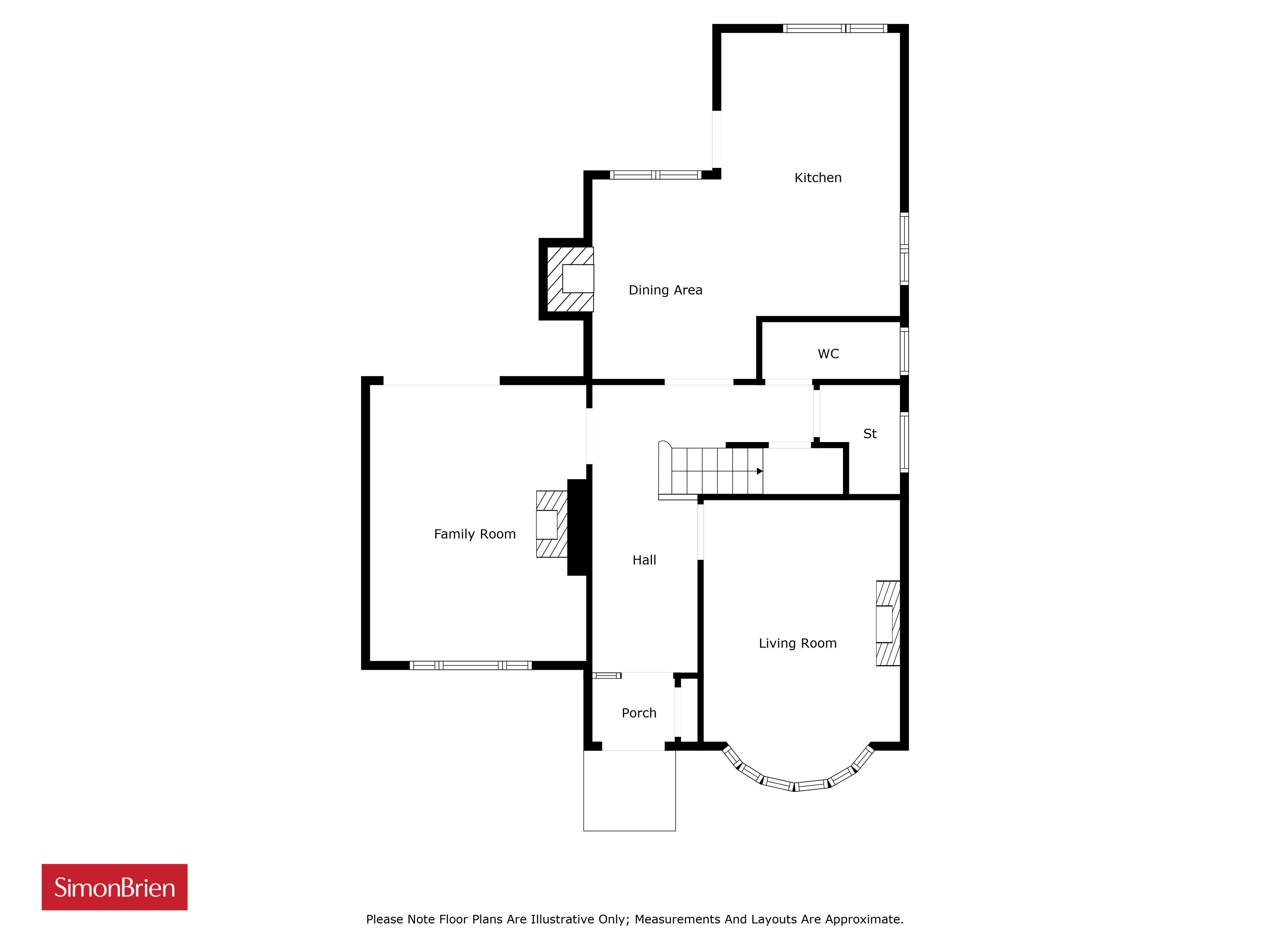 Wood striped floor, picture rail, corniced ceiling, bay window, feature open fire place with hand crafted wooden surround.