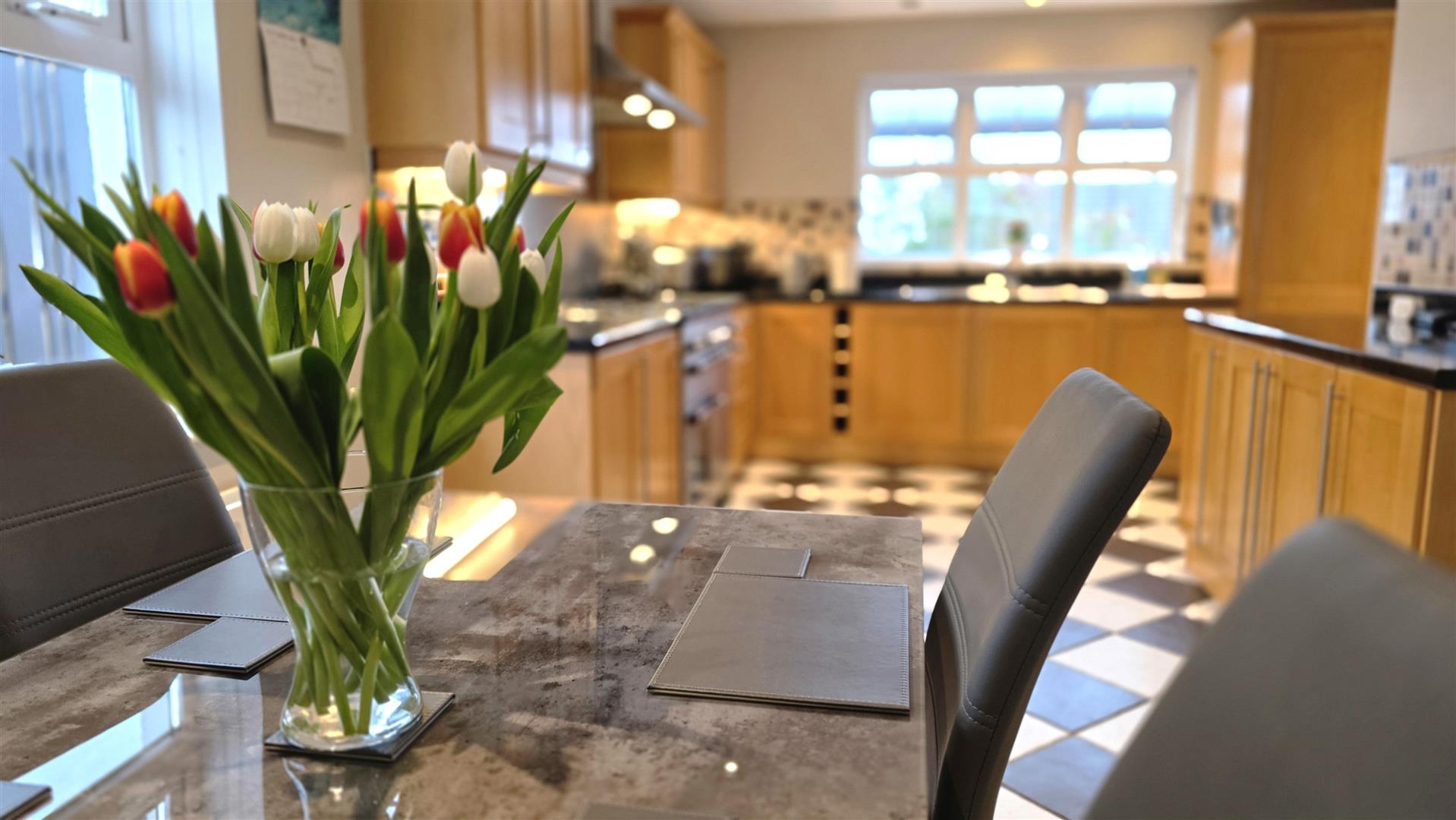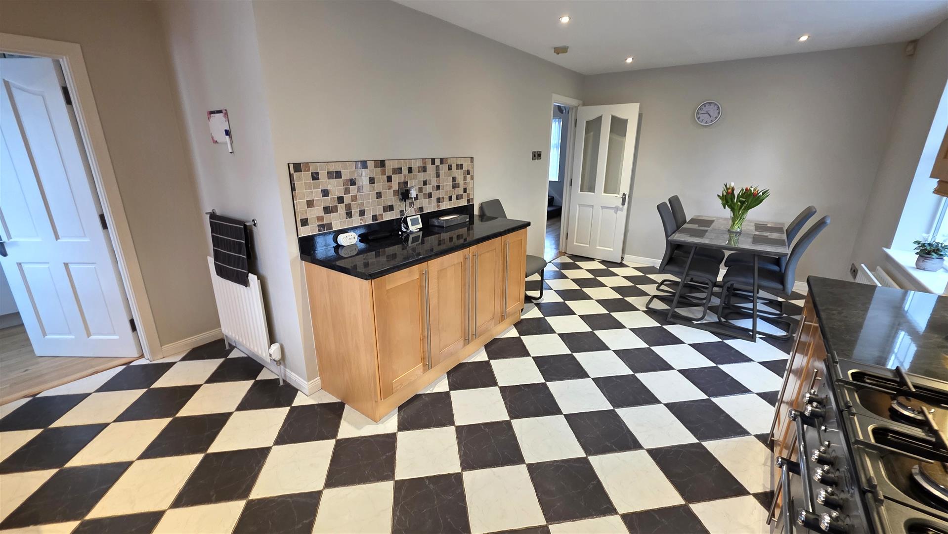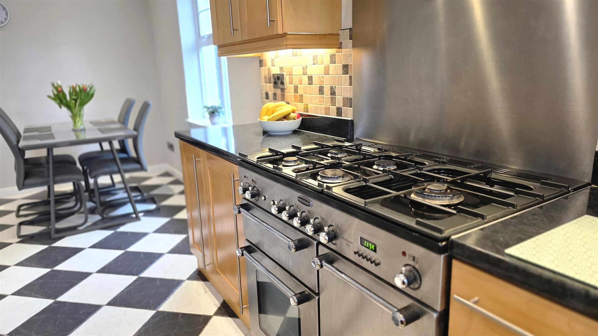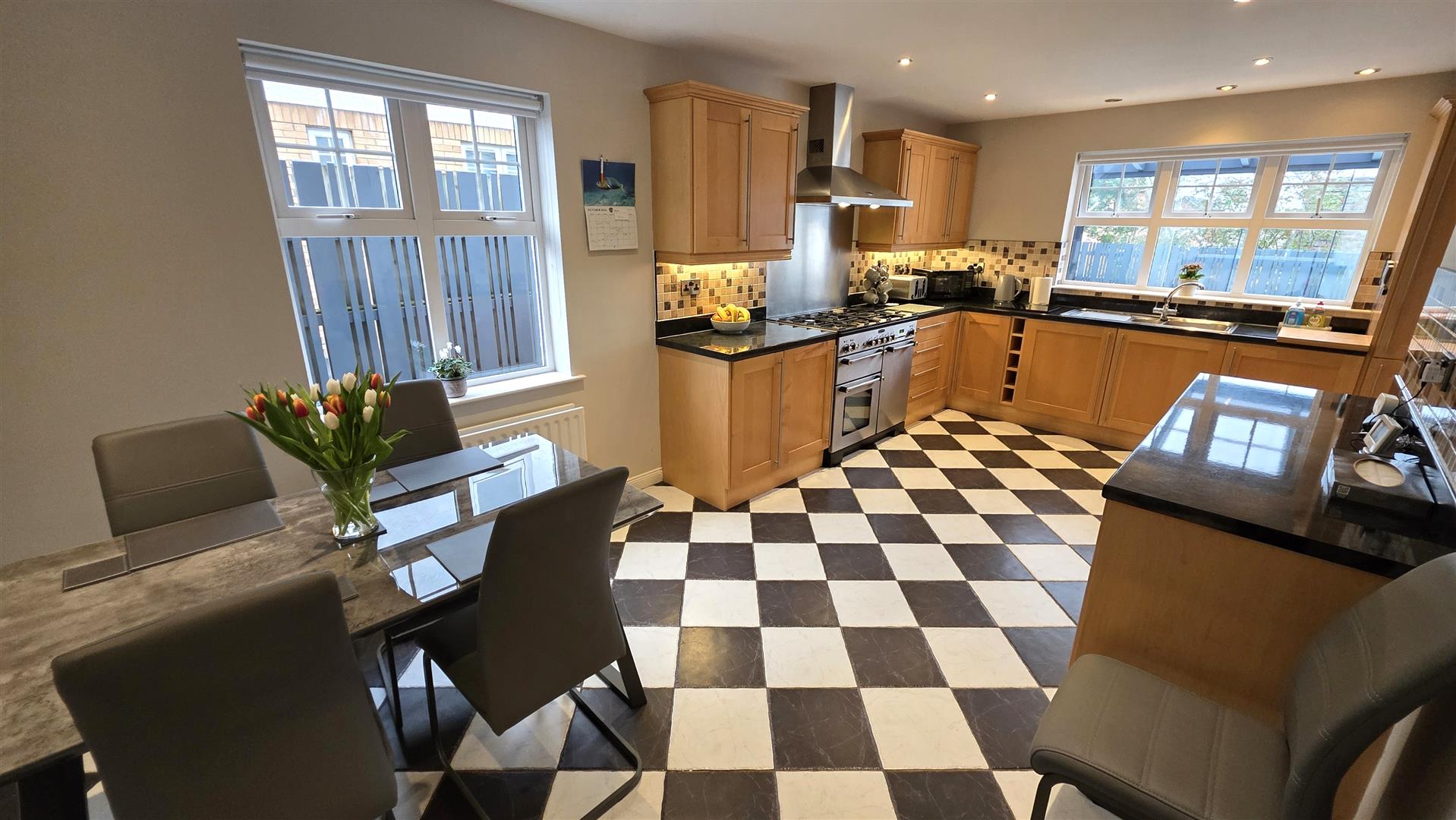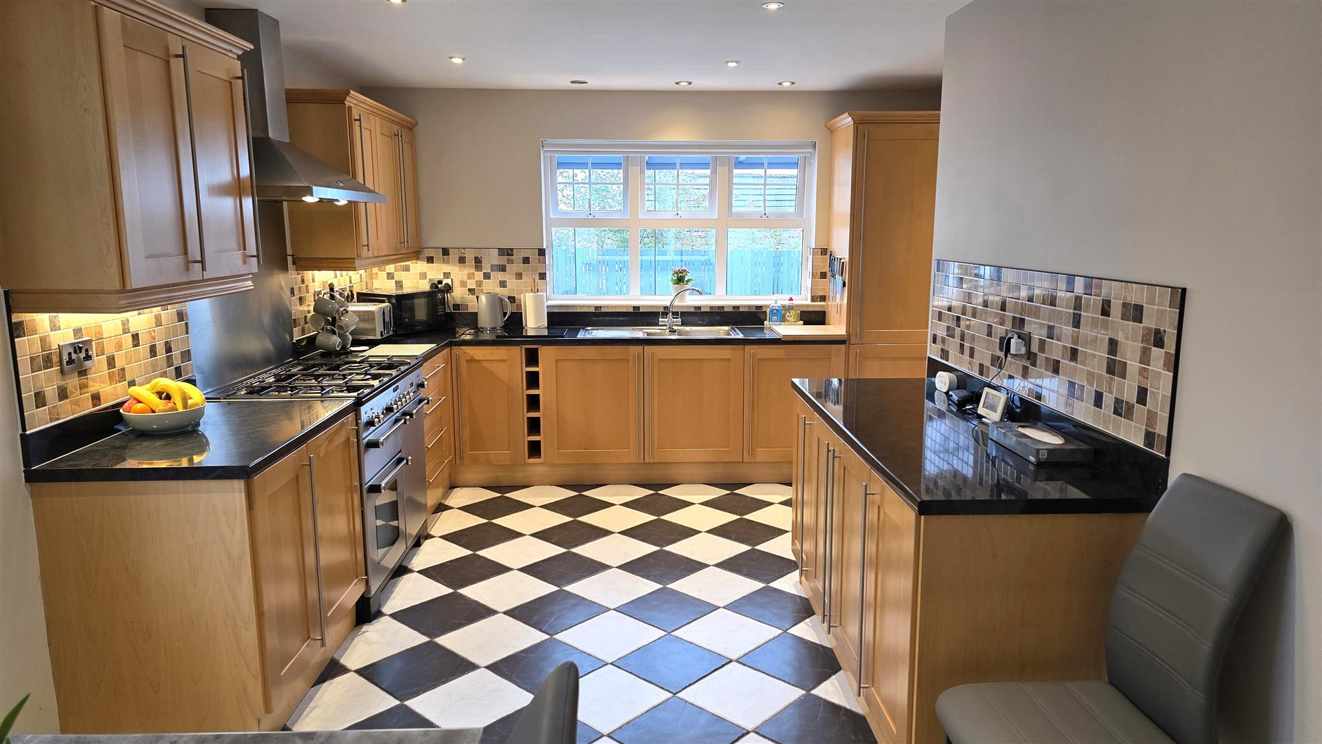 (max) Full range of beech wood "Shaker" style high and low level units with long chrome handles. Matching low level units with adjoining slide out wicker baskets. Contrasting work surfaces with matching upstand. 11/4 bowl single drainer stainless steel sink unit with antique style mixer taps. Space for range style cooker (plumbed for gas) with wide, stainless steel pyramid style extractor canopy. Stainless steel splash back. Integrated fridge and freezer. Space for recessed microwave. Plumbed for dishwasher. Fully tiled floor. Low voltage downlights. Double radiator and single radiator. Part bevelled glass door to entrance hall. Dual aspect windows. Door to;