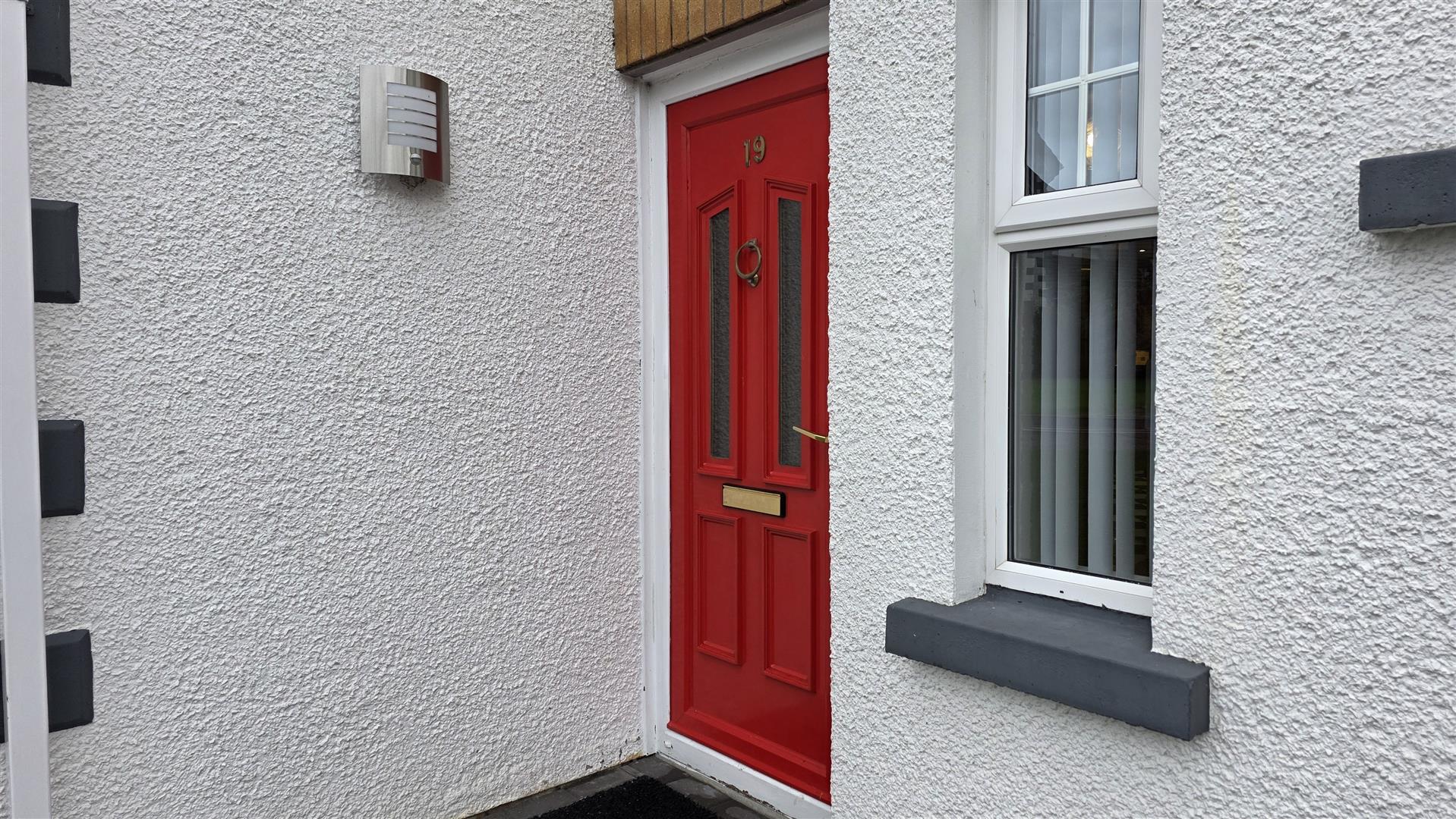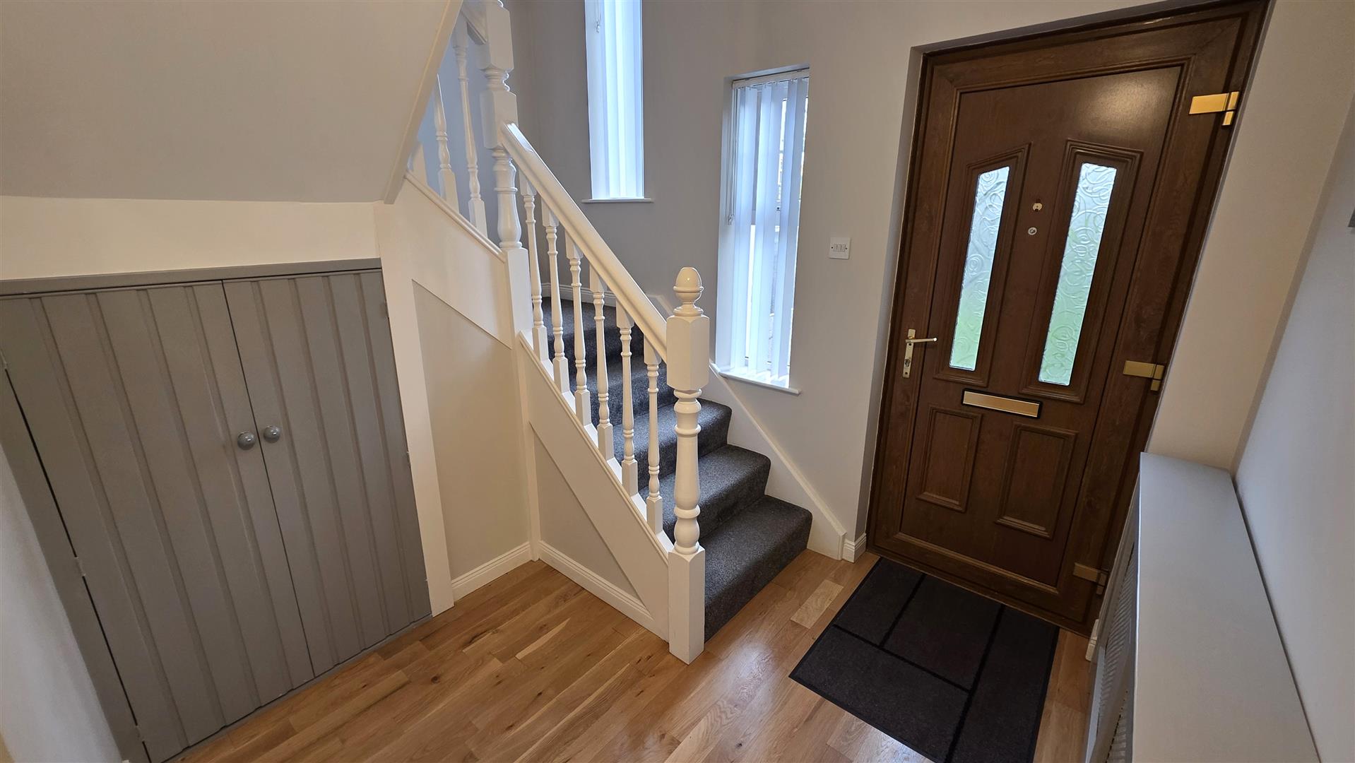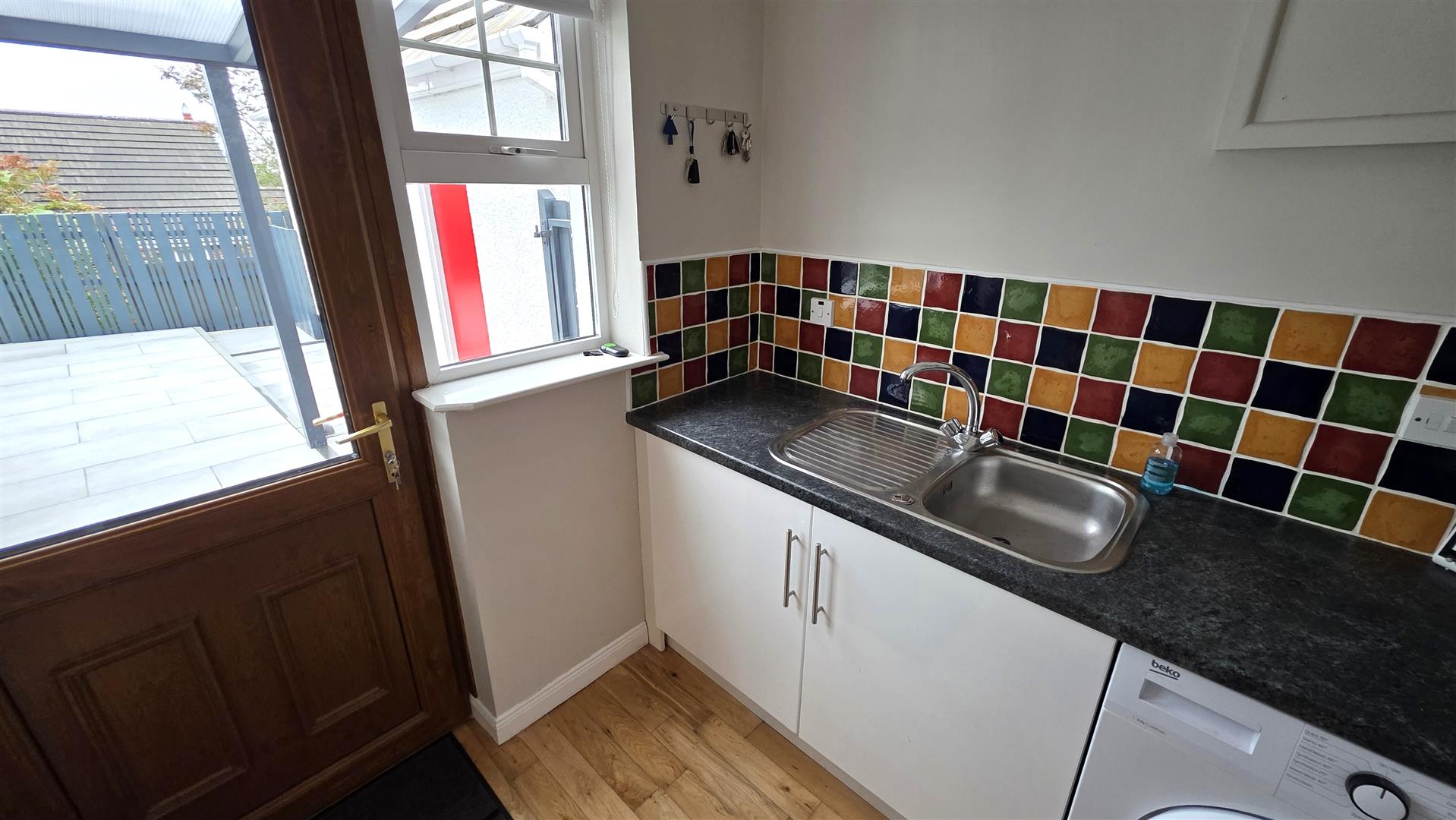 Garden to front in neat lawn. Paved pathway to front and side with timber pedestrian gateway. Recently tarmacked drive with off-street parking for 2 plus cars. Access to;