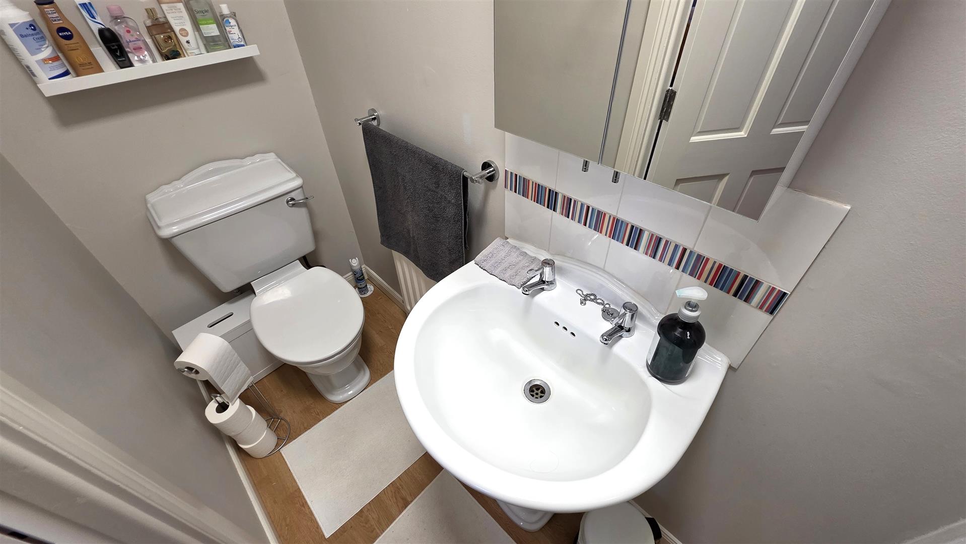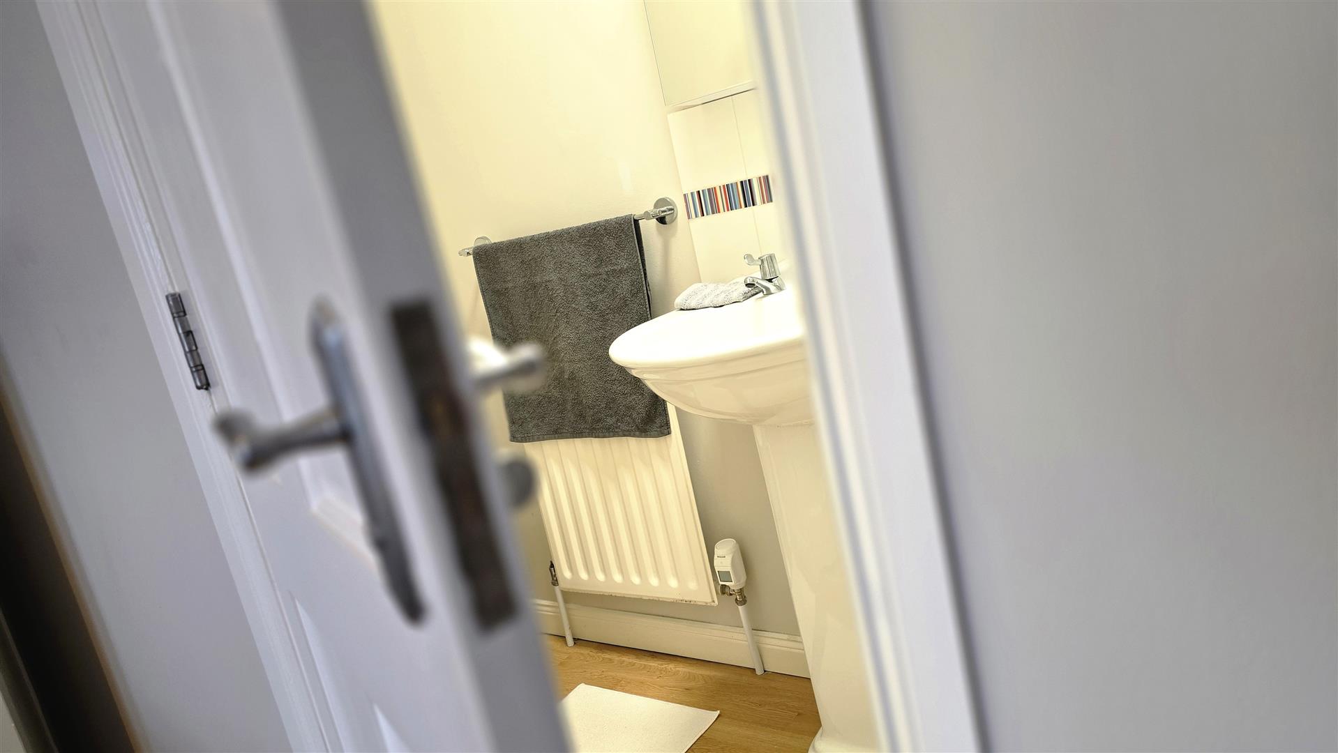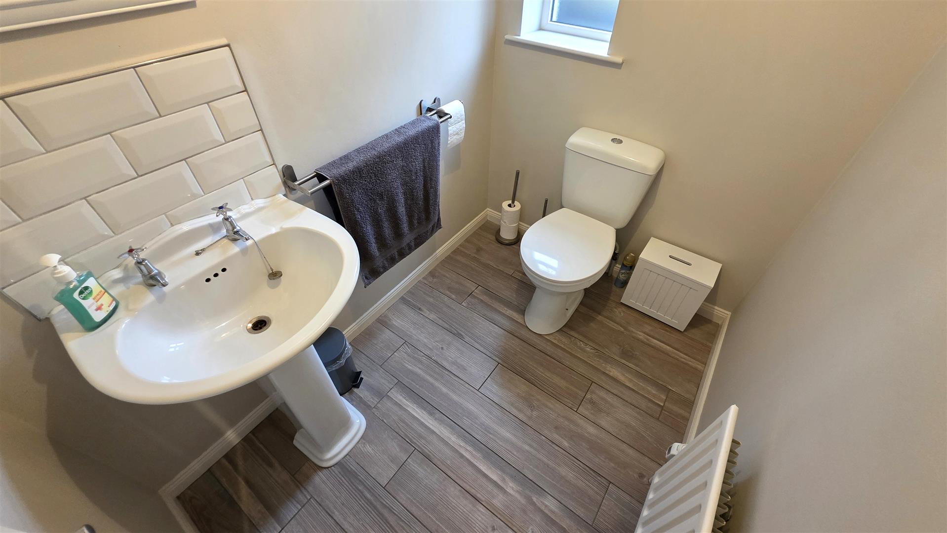 Modern white suite comprising push button low flush W/C and pedestal wash hand basin with "metro" style tiled splash back. Wood effect fully tiled floor. Single radiator.