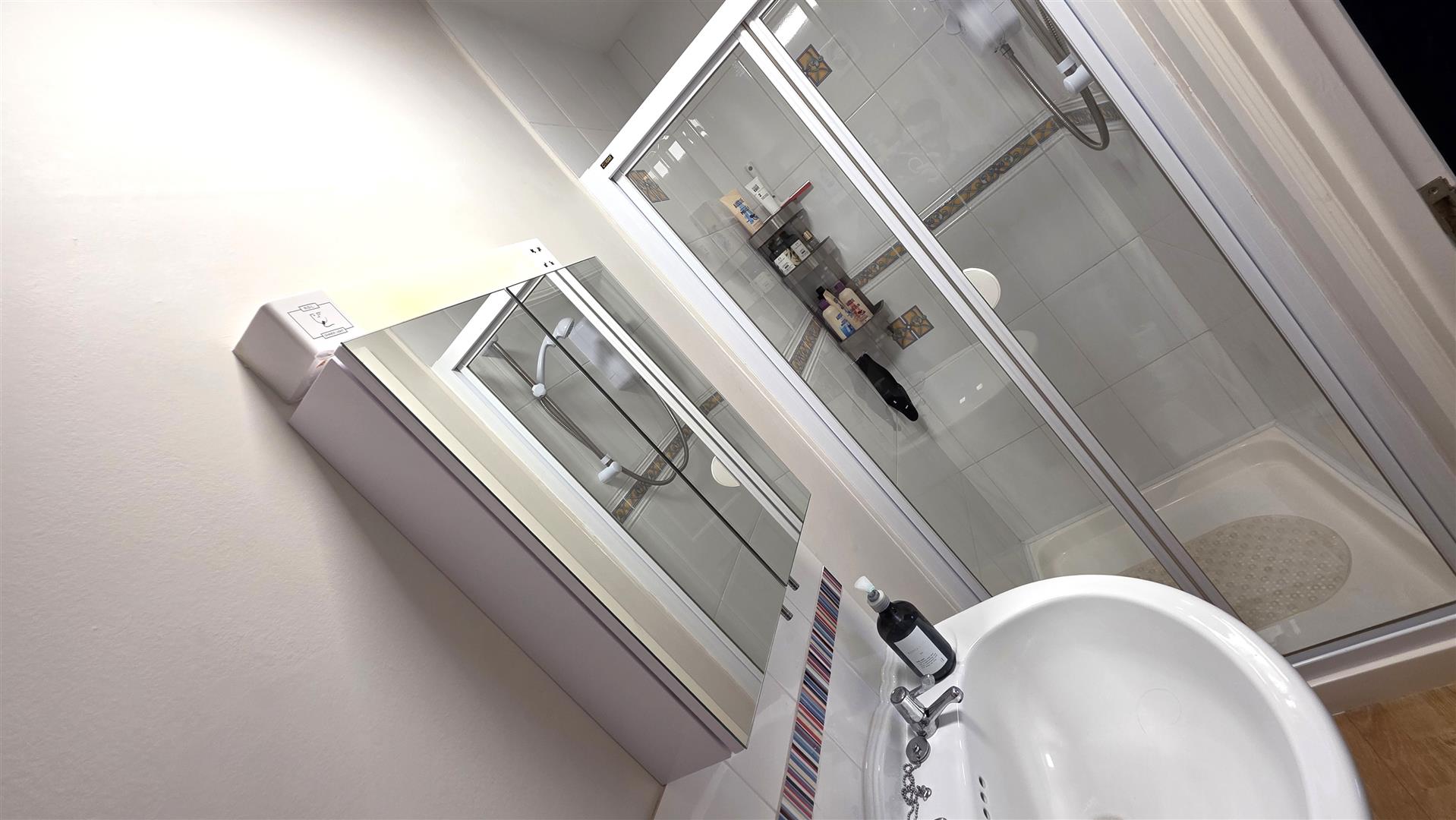 Modern white victorain style suite comprising low flush W/C, pedestal wash hand basin and fully tiled shower cubicle with 'Newteam' electric shower unit. Pivot and slide door. Extractor fan. Shaver point. Wood laminate floor. Single radiator.