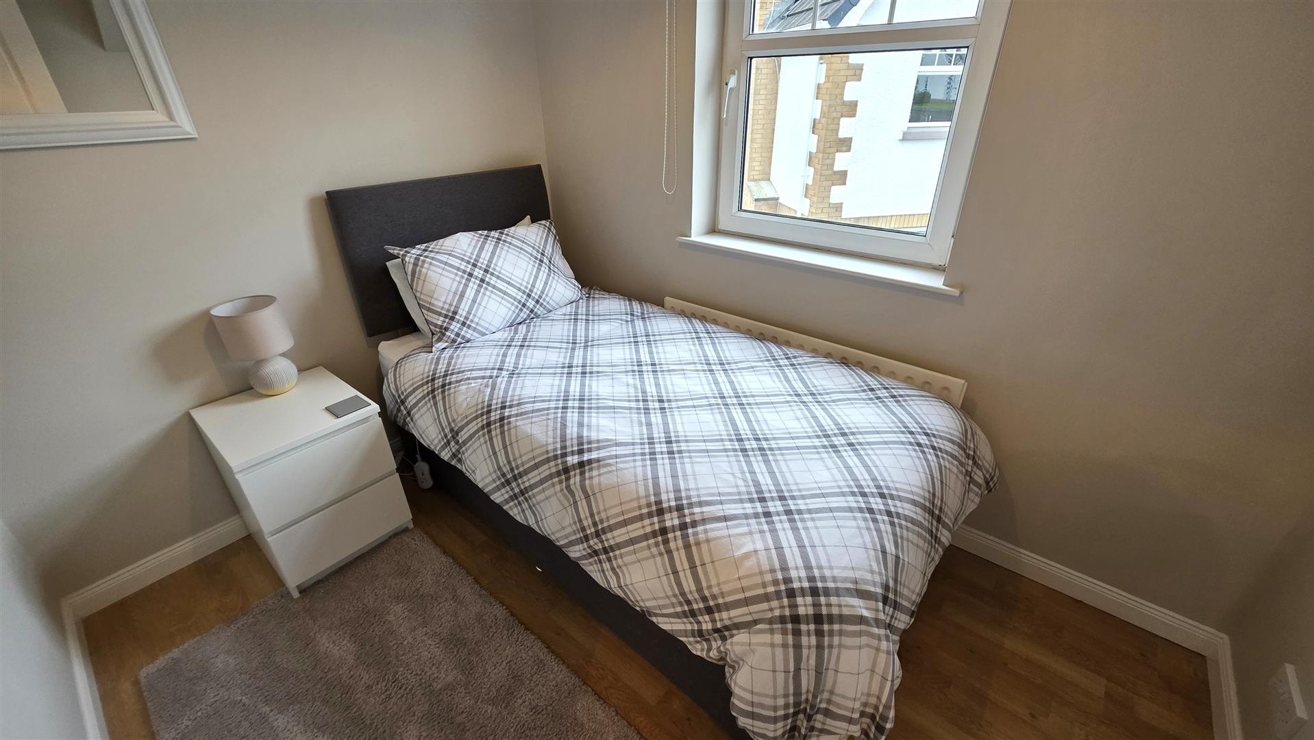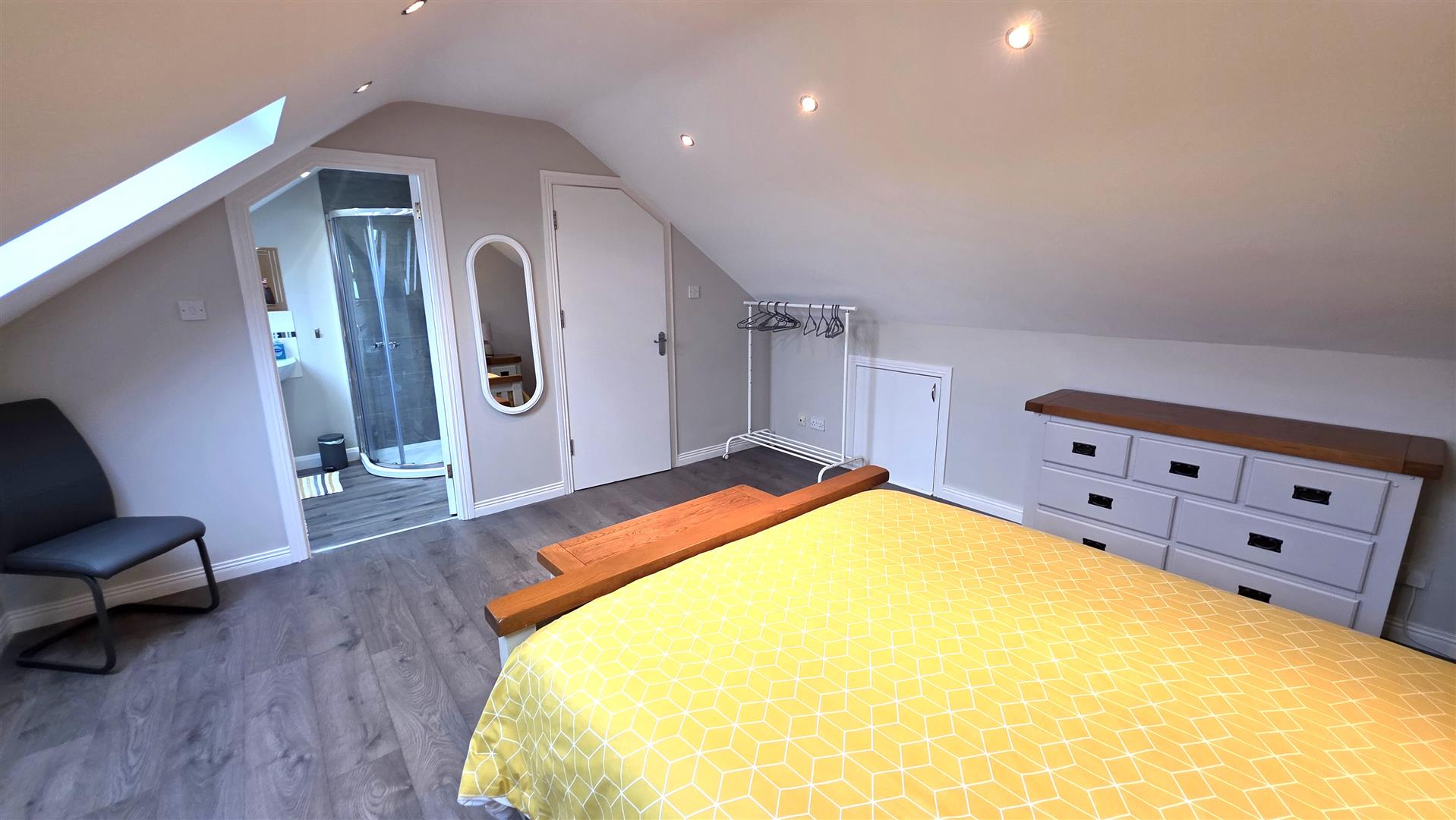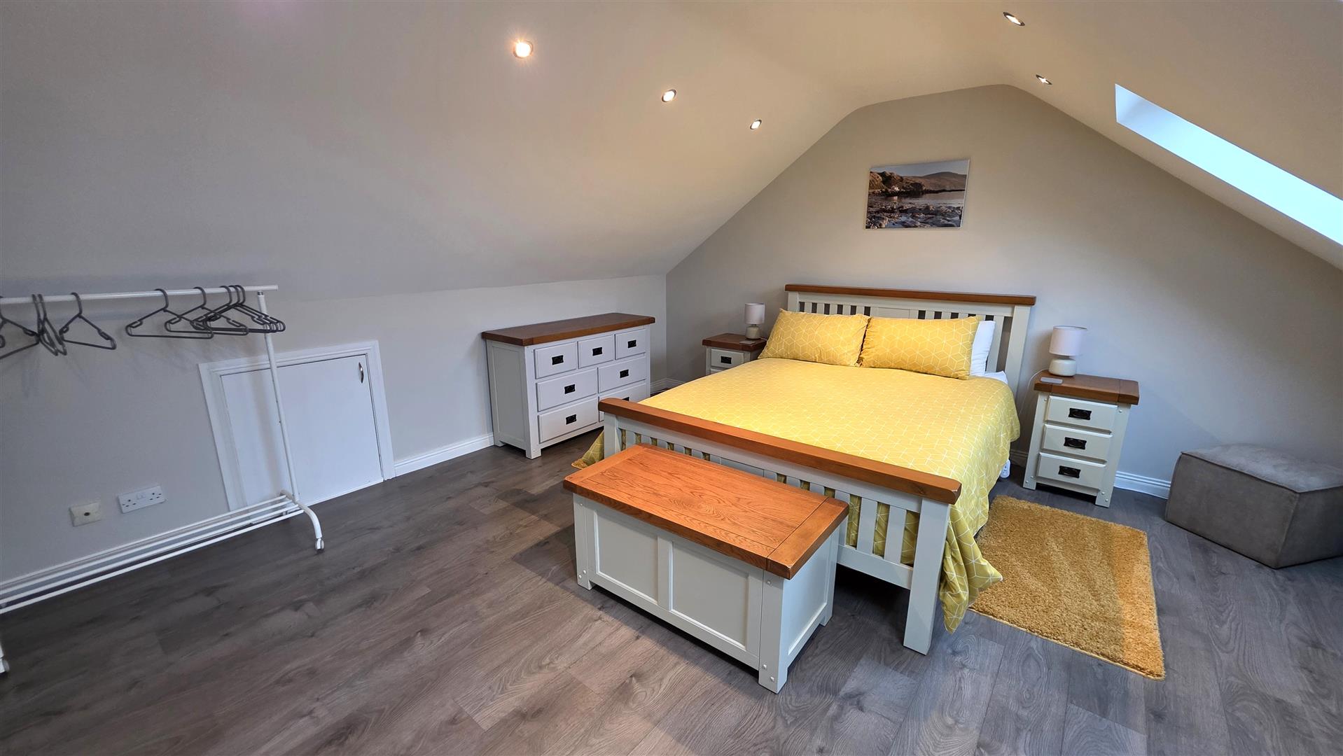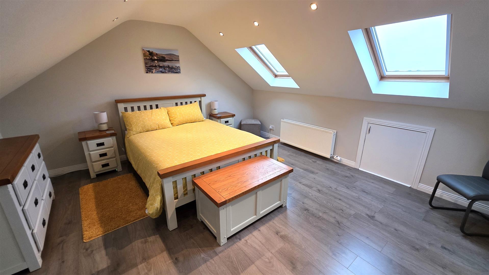 Wood laminate floor. Double radiator. Access to under eaves storage and fire escape window. 2 No. Double glazed "Velux" roof lights with superb views. Polished chrome low voltage down lights.