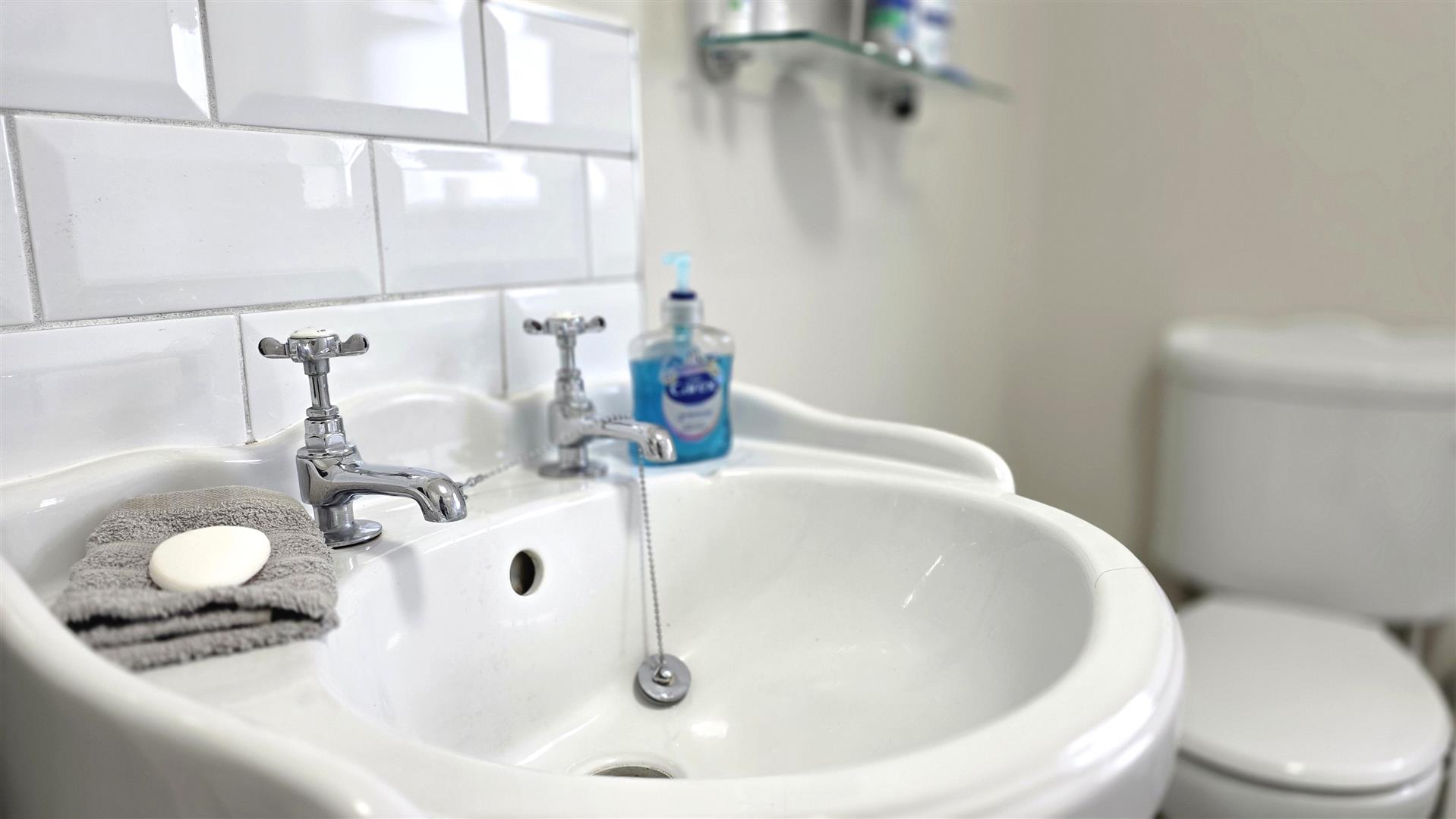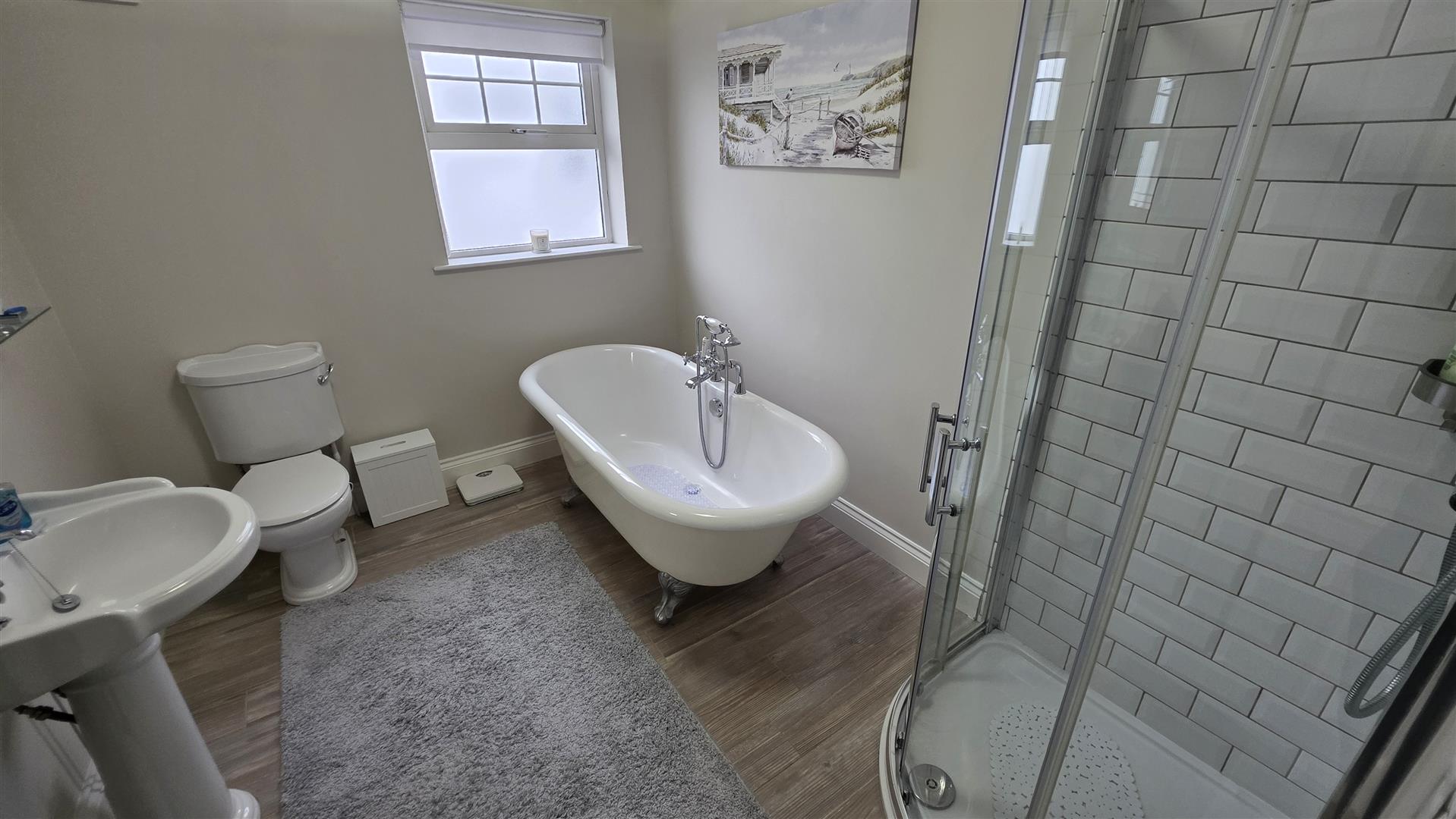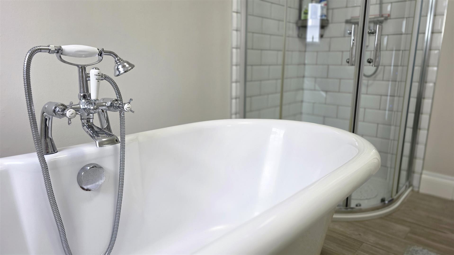 Modern white victorian style suite comprising free standing roll top, ball and claw bath with antique style telephone hand shower. Low flush W/C, and pedestal wash hand basin. Fully tiled corner quadrant shower cubicle with antique style power shower unit comprising fixed drench head and handheld shower. Sliding cubicle doors. Double radiator. Extractor fan. Woodgrain effect fully tiled floor.