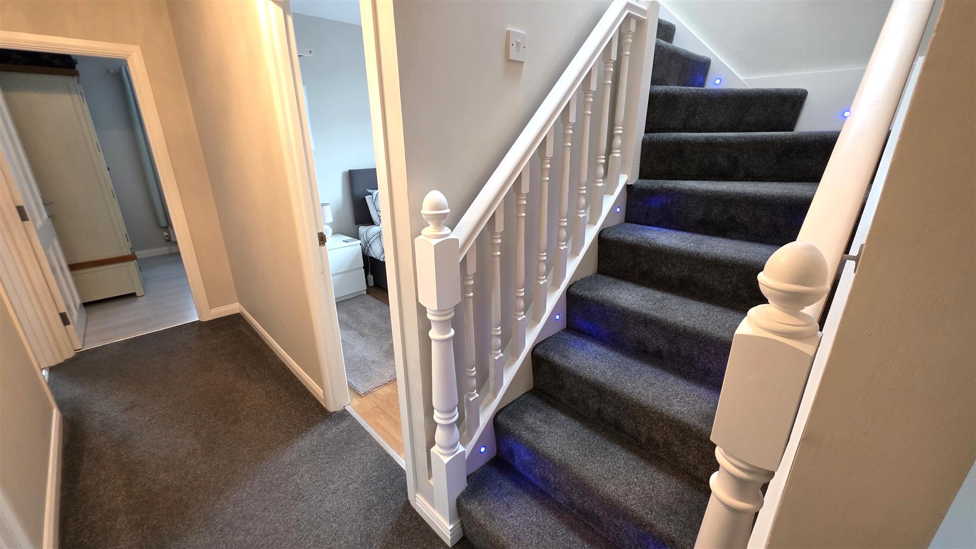 Staircase to second floor with moulded handrail and turned balustrading. Feature bullet lighting to stairs. Single radiator.