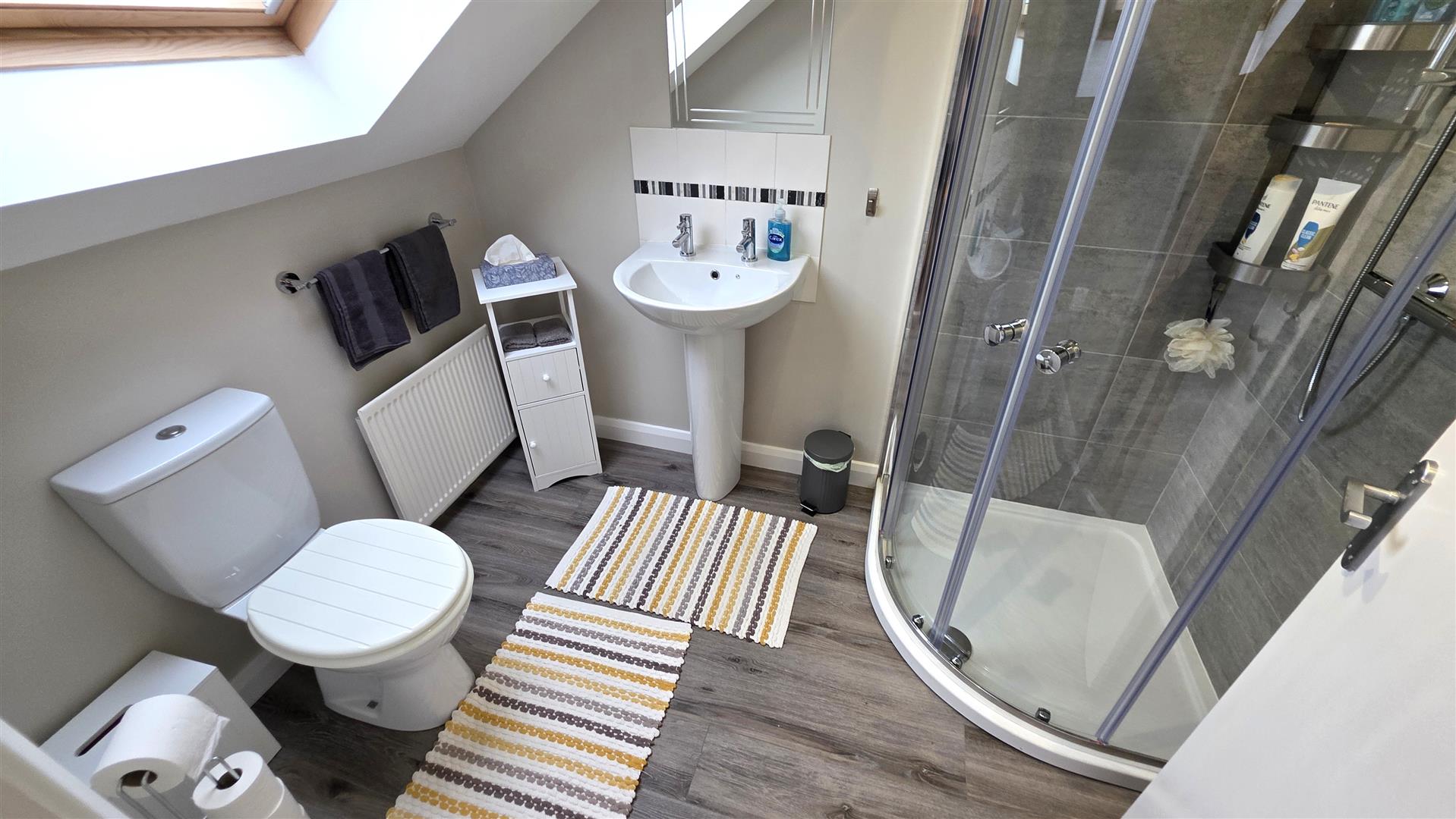 Modern white suite comprising push button low flush W/C. Pedestal wash hand basin with tiled splash back. Fully tiled corner quadrant shower cubicle with thermostatic shower unit comprising fixed head and hand held shower. Sliding cubicle doors. Low voltage down lights. Extractor fan. "Velux" double glazed roof light. Tiled effect floor. Single radiator.