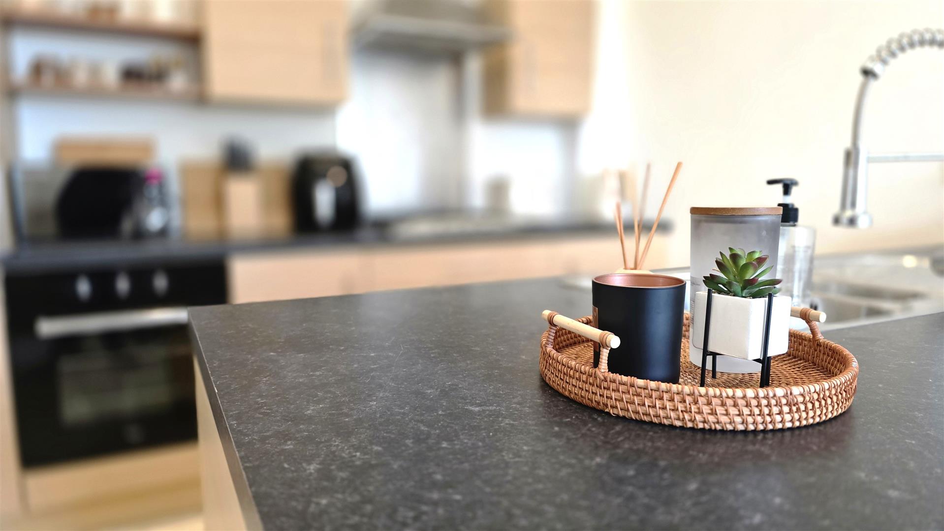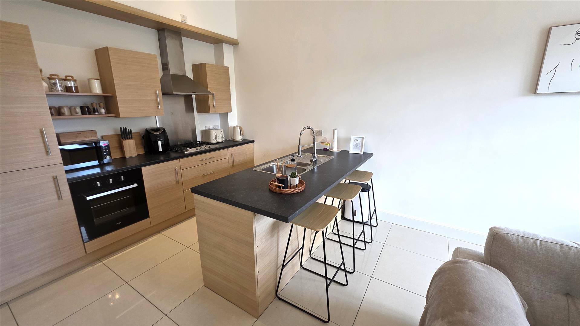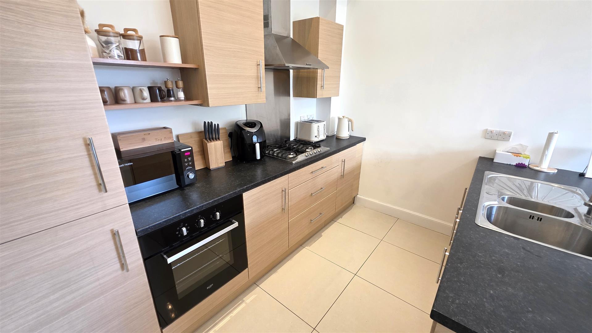 Full range of light oak effect high and low level units with short chrome handles and contrasting work surfaces. Integrated four ring gas hob with stainless steel splash back and stainless steel pyramid style over head extractor fan. Low level combination oven and grill. Integrated fridge and freezer. Integrated washer/dryer. One and a quarter bowl stainless steel sink unit and mixer taps. Four seater breakfast bar. Fully tiled floor. Low voltage down lights.