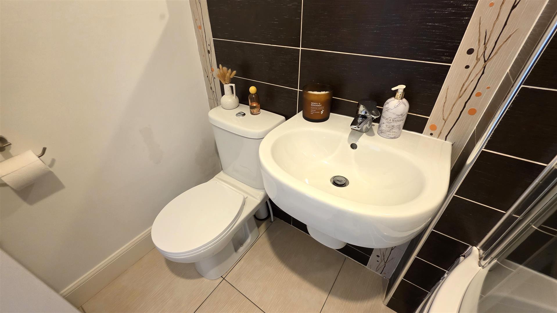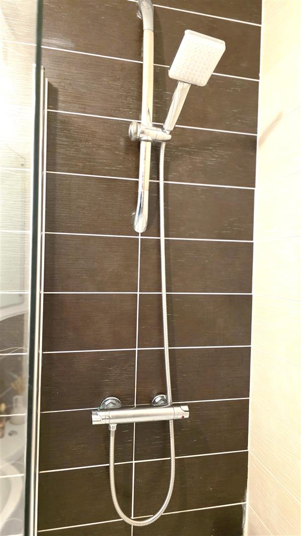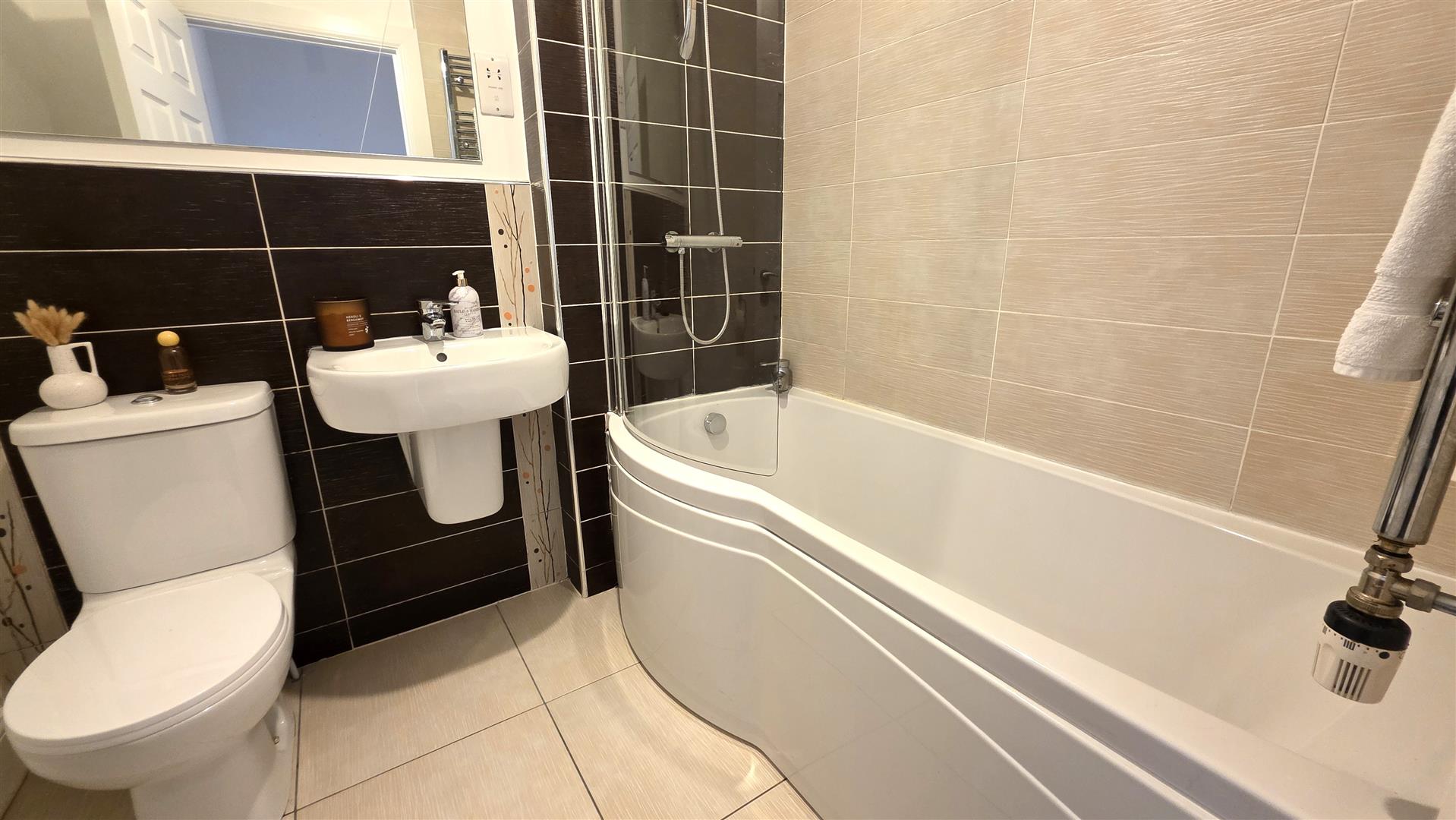 Modern white suite comprising shower bath with curved glass screen. Off-set mixer taps and thermostatic shower unit over. Push button low flush W/C and half pedestal wash hand basin with mixer taps. Fully tiled walls to bath area. Fully tiled floor. Extractor fan. Polished chrome heated towel rail. Access to loft.