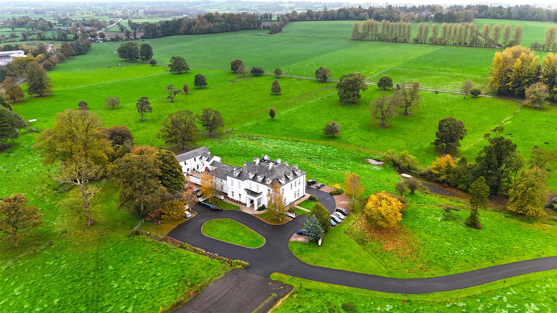 Long flowing tarmac driveway to main front area with granite kerbed edging and communal lawn. Decorative remote electric gates to communal enclosed parking. Extensive communal grounds and parking.