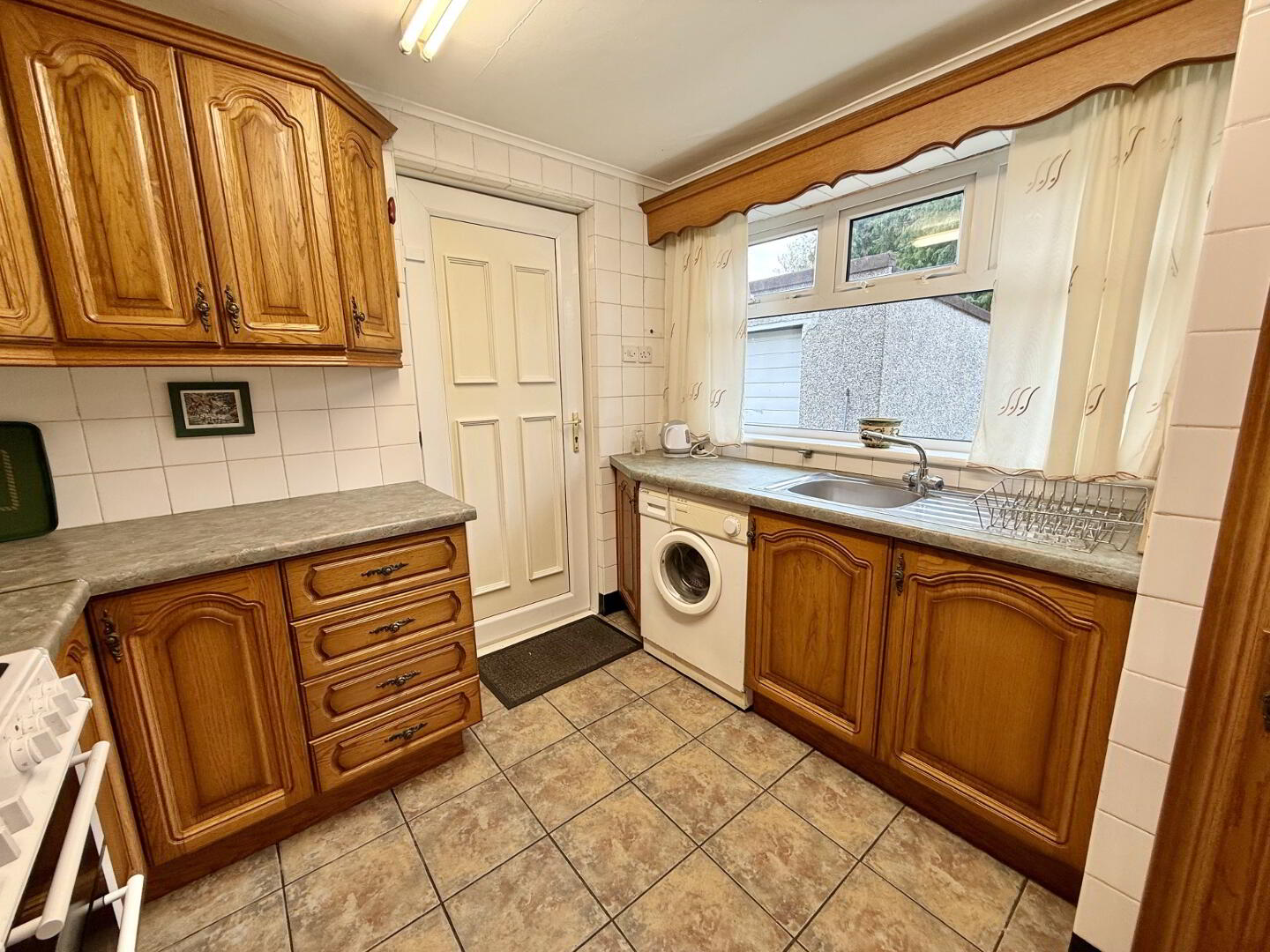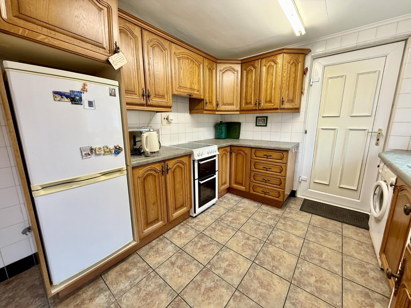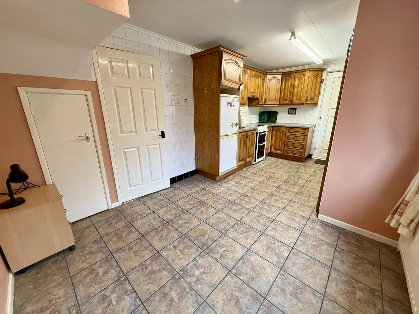 Large open-plan kitchen diner with ample space for family dining. The fully fitted kitchen includes high and low units, space for a freestanding cooker and hob with overhead extractor fan, space for a fridge freezer, and plumbing for a washing machine. Access is provided to both the side and rear of the property.