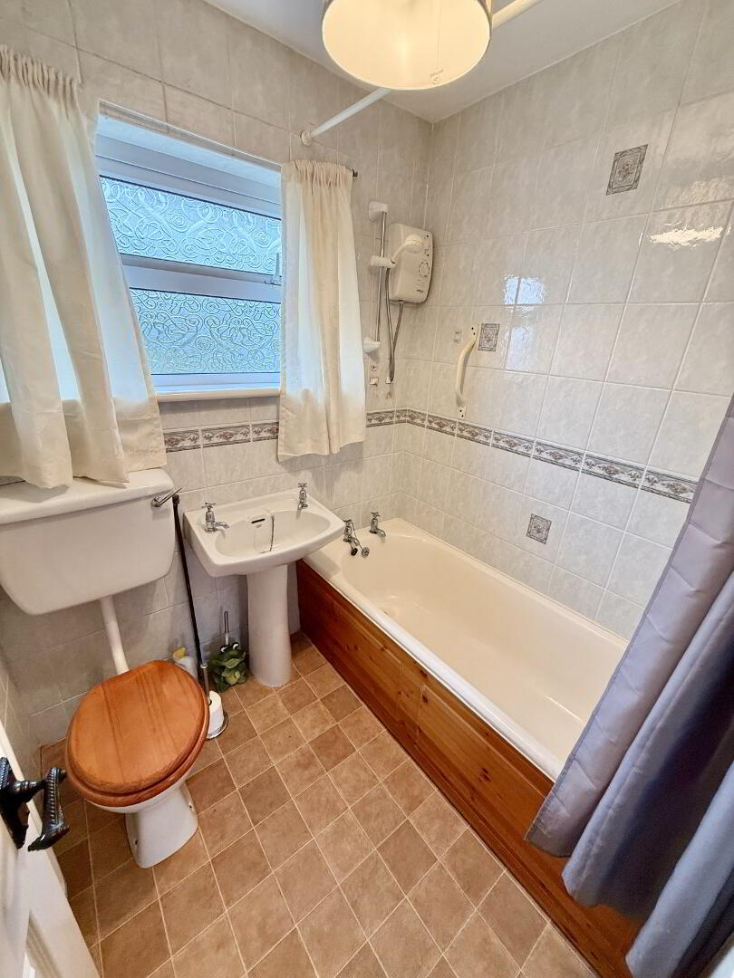 Family bathroom offering a four-piece suite comprising WC, wash hand basin, and bathtub with overhead electric shower. Fully tiled walls and tile effect flooring complete the room.
