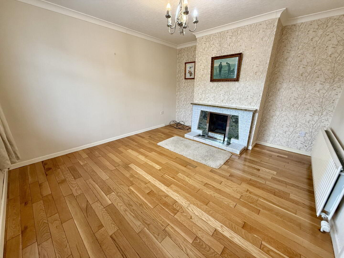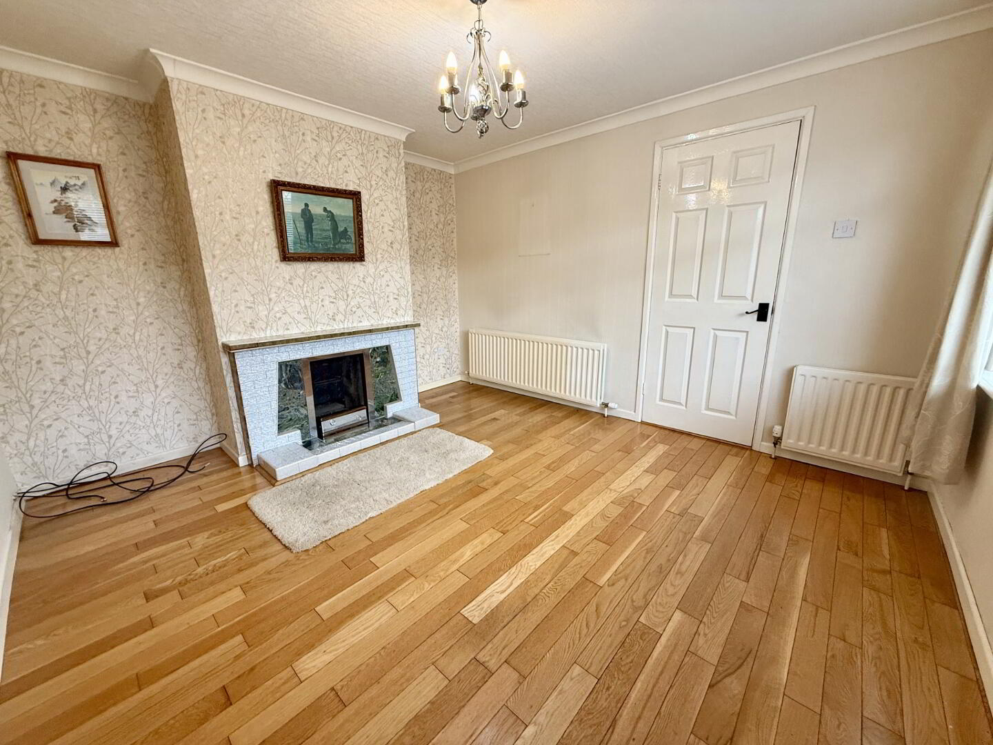 Bright and spacious family living room with an open fireplace and feature surround, front aspect, and fitted with electrical and TV points.