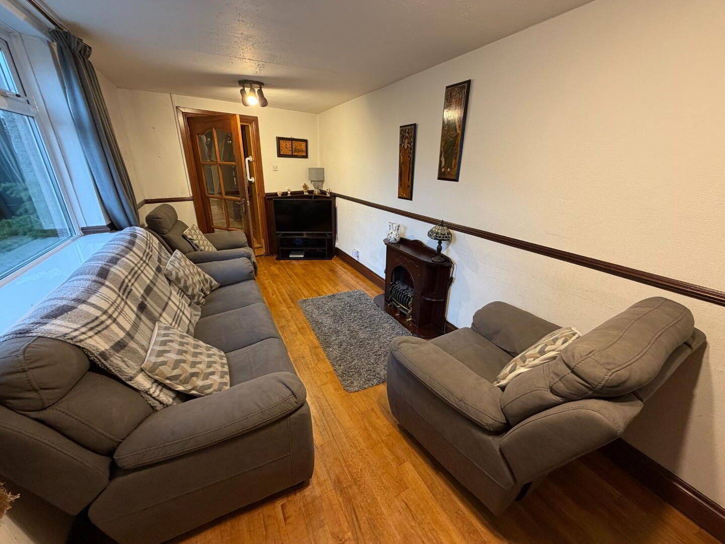 Sizeable reception room with wooden flooring and wallpapered walls, complete with TV and electrical points.