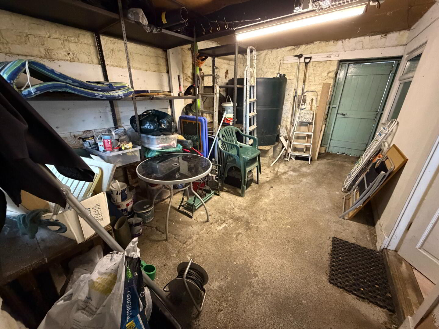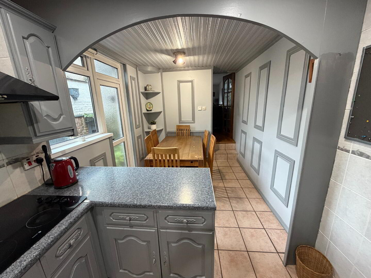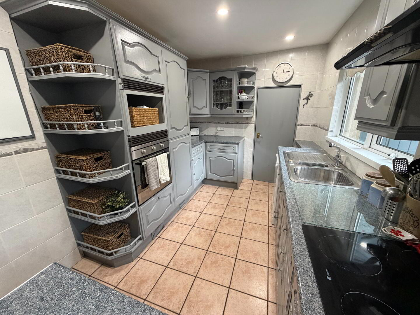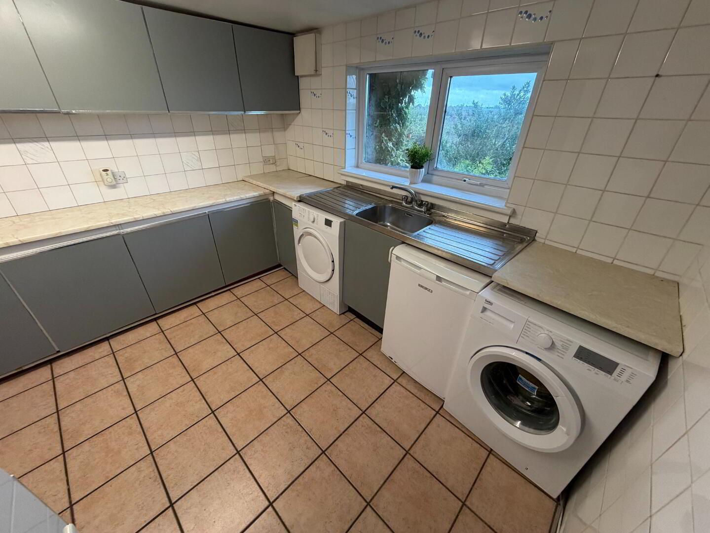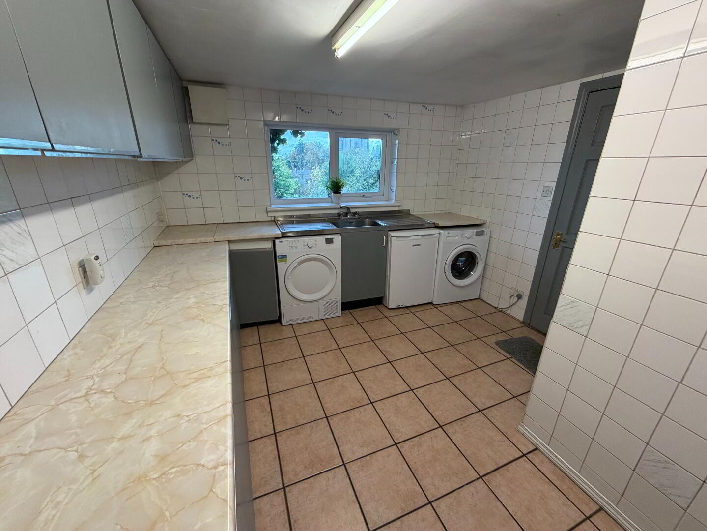 Spacious utility room with high and low units, stainless steel sink, and plumbing for white goods. Houses the oil boiler and offers direct access to the rear garden and shed. Adjoining the utility is a ground floor bathroom.
