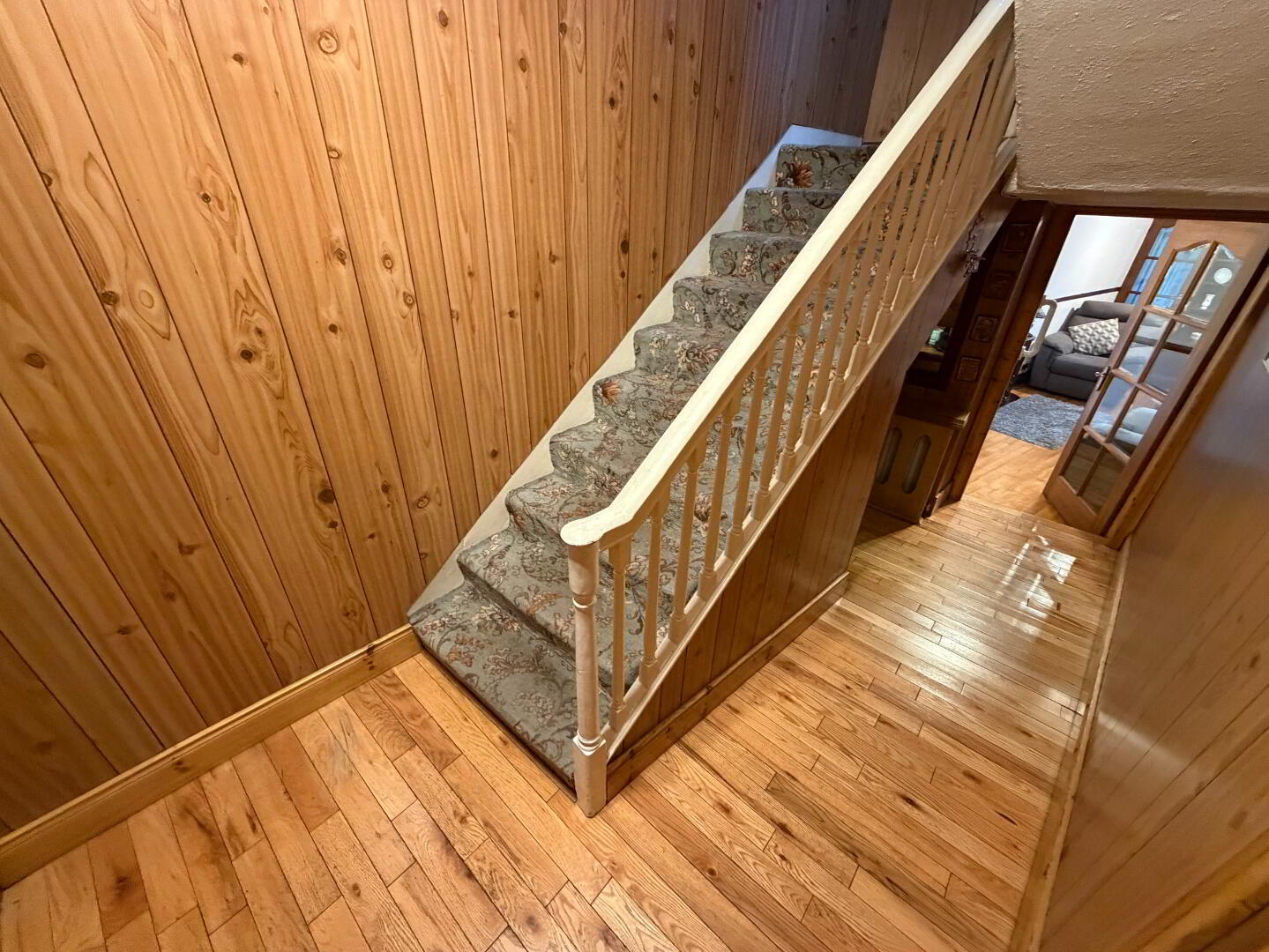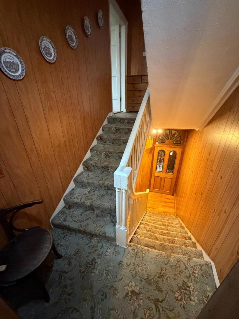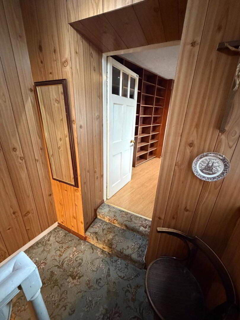 Welcoming entrance hall finished with tiled flooring and wood-panelled walls.