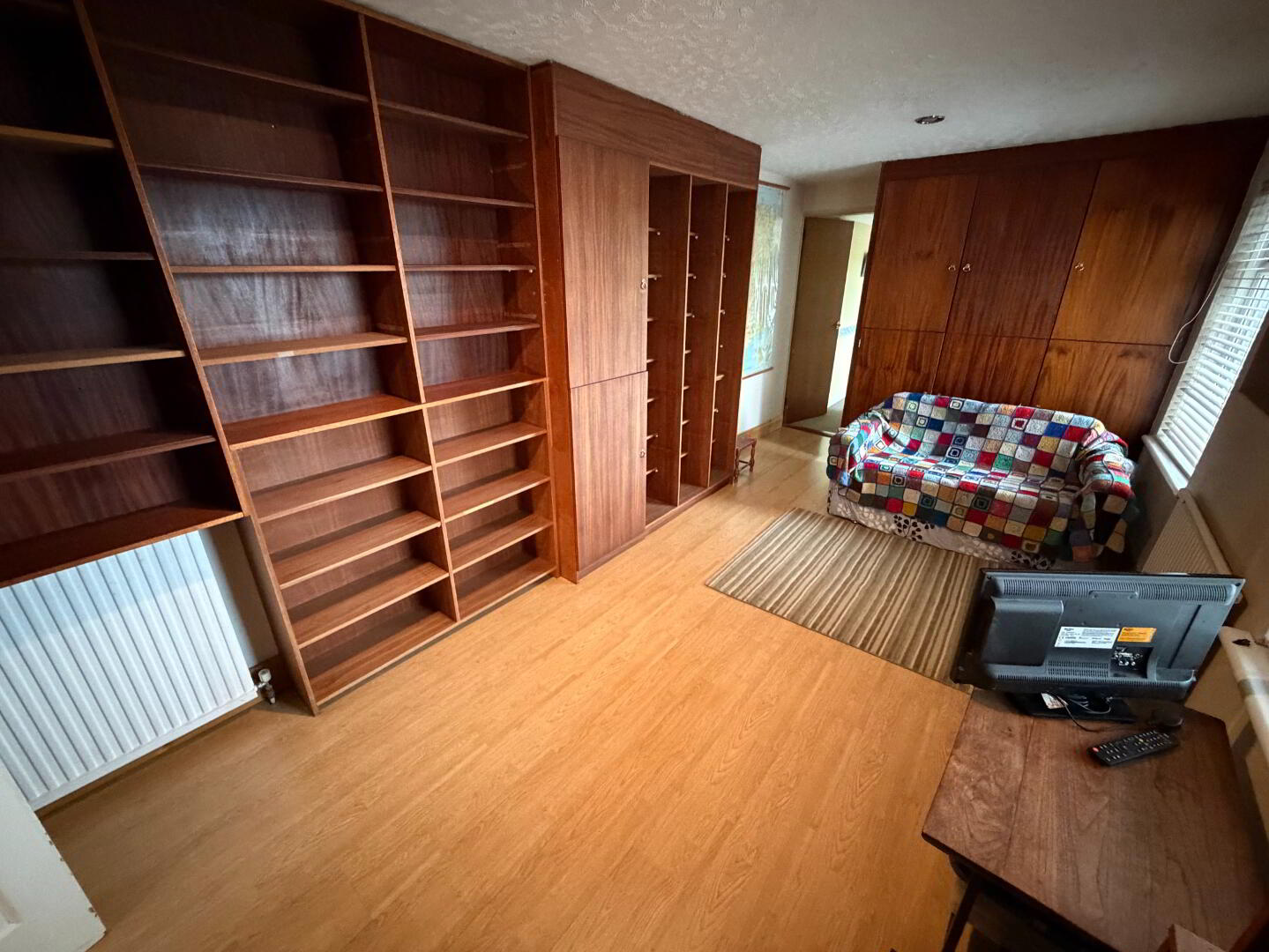 Versatile first-floor room with wood-effect flooring and built-in storage units. Can be used as a bedroom, home office, or playroom.