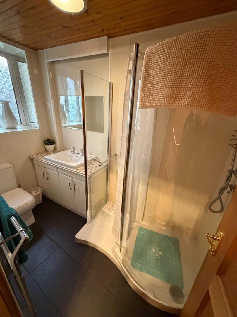 Family bathroom with a modern three-piece suite including a large walk-in shower, wash hand basin with vanity unit, and WC. Tiled flooring and pvc wall panelling.