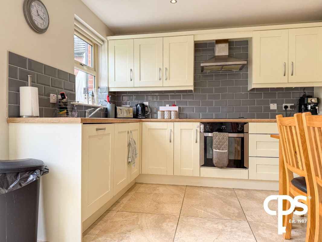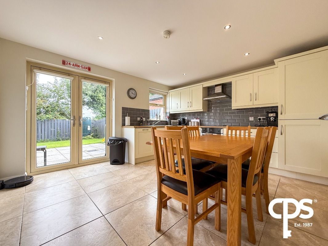 Modern tiled flooring throughout, with a range of high and low units, integrated fridge freezer, induction hob, and stainless-steel sink. Ample space for dining with easy access to the rear garden.
