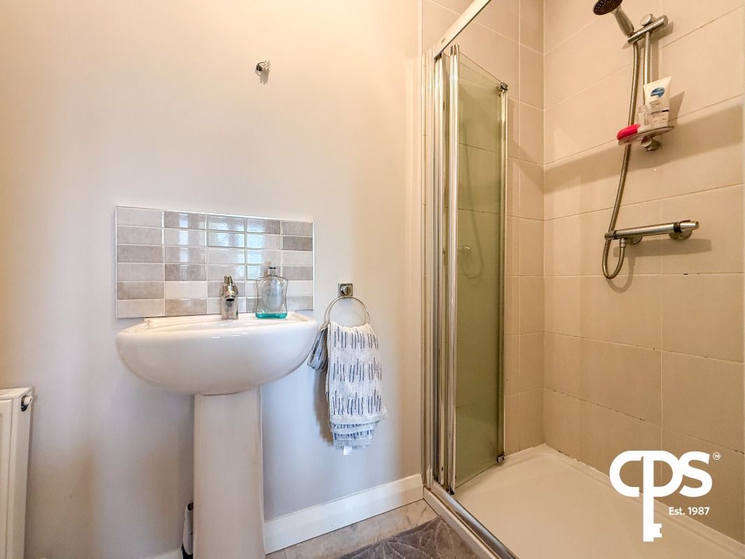 En-suite – 1.09m x 2.67m: Laminate flooring, power shower, toilet, and sink.