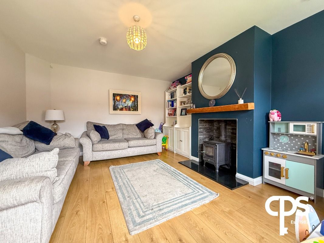 A bright front-facing living space with wooden flooring, wood-burning stove, natural stone cladding, and exposed timber beam — a cosy yet stylish setting for family gatherings.