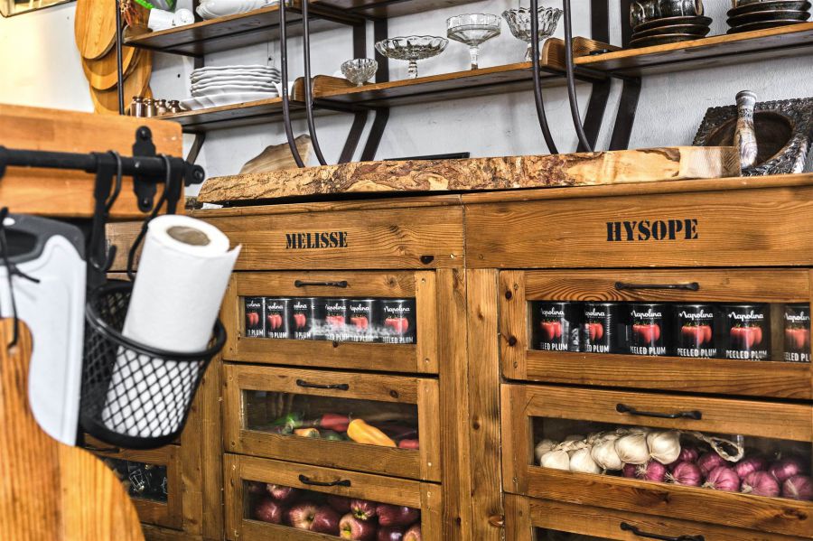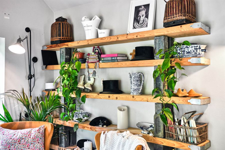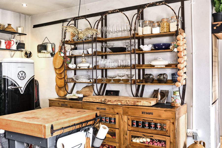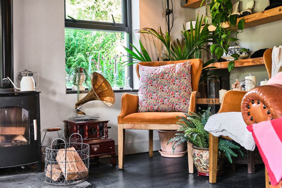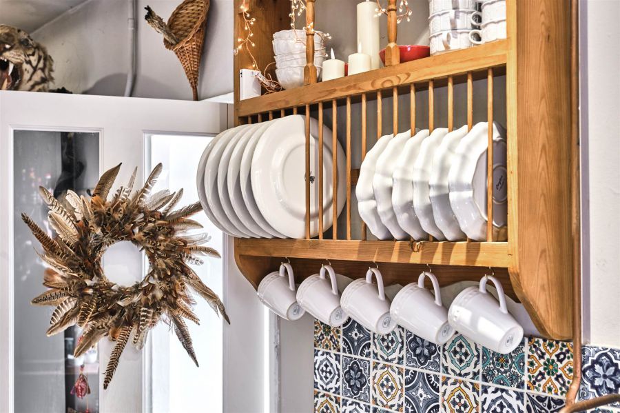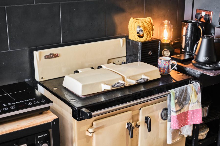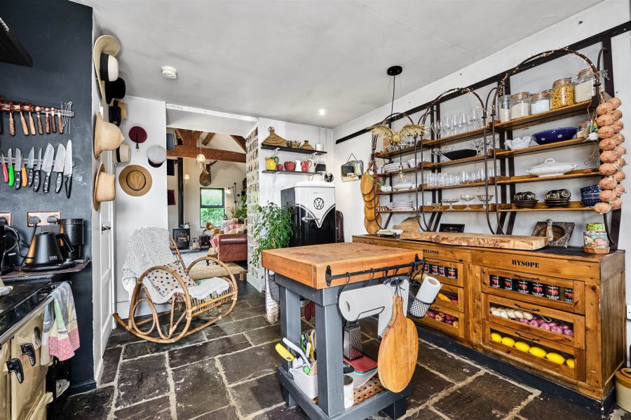 With plumbed for sink unit with tiling above, integrated "Rayburn" range with tiled surround, black extractor fan above, space for fridge, shelving units, plate racks and mug hooks, brass finished dimmer control panel, hot press, recessed lighting, tiled floor and open plan through to lounge/dining area.