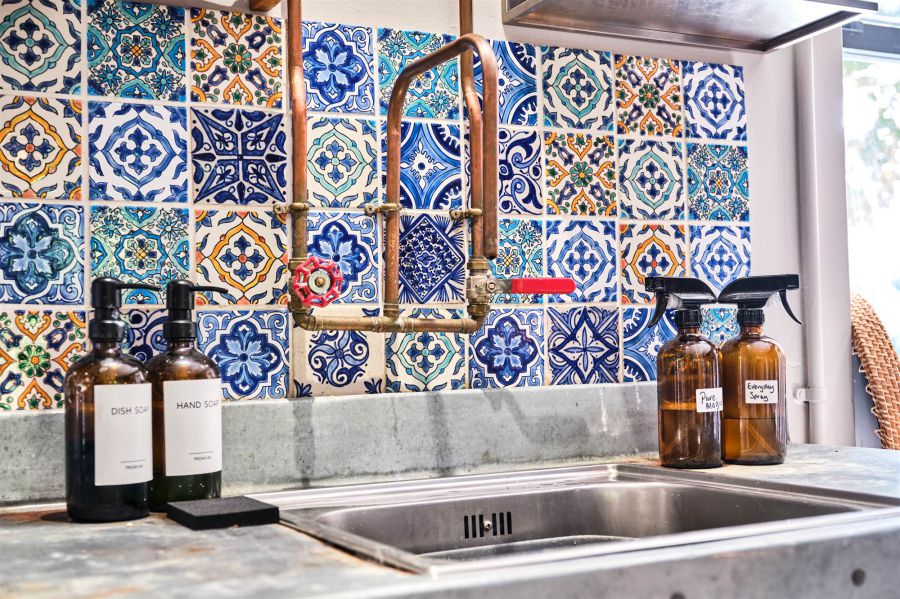 With "Belfast" style sink, high and low level built in units, plumbed for slimline dishwasher, shelving unit, storage area and tiled floor.