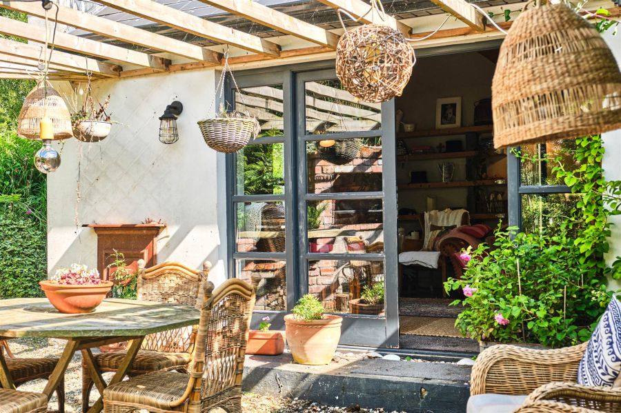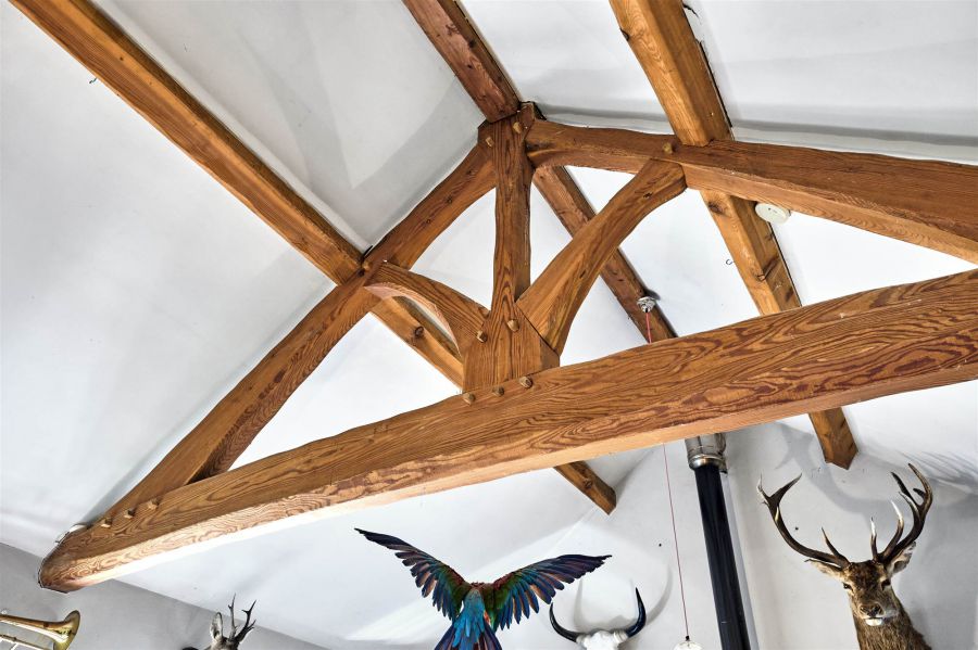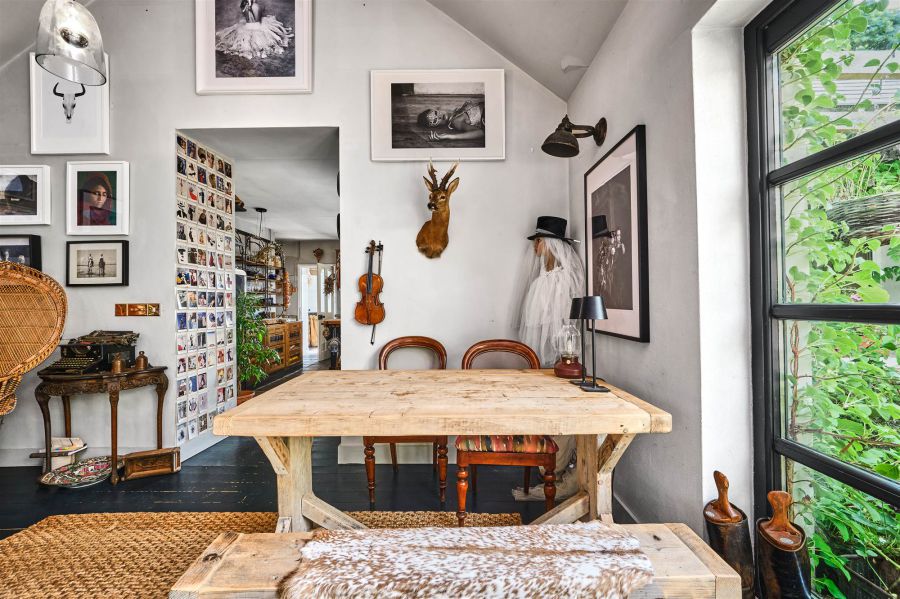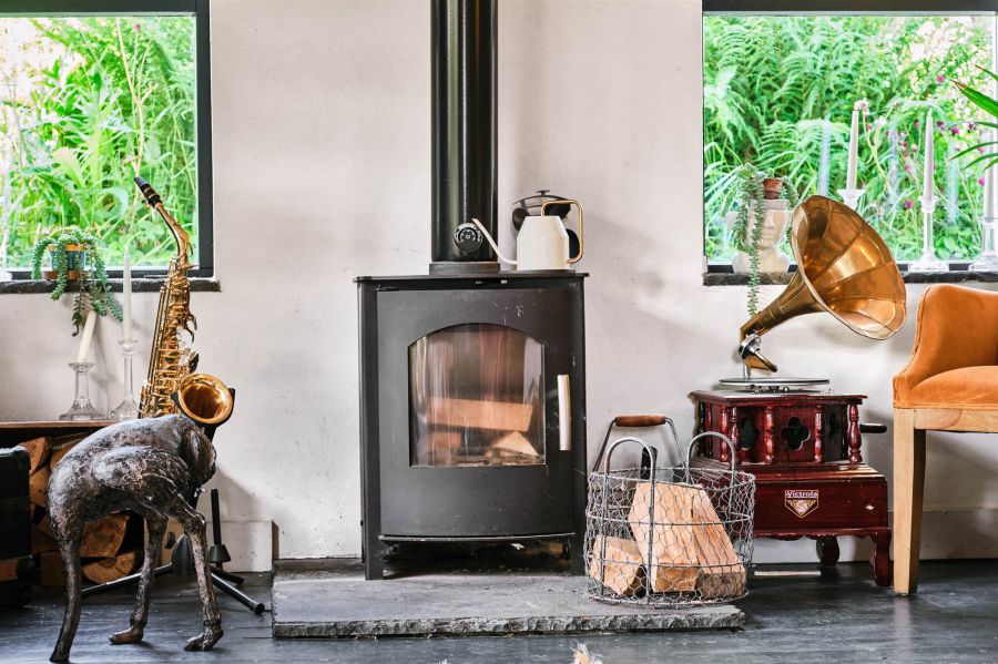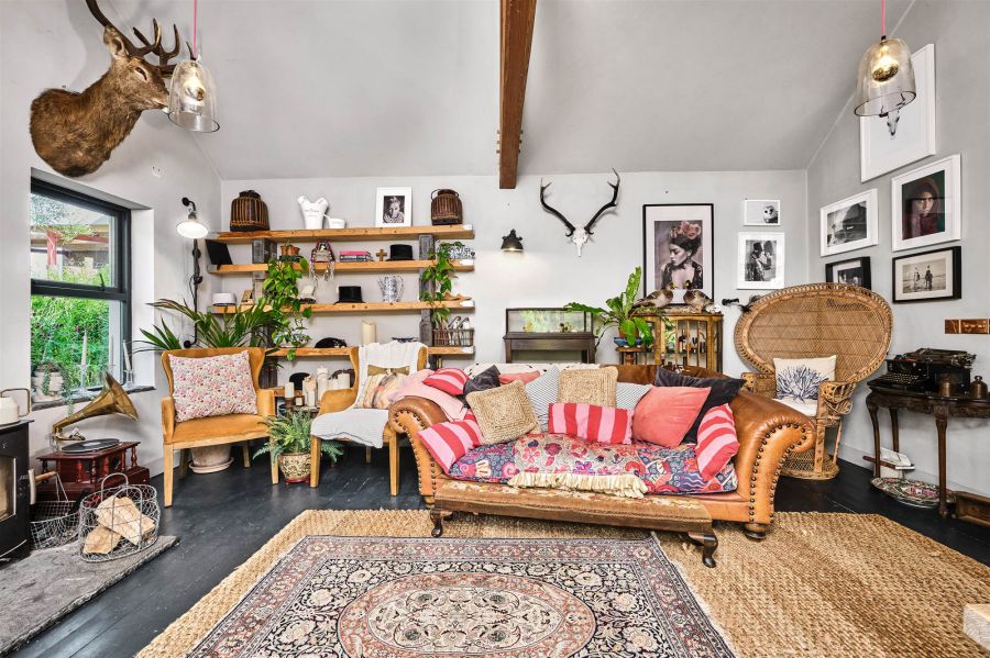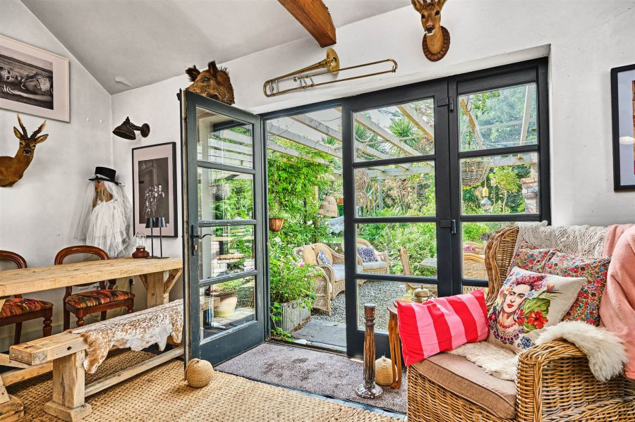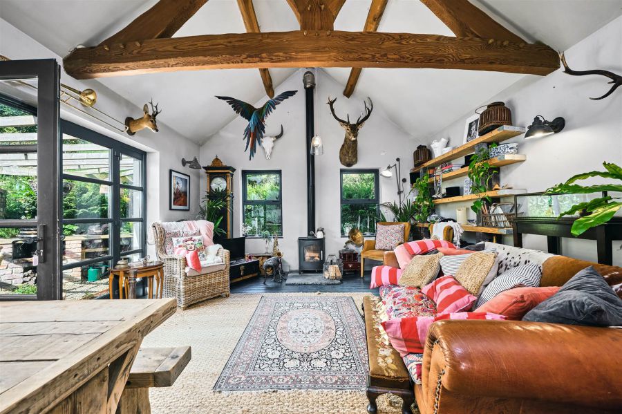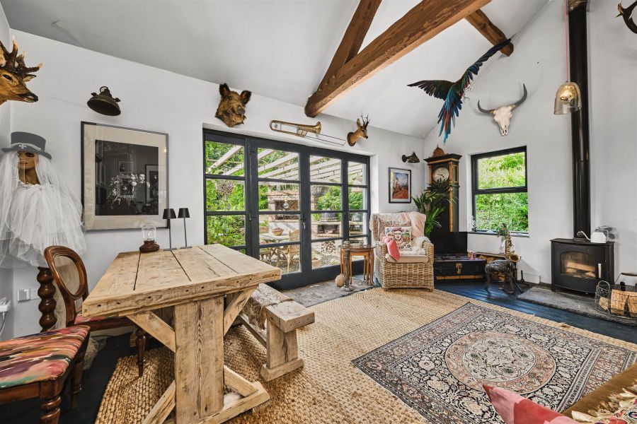 With log burner with slate hearth, shelving unit, feature beamed ceilings, brass finished dimmer control panel, wired for wall lights, solid wood floor and wood framed double glazed French doors with glass panels to side leading to rear garden.
