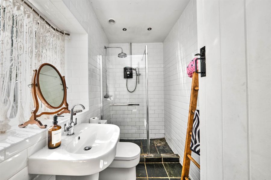 With white suite comprising w.c., wash hand basin, fully tiled walk in shower area with mains rainfall shower head with telephone hand shower, fully tiled walls, recessed lighting, extractor fan, electric under floor heating and tiled floor.