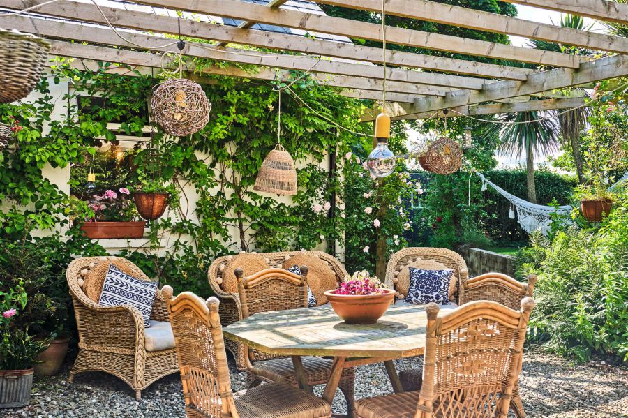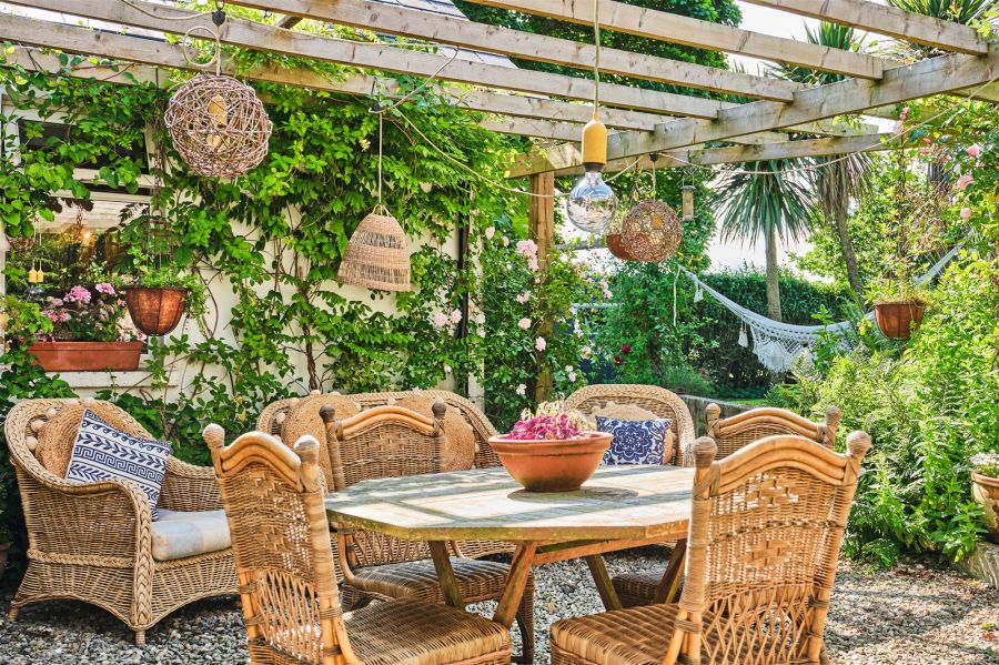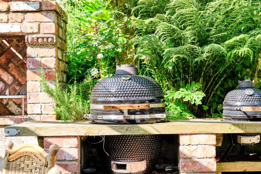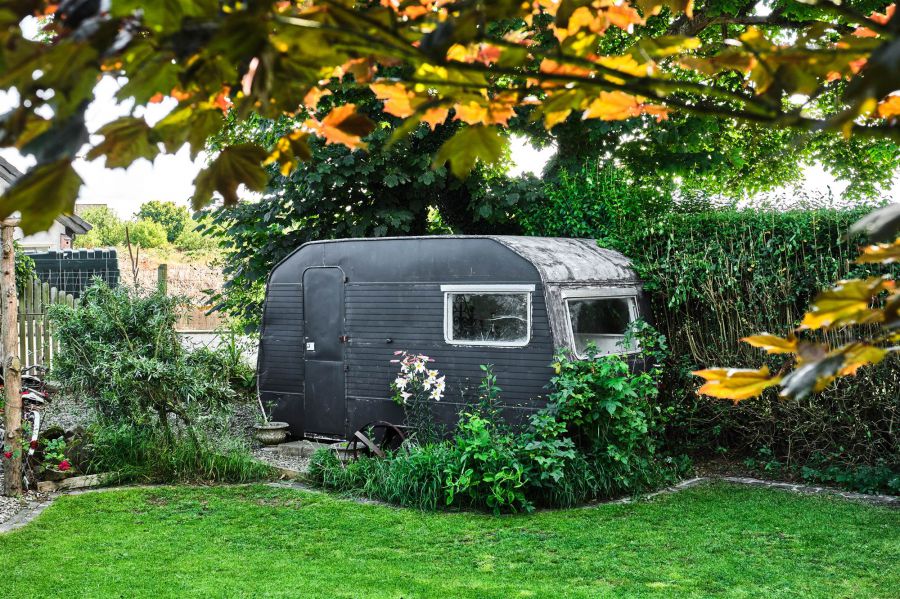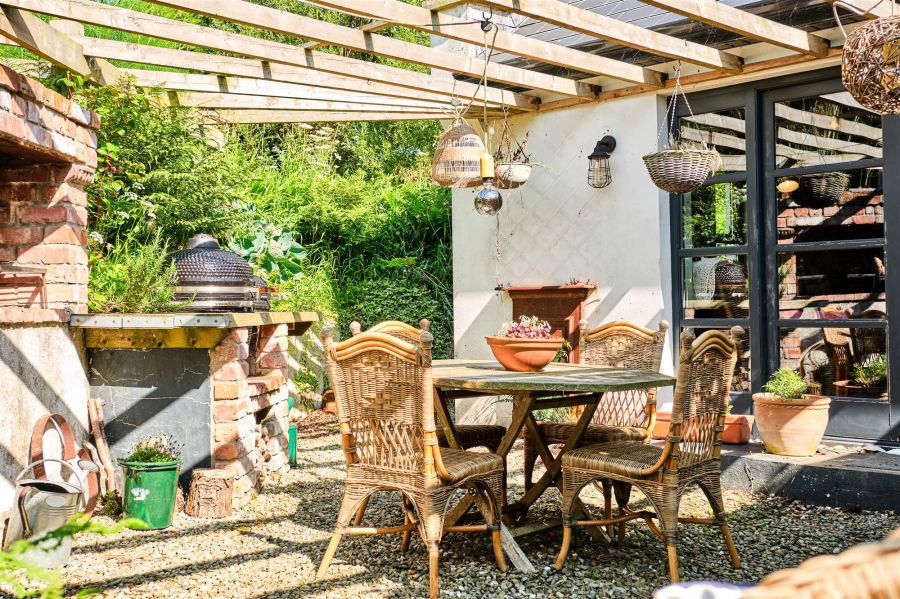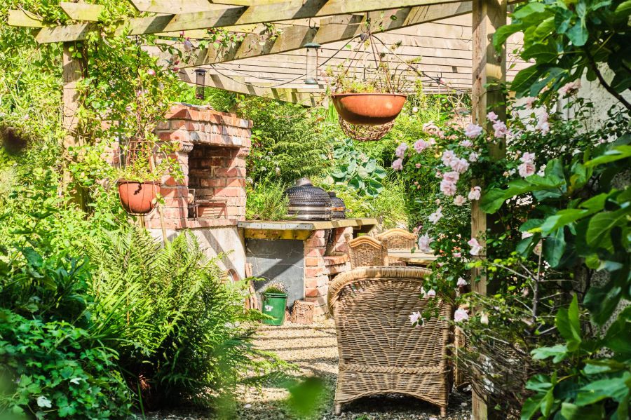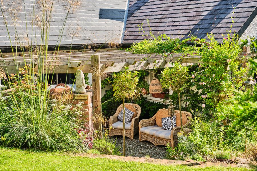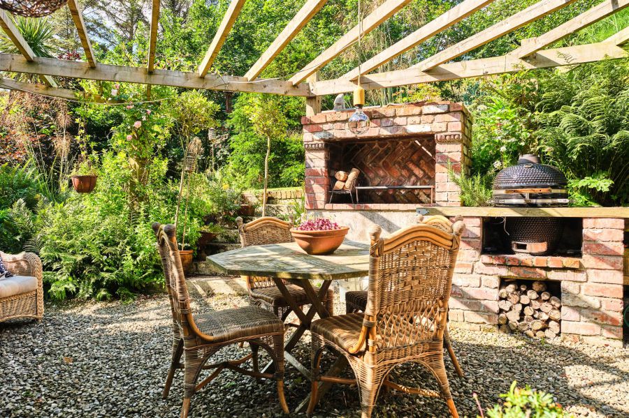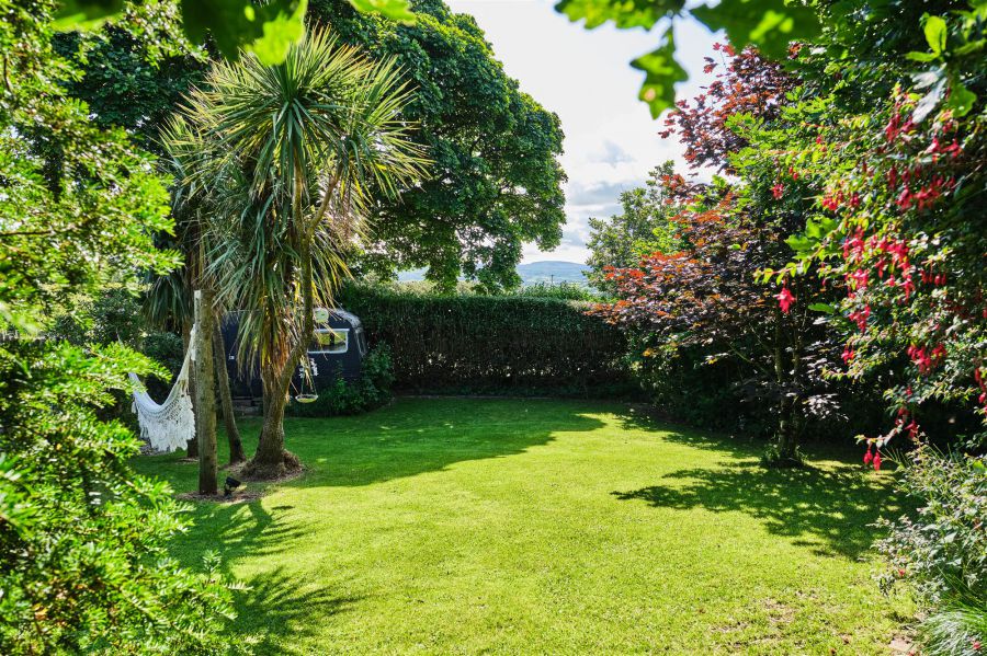 Garden to rear is fenced with screened area surrounding property with steps to elevated lawned area and feature beamed Pergola over outside kitchen. With brick built BBQ area with solid wood worktop with storage below and additional recessed brick fire pit. Caravan to rear 10"5 x 6"0 with stainless steel sink unit with storage below, electric points and solid wood floor. Gardens are surrounded by extensive selection of well established trees, hedging and shrubbery. Elevated flowerbed and outside toilet. Light to front and rear. Tap to side. Electric charging facility for E.V.