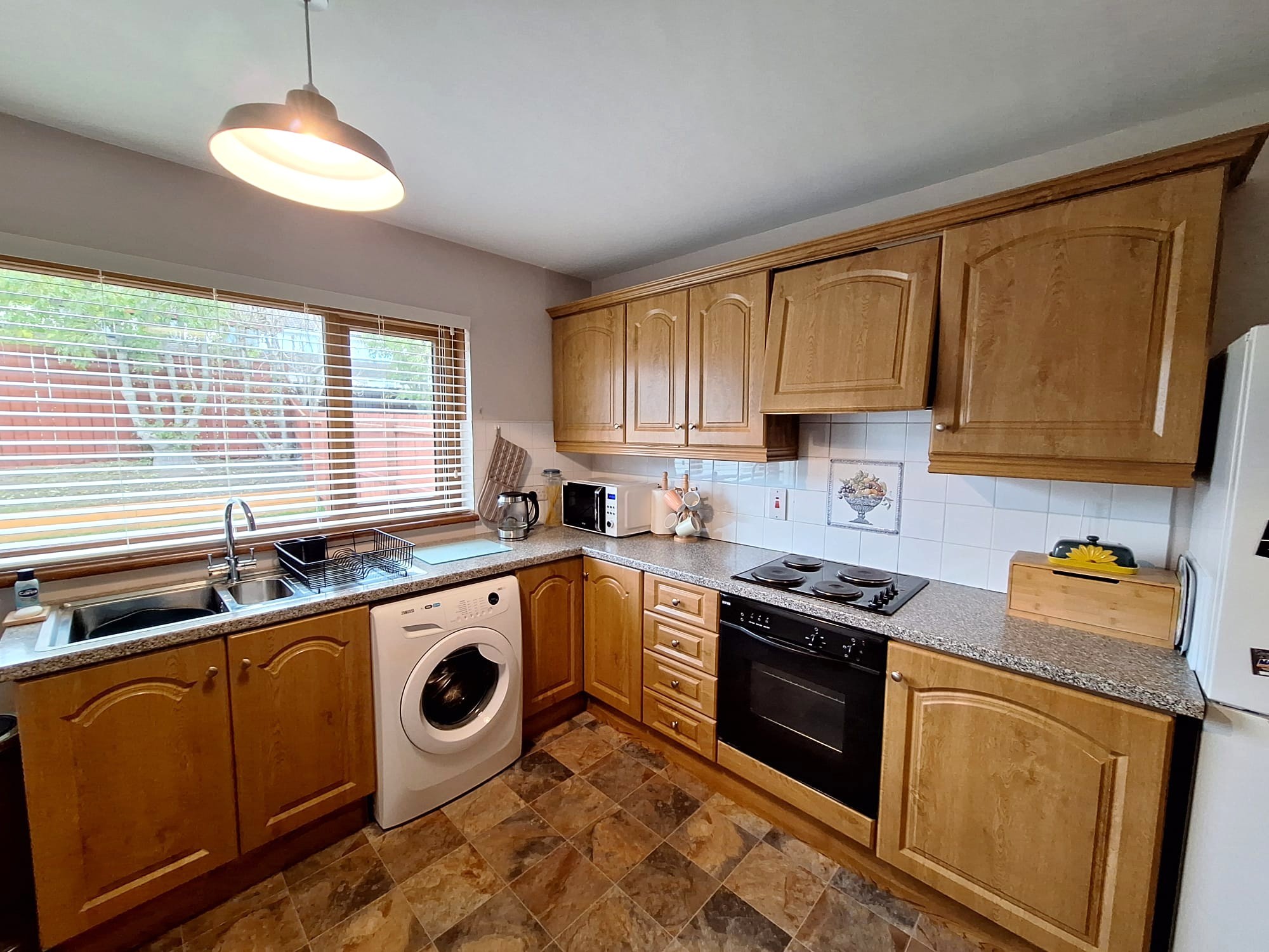 With eye and low level units, bowl and a half stainless steel sink unit, tiled between the worktops and the eye level units, extractor fan, glass panel door, plumbed for an automatic washing machine, "Ignis" electric oven and "Whirlpool electric hob".