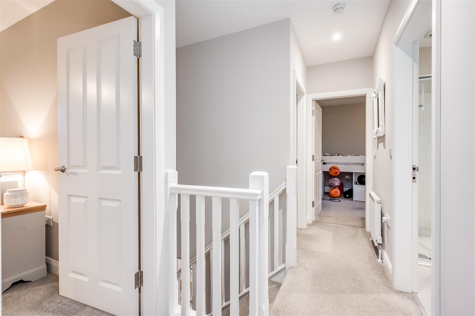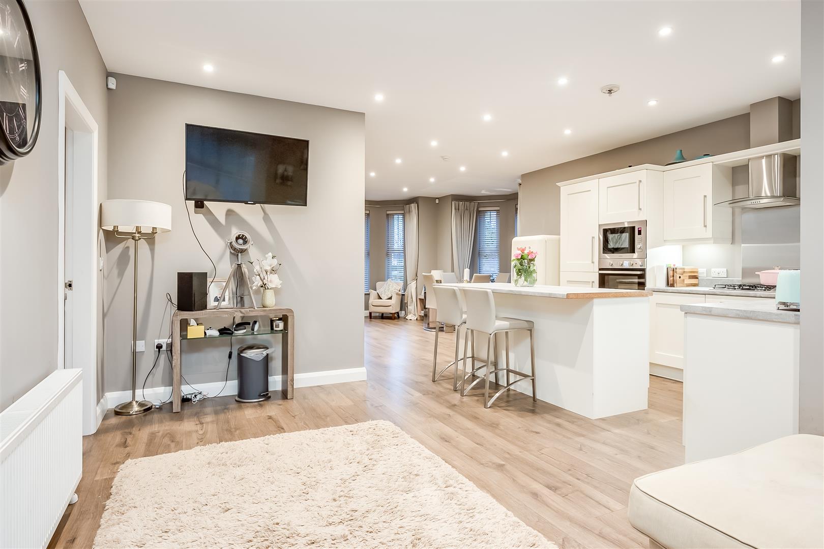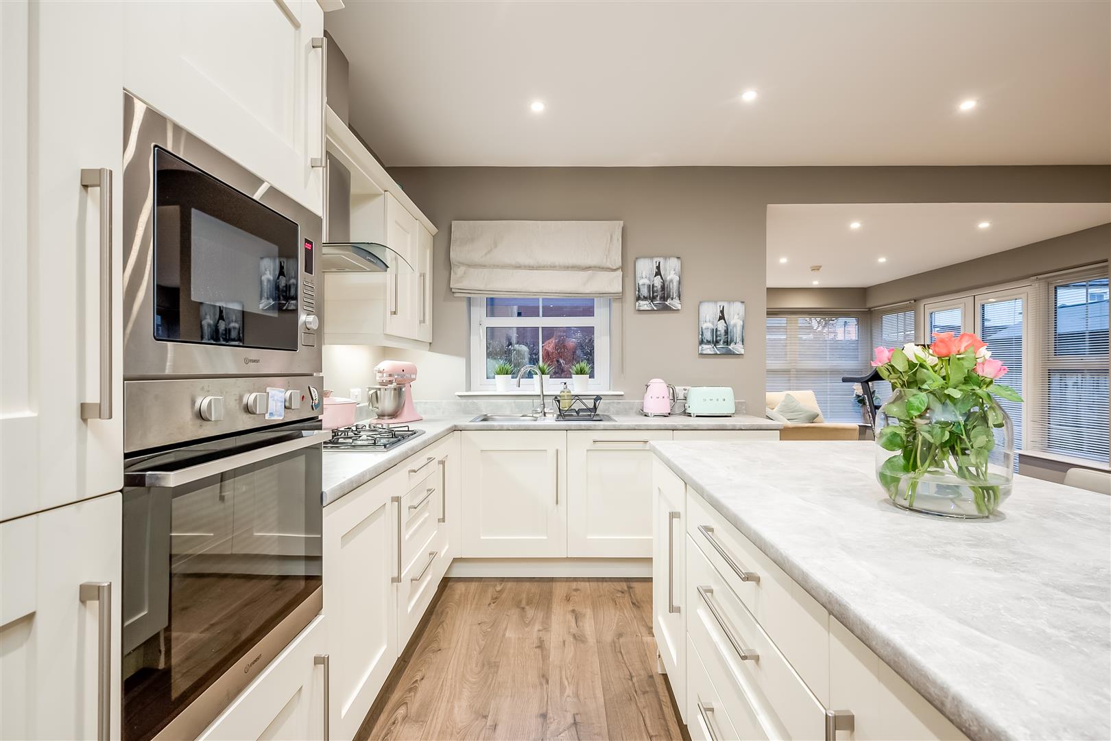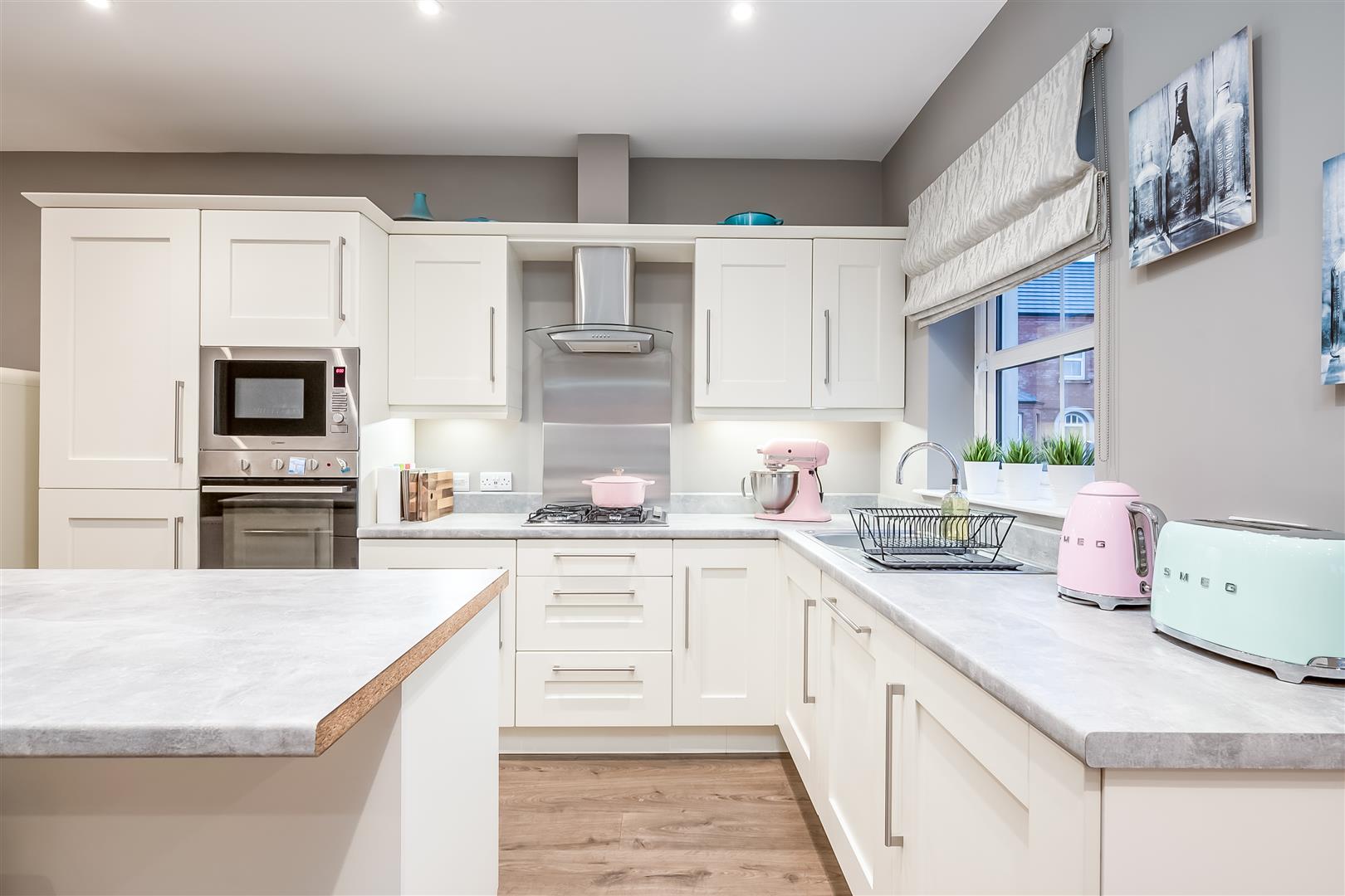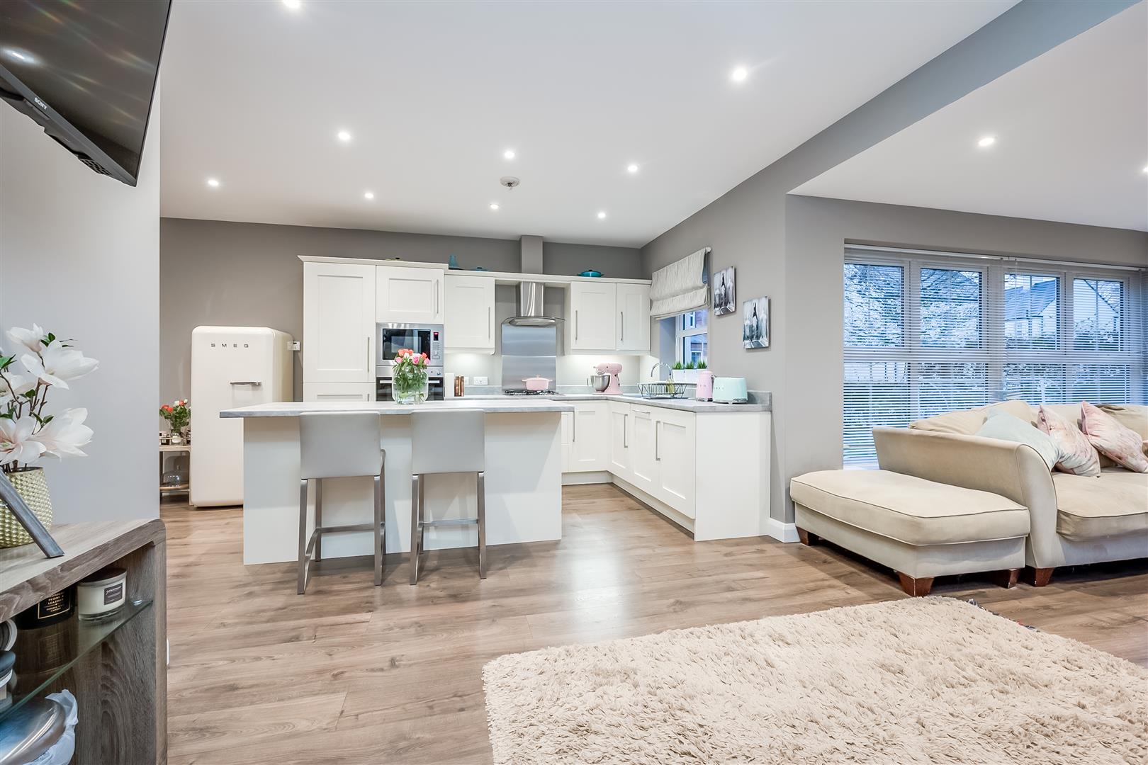 Modern fitted kitchen with range of high and low level storage units, with contrasting stone effect melamine work surface. Matching island unit with breakfast bar area. Stainless steel sink unit with draining bay. Integrated has hob with stainless steel splash back and extractor hood over. Integrated oven, microwave oven, fridge freezer and dishwasher. Wood laminate floor covering. Dual aspect windows. Bay windows to front and side elevations, enjoying views towards landscaped green.