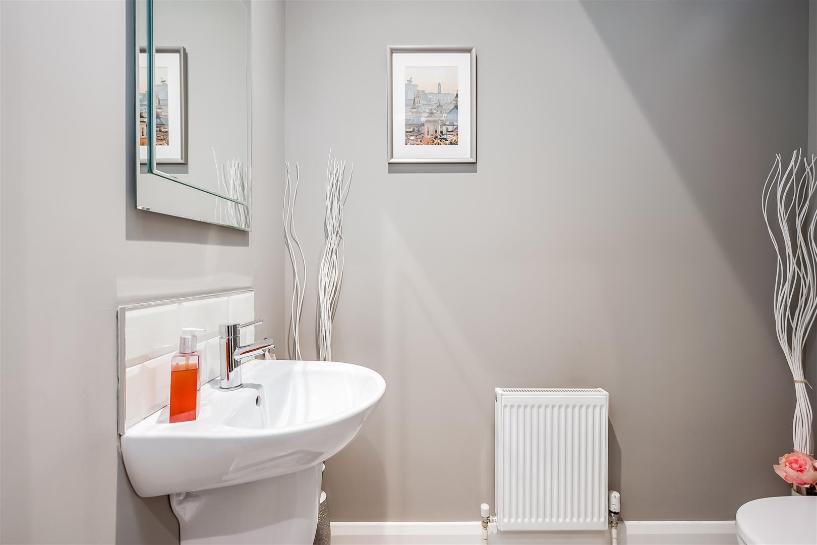 Contemporary, white, two piece suite comprising semi pedestal wash hand basin and WC. Splash back tiling to sink. Tiled floor.
