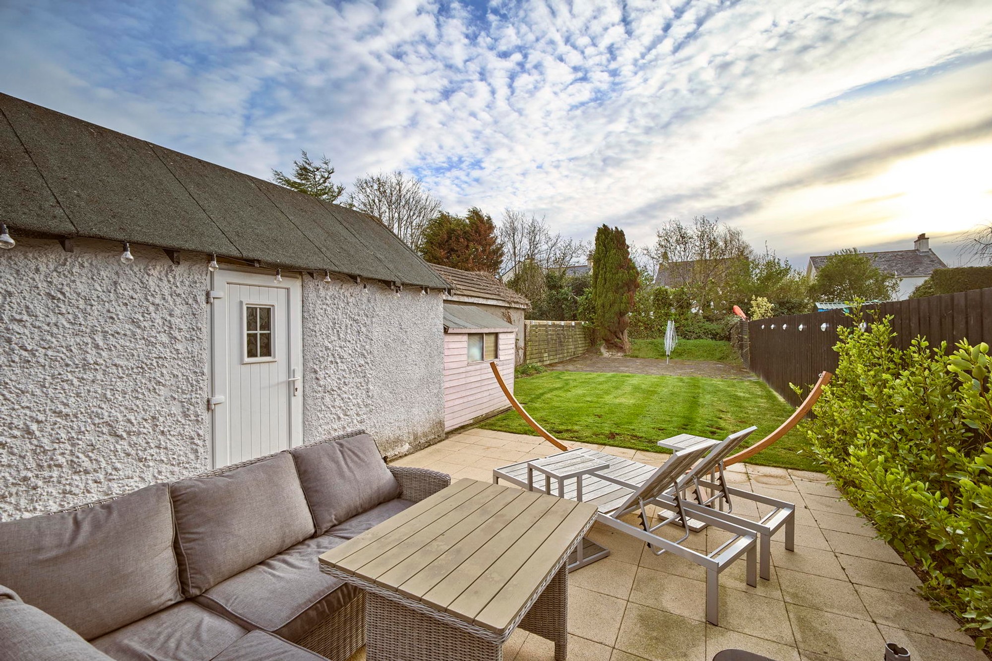 Outside a detached garage is apart of a generous enclosed rear which also offers lawns and patio area.