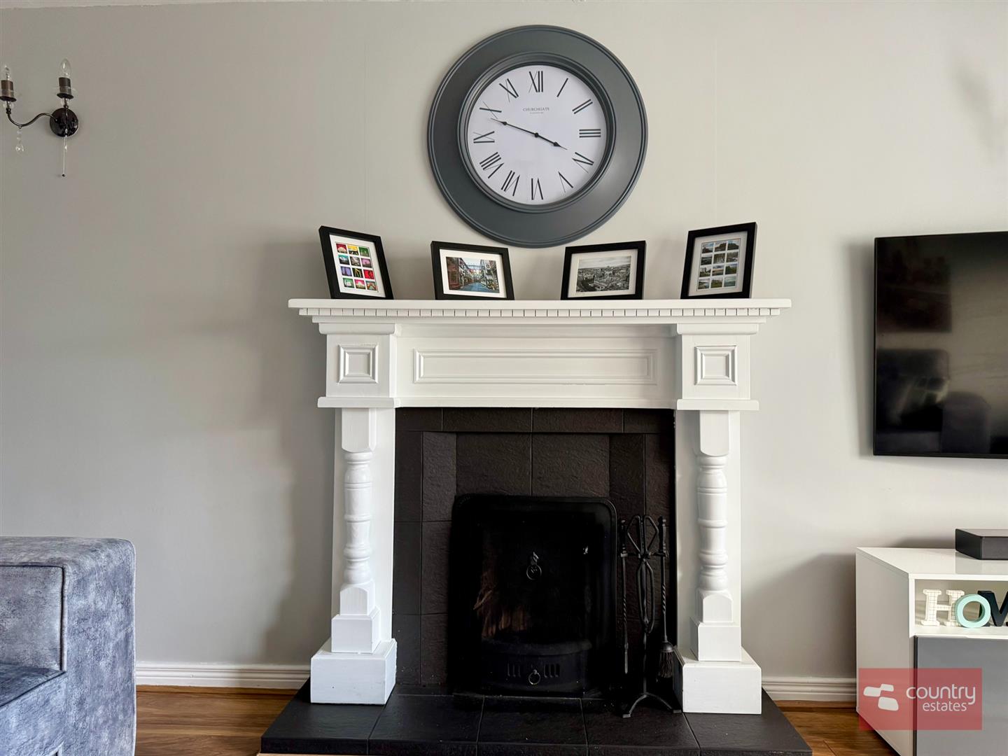 Into bay window Attractive. Period Style fireplace with tiled slate inset with matching hearth and painted wooden surround. Quality walnut effect laminate plank flooring.