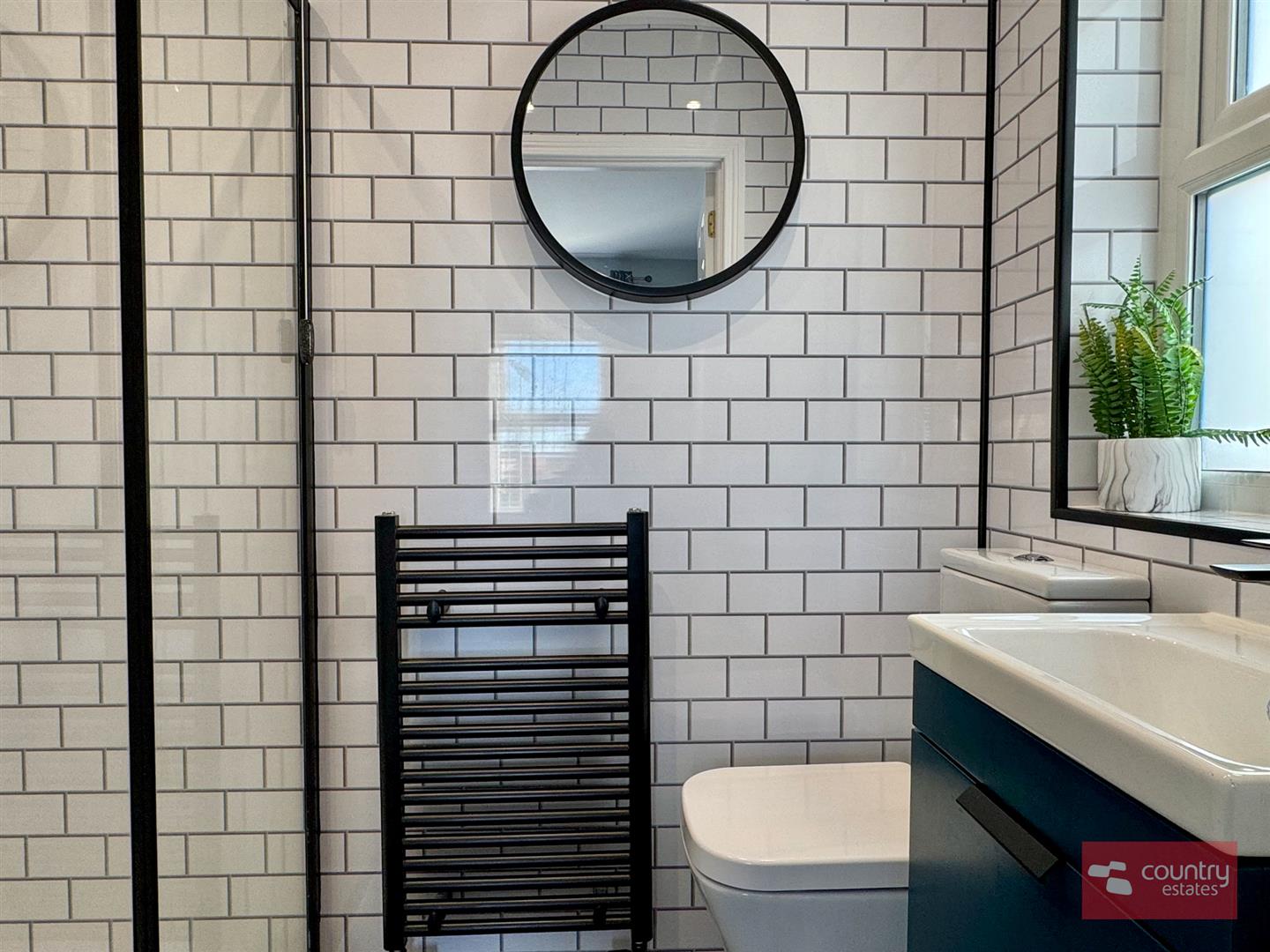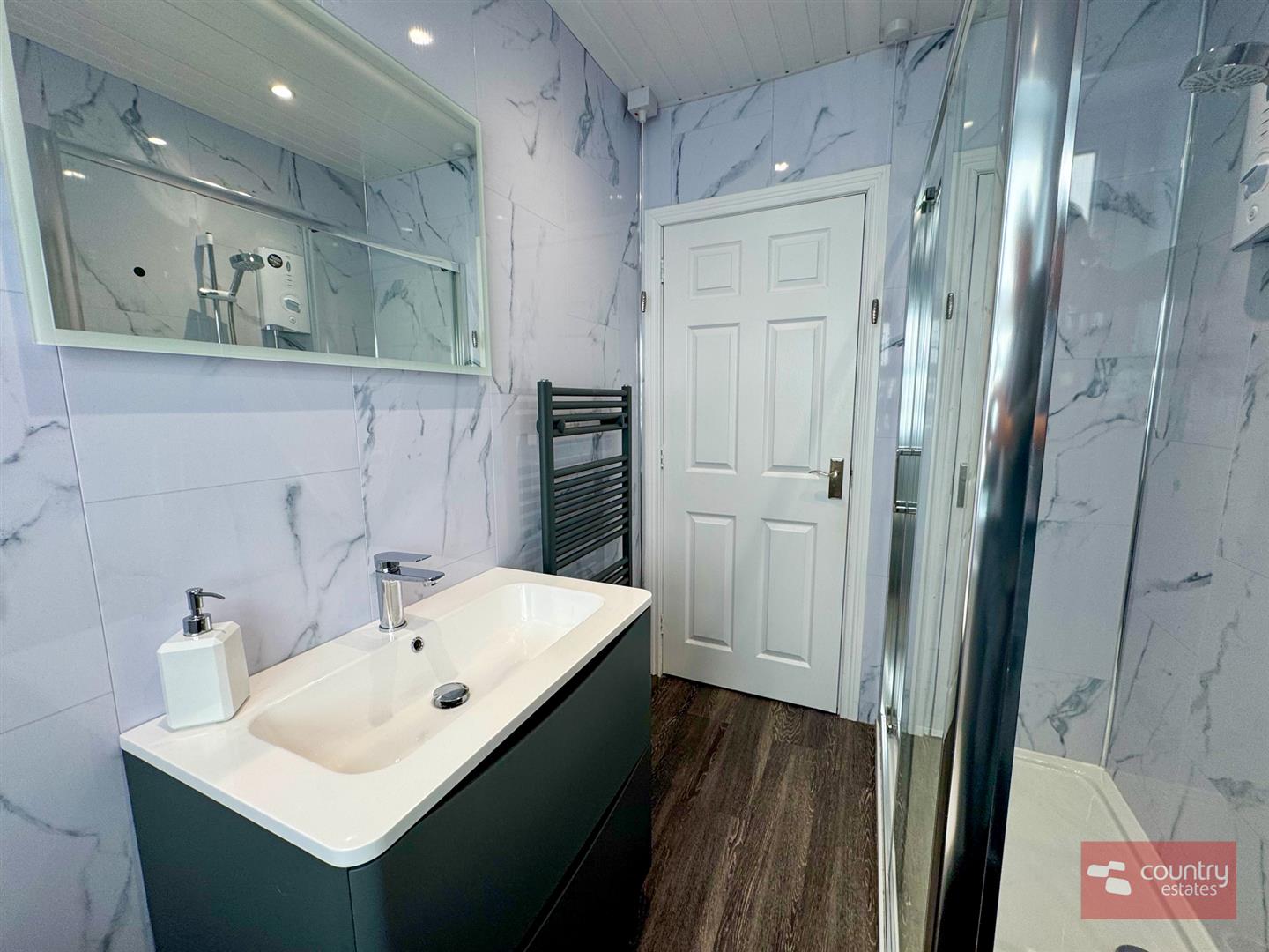 Comprising button flush wc, modern vanity unit with monobloc tap and large shower enclosure with electric shower unit. Tile effect PVC panelled walls. PVC panelled ceiling with recessed low voltage lighting.