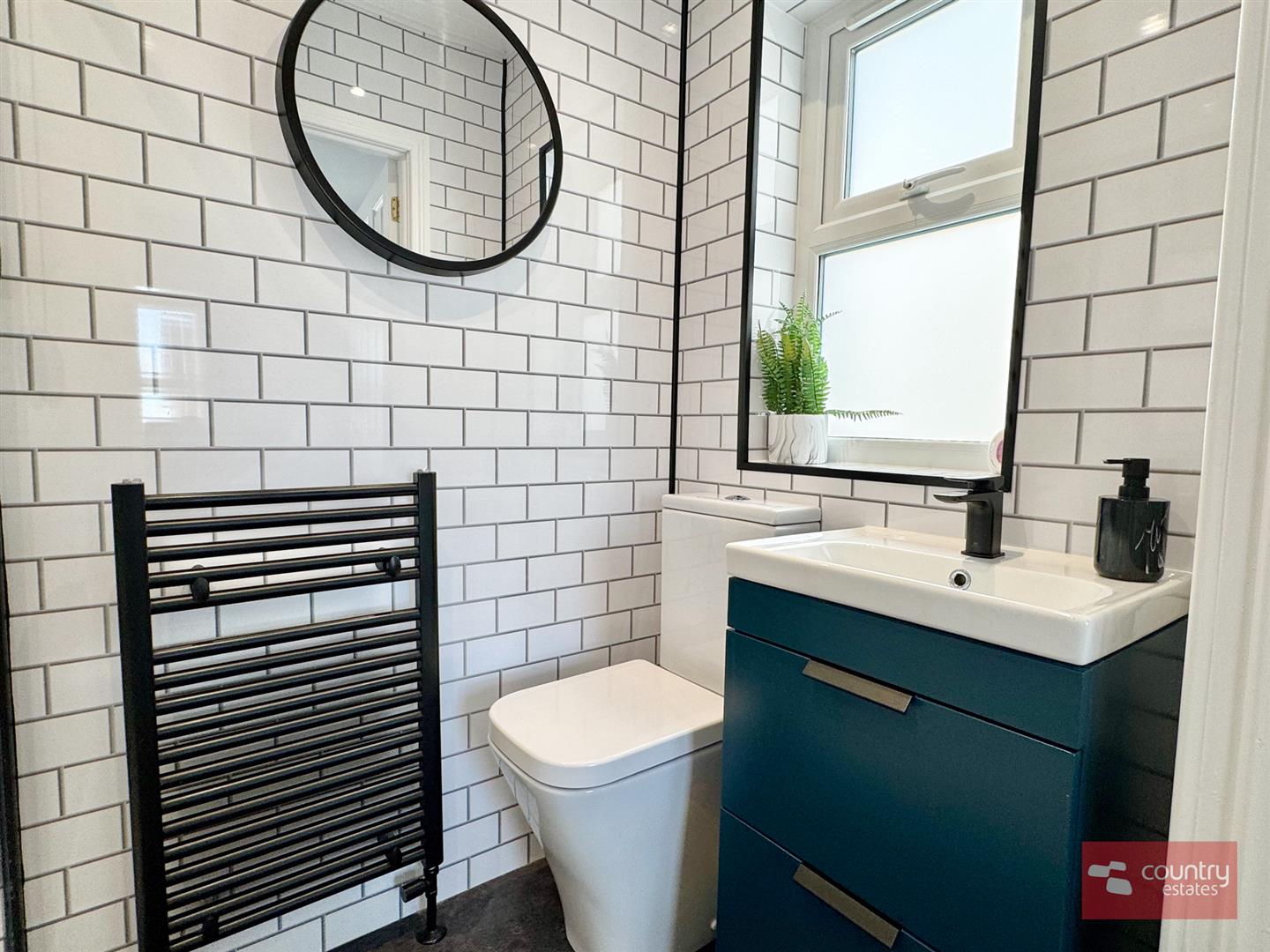Comprising button flush w.c and pedestal wash hand basin with tiled splashback.