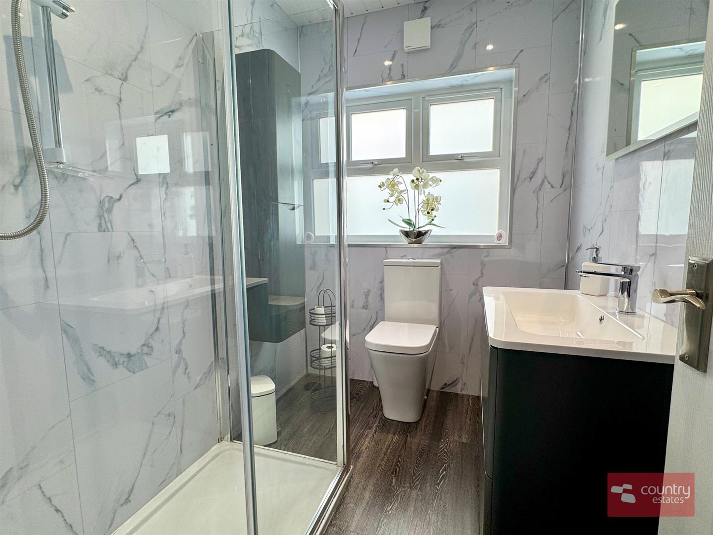 Comprising button flush wc, modern vanity unit in graphite grey finish with monbloc tap, fitted mirror with LED sensor operated light and large double shower enclosure with electric shower unit. Marble effect PVC wall panelling. PVC panelled ceiling with low voltage recessed lighting.