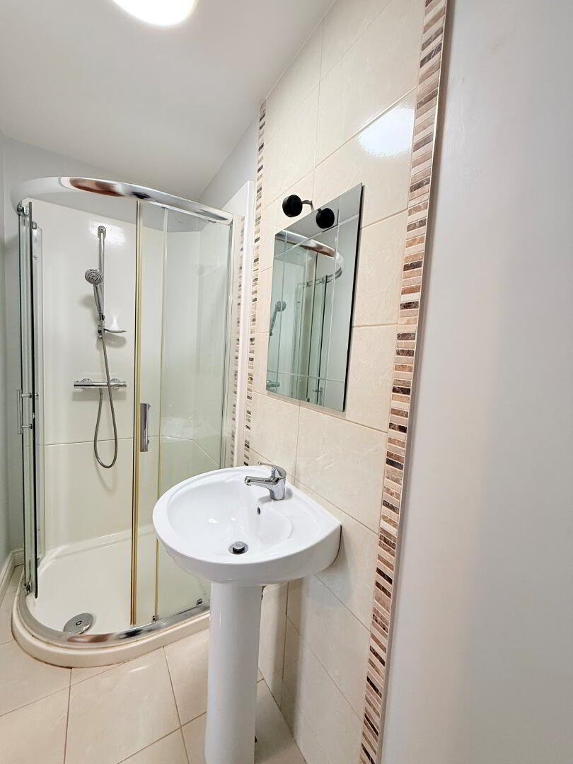 Low flush wc, pedestal wash hand basin, quadrant shower cubicle with thermostatic shower, tiled flooring, part tiled walls, radiator