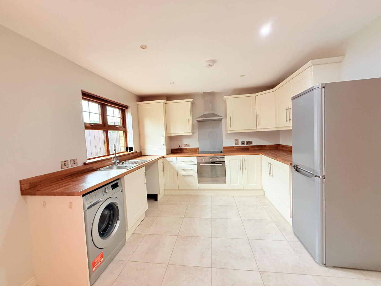 Modern shaker eye and low level units, under unit lighting, electric oven, hob and stainless steel extractor hood,, wood block effect work surface with matching upstand, plumbed for washing machine, space for tumble dryer, space for fridge freezer, stainless steel sink with mixer tap, recessed LED ceiling lighting, uPVC double glazed window and French doors to rear, built in under stairs, storage cupboard