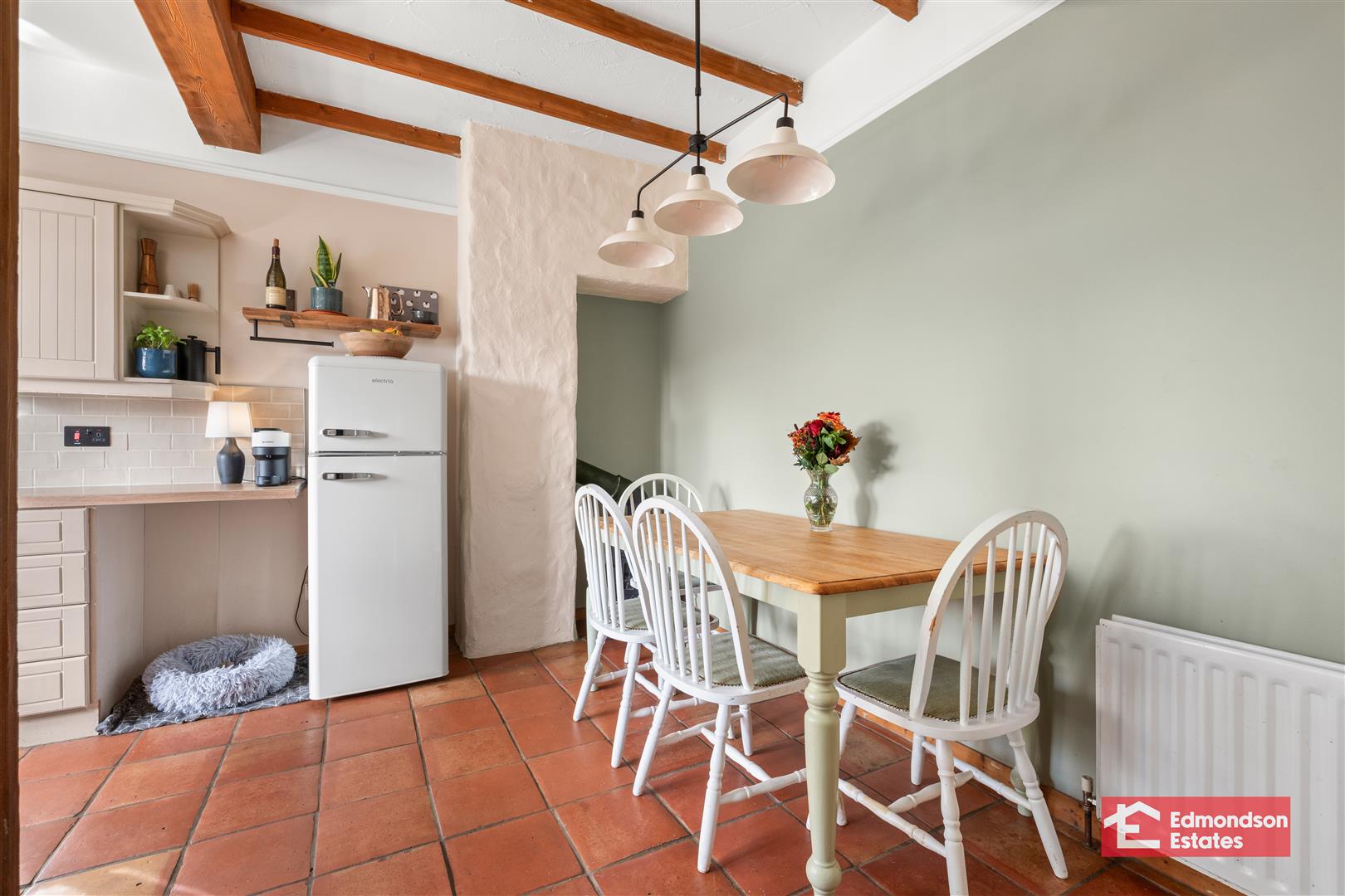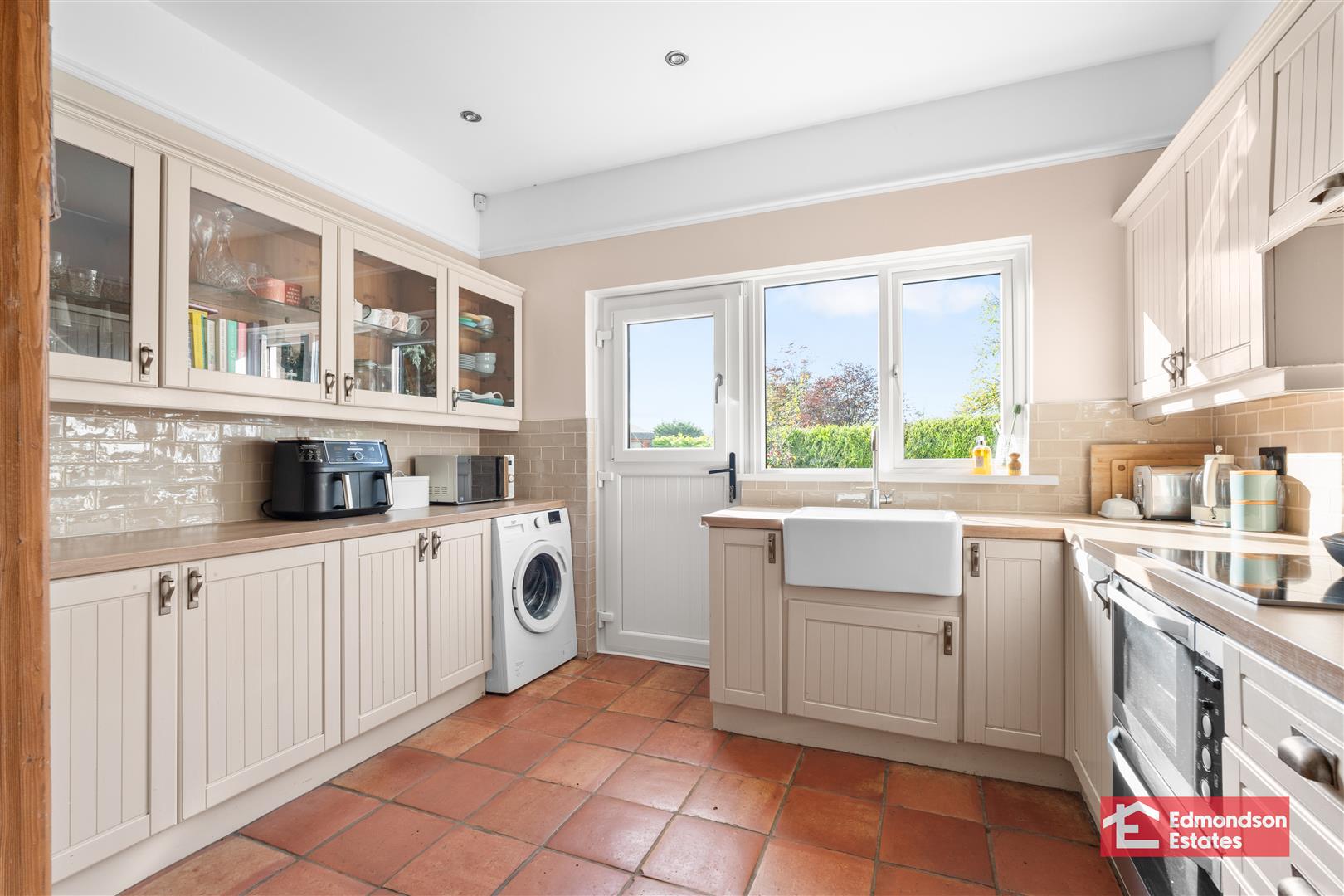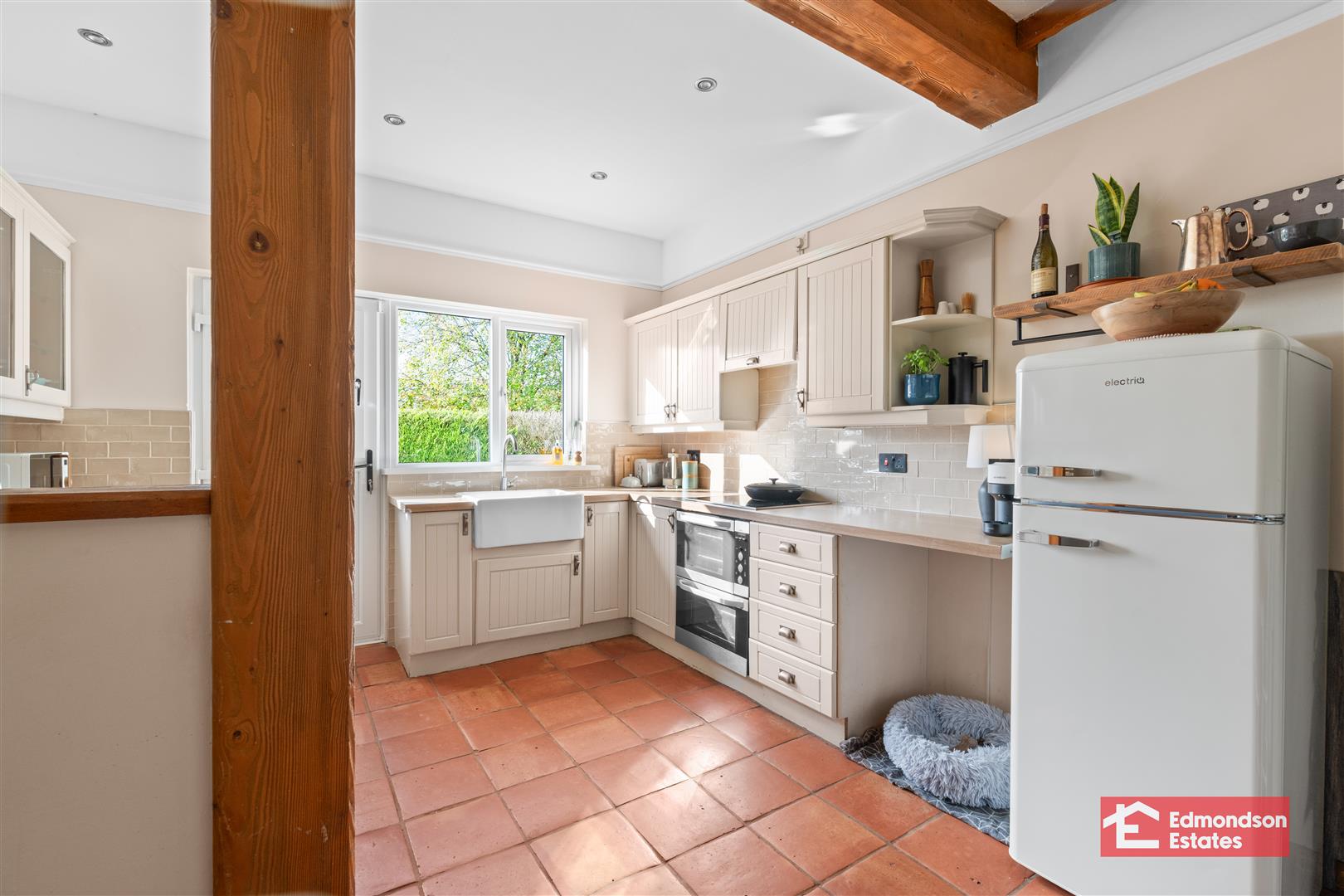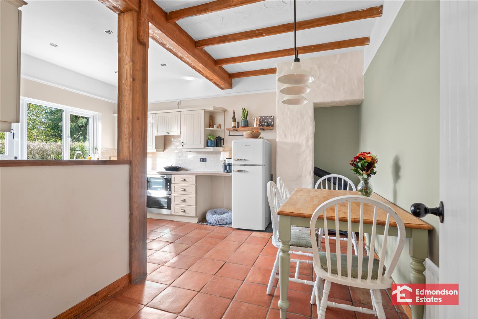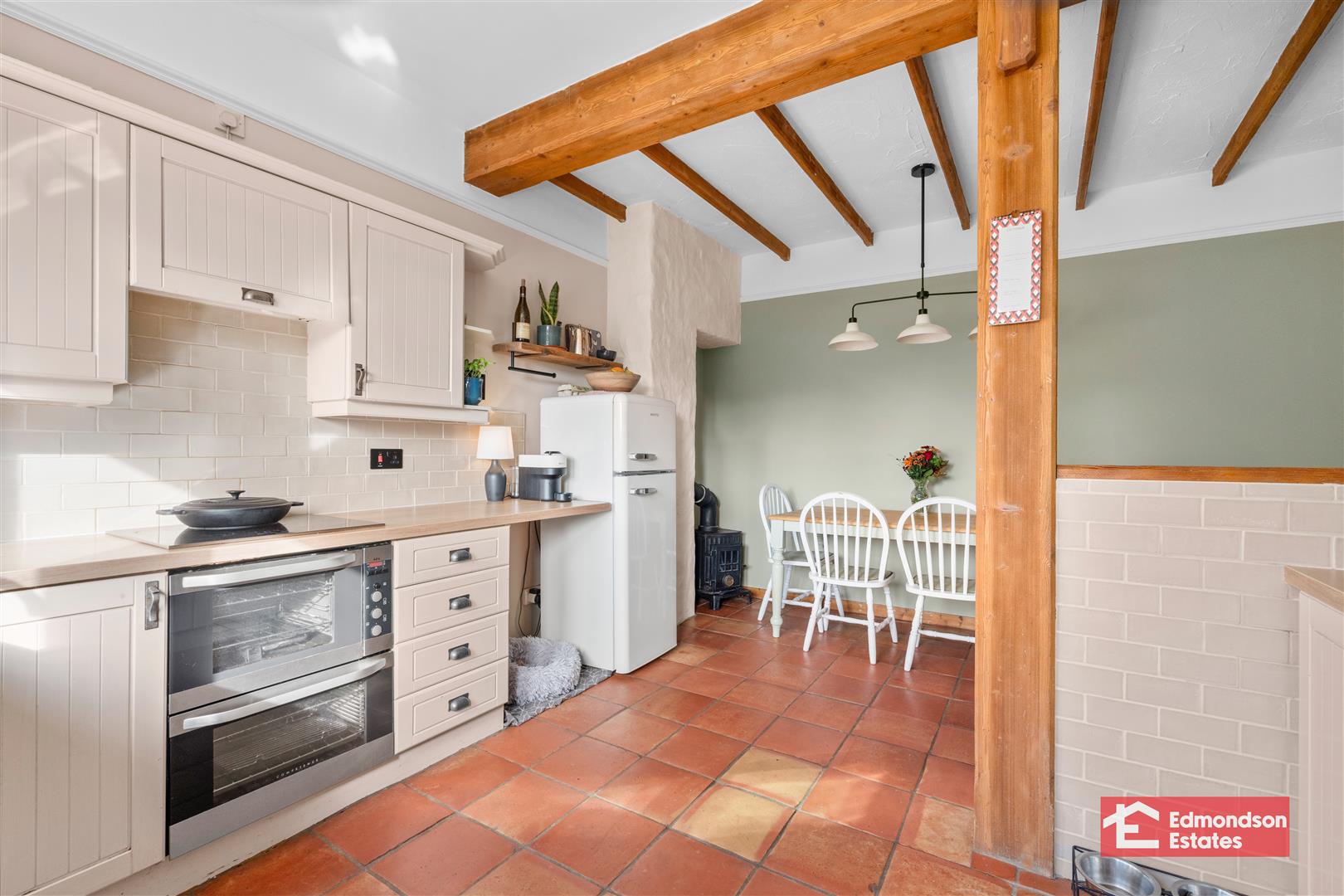 Modern fitted kitchen with high and low level storage units and works surfaces. Belfast sink. Integrated 4 ring hob and oven with extractor fan over. Space for fridge freezer, washing machine and tumble dryer. Glazed display cabinets. PVC double glazed rear door. Part tiled walls and tiled floor. Wood burning stove to dining area.