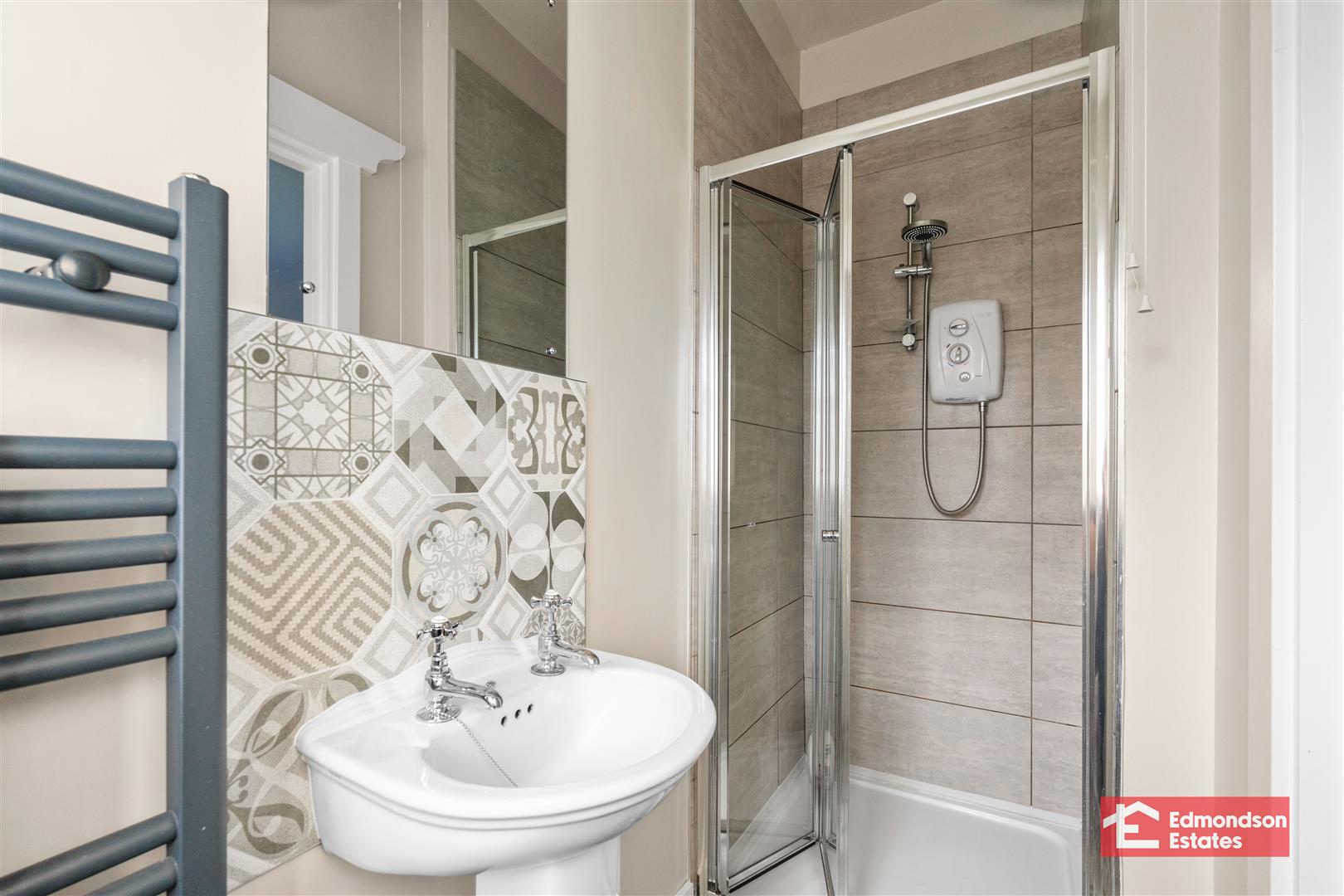 Modern fitted three piece suite comprising shower cubicle with electric shower over, wash hand basin and WC. Fully tiled walls to shower and tiled floor. Towel radiator.