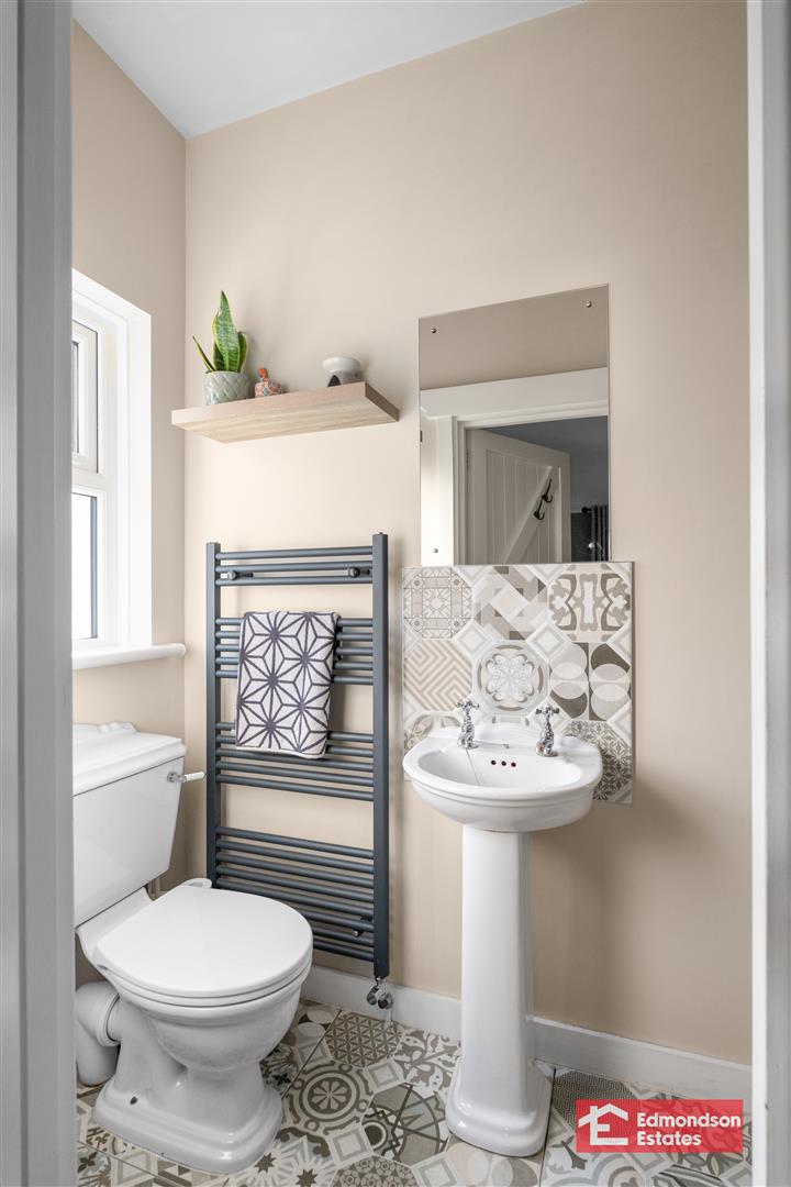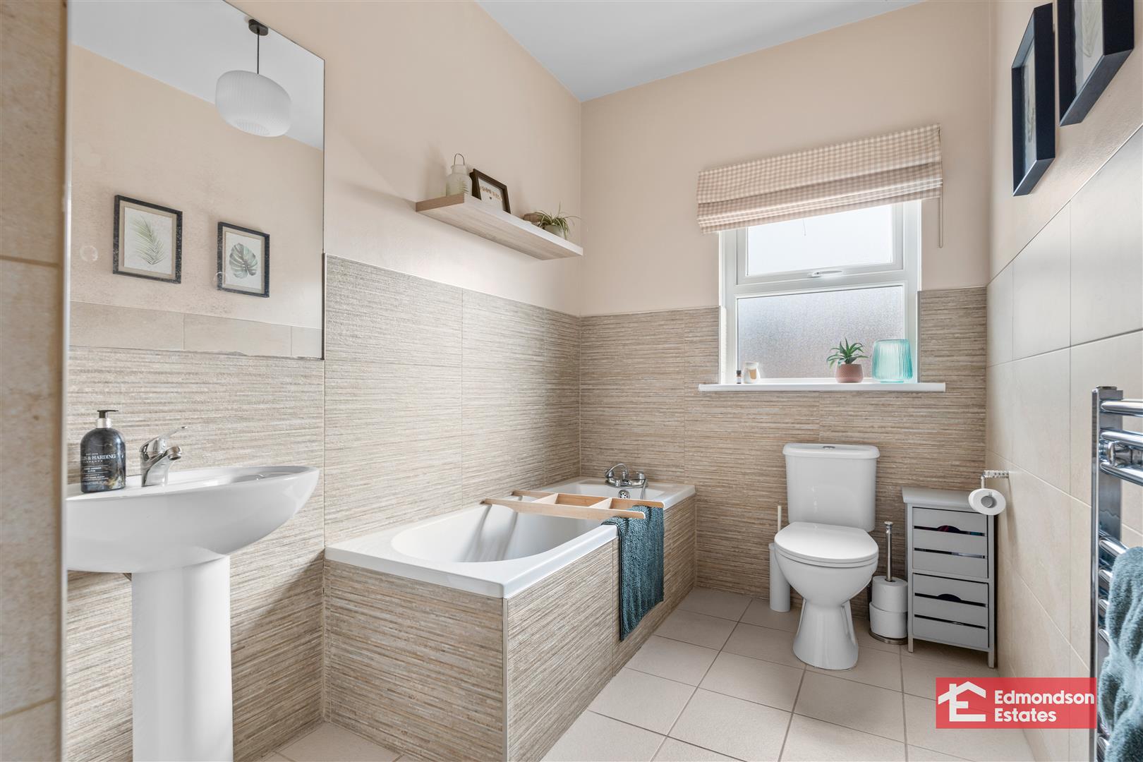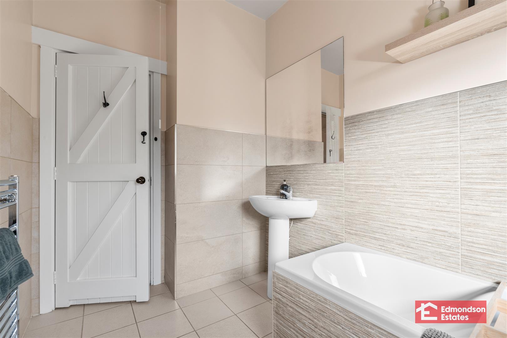 Modern fitted three piece suite comprising bath, wash hand basin and WC. Part tiled walls and tiled floor. Chrome towel radiator.
