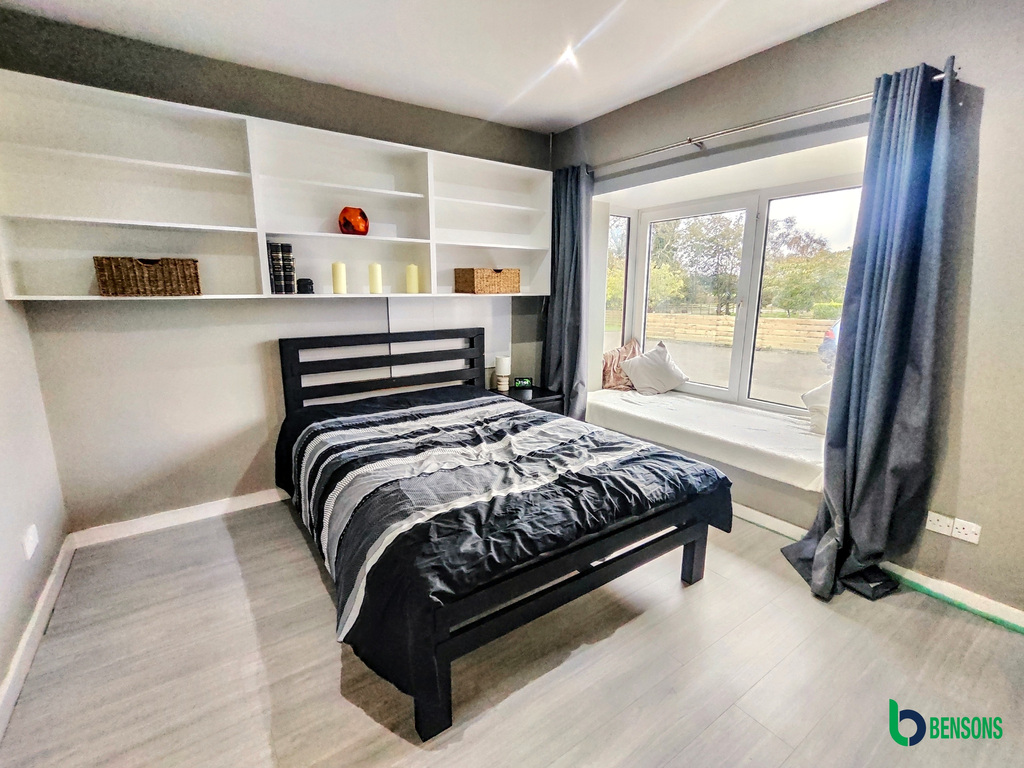 With feature bay window with seating area, built-in units and shelving, recessed lighting.
