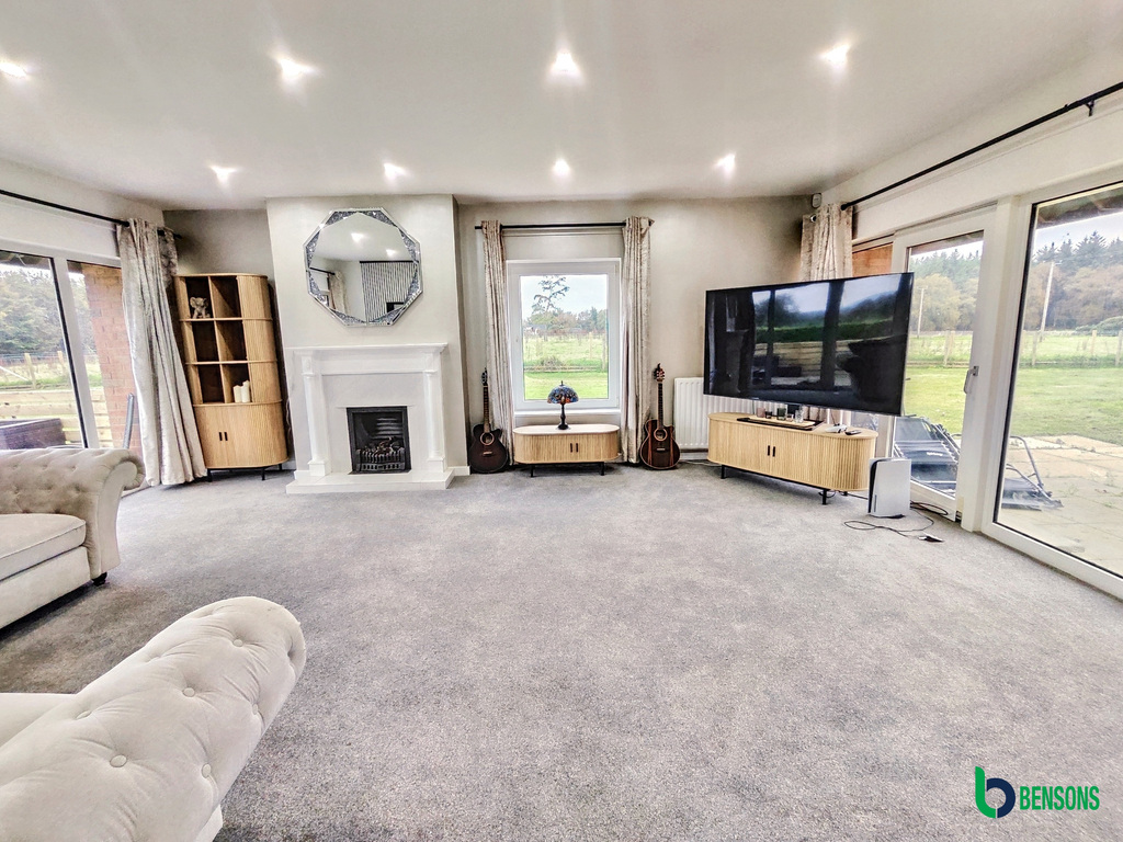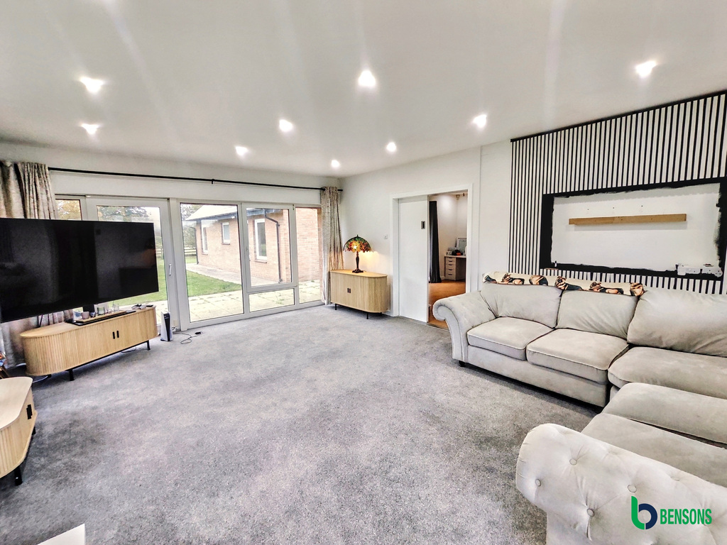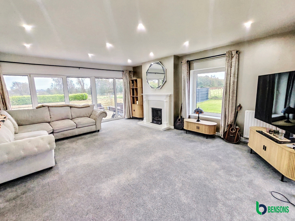 With feature fireplace with painted wooden surround, tiled inset, tiled hearth and gas fire, recessed lighting, floor to ceiling picture windows and patio doors to exterior.