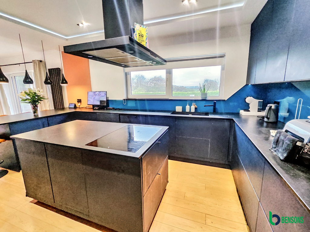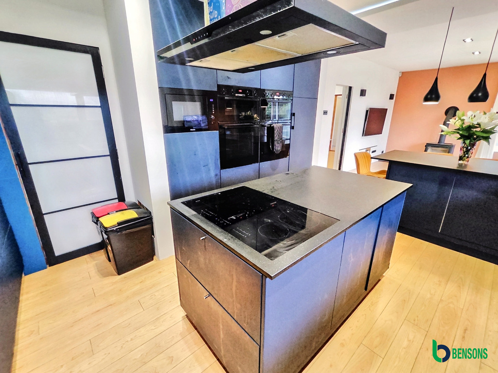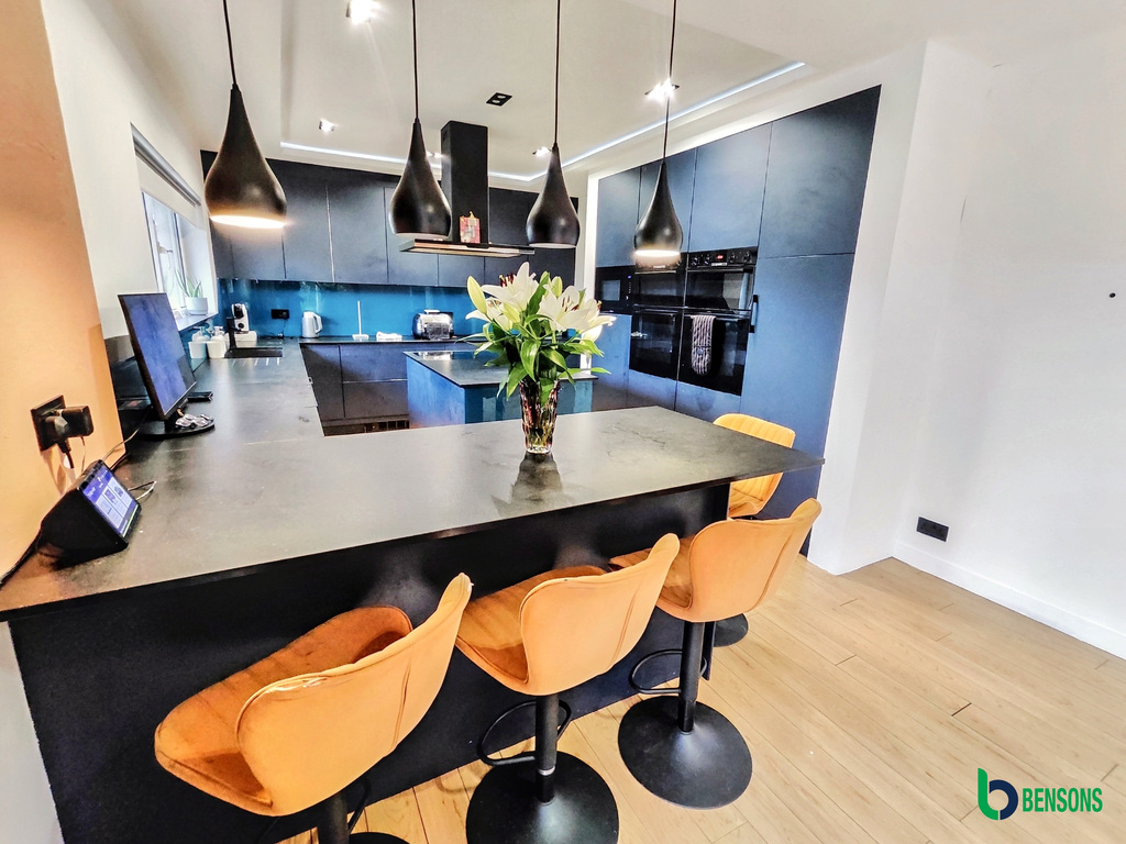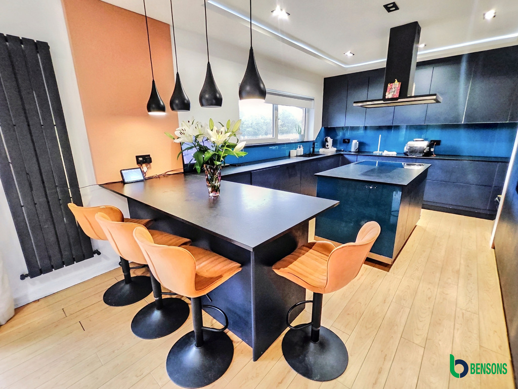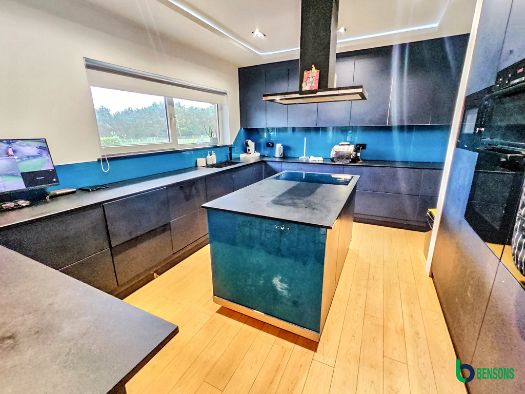 Recently fitted, with extensive range of eye and low level contemporary units with press control doors, granite worktops, sink unit, coloured glass splash backs, concealed lighting, two integrated eye level double ovens, integrated microwave, built-in fridge and dishwasher. Feature centre island with integrated induction hob with overhead extractor fan, granite worktop, low level units and seating area with overhead drop lighting. Multi-fuel stove with granite hearth, recessed lighting, points for wall lights, floor to ceiling radiator, Maple hardwood flooring and sliding patio doors to exterior.