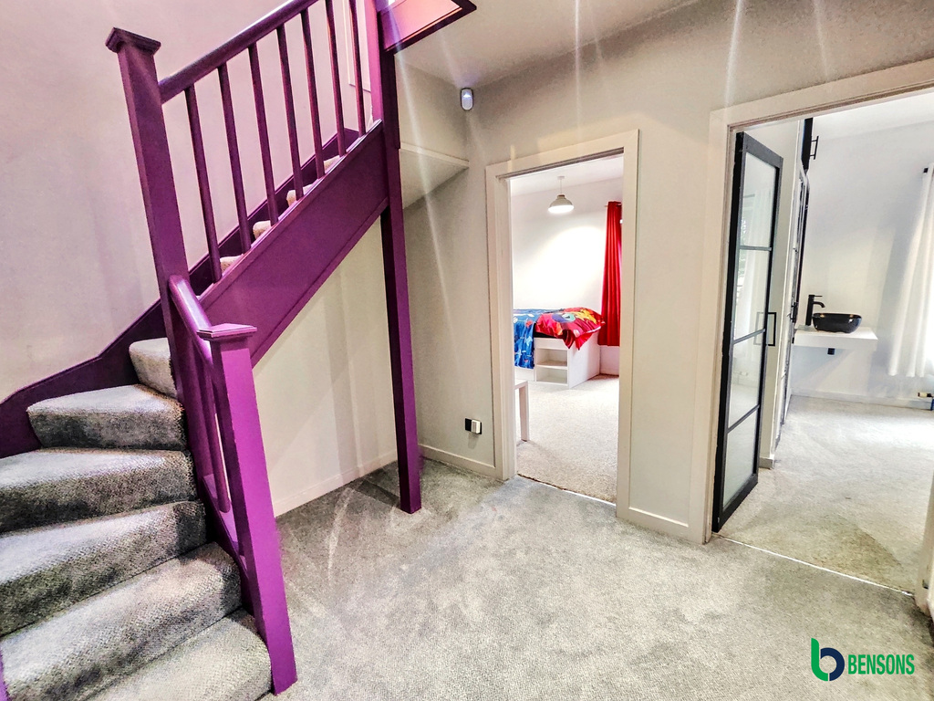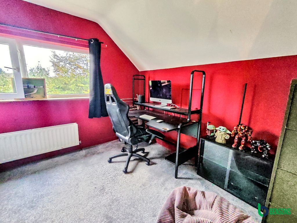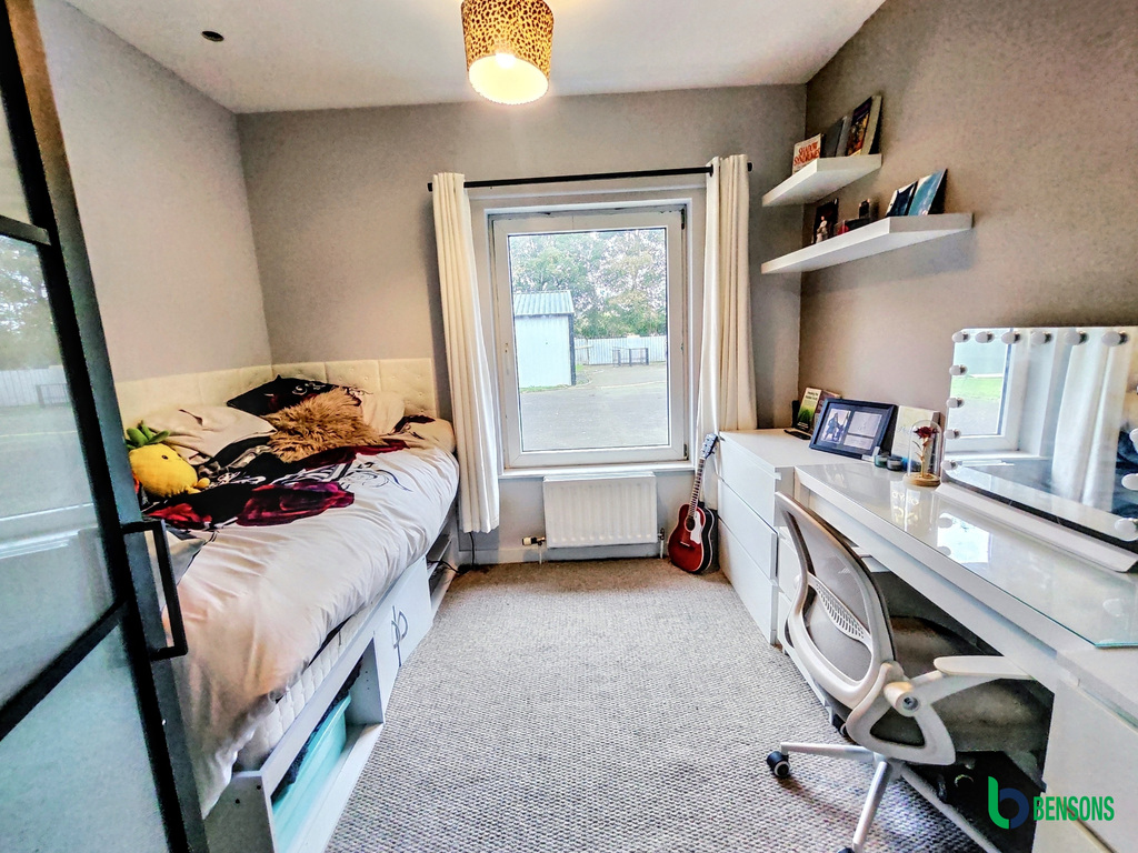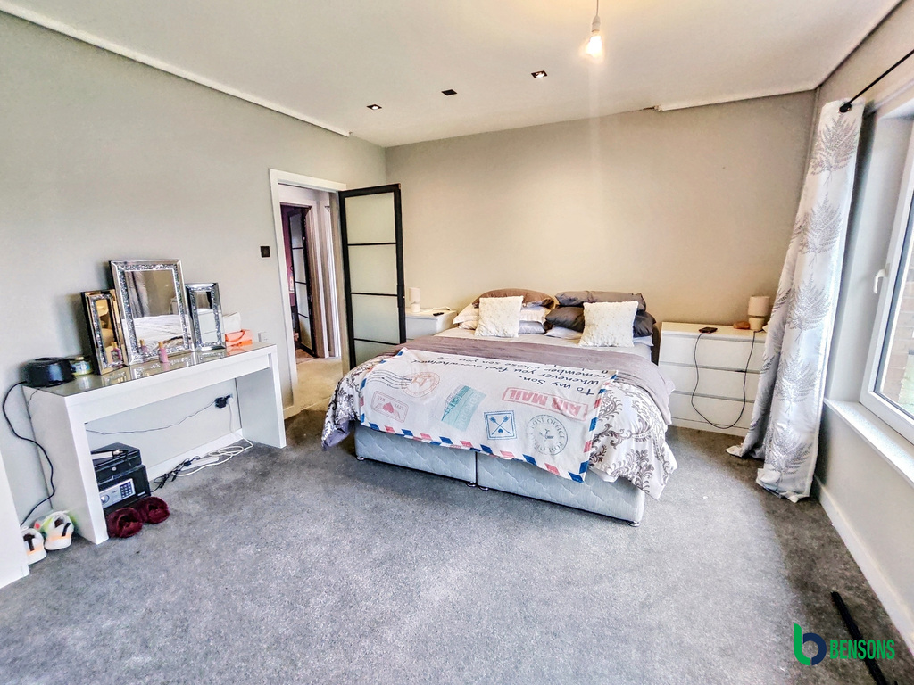 With ensuite with fully clad walk-in electric shower cubicle, wash hand basin, WC, part tiled walls, extractor fan, heated towel rail and recessed lighting.