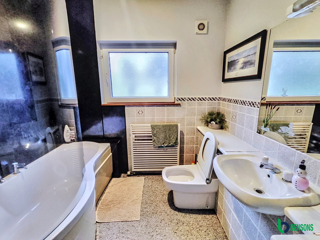 With suite comprising bath with overhead mains shower and PVC clad surround, vanity unit with wash hand basin, WC, half tiled walls, eyeball lighting, heated towel rail, extractor fan and hotpress.