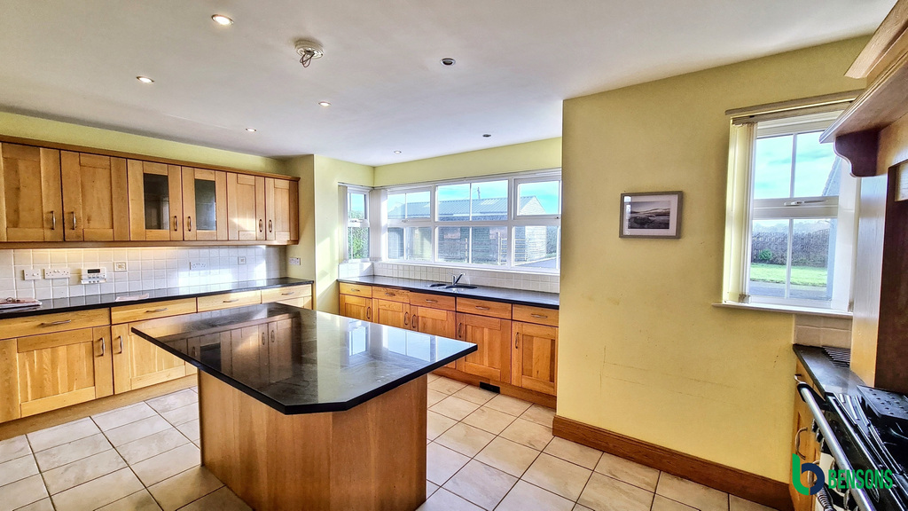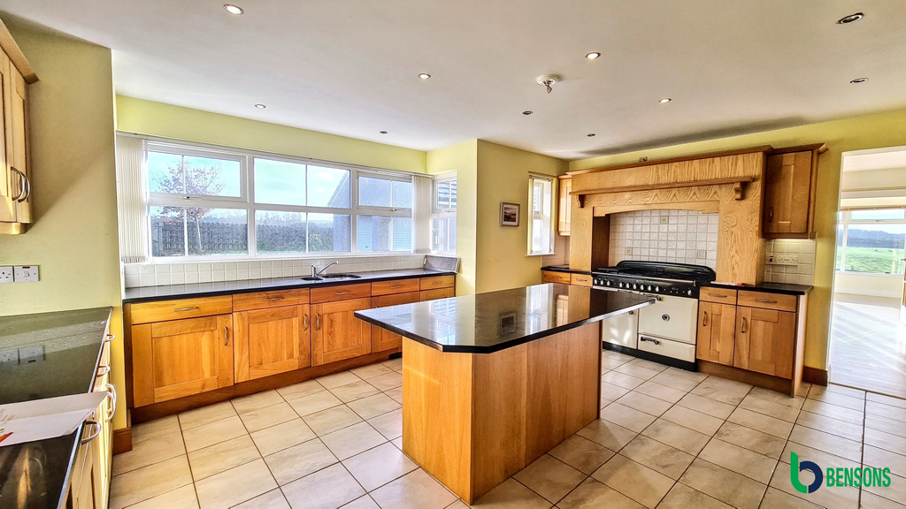 With a range of solid oak eye & low level units, granite worktops, centre island with seating, integrated dishwasher, integrated 6 ring "Rangemaster" gas stove with electric oven and tiled floor.