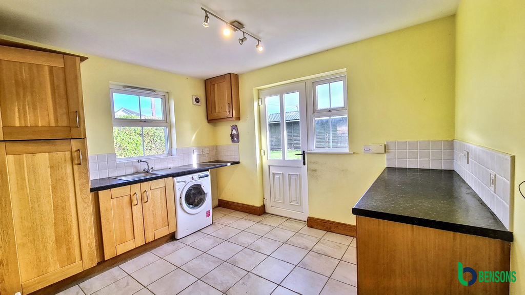 With low level units, larder cupboard, stainless steel sink unit, tiled floor and plumbed for washing machine.