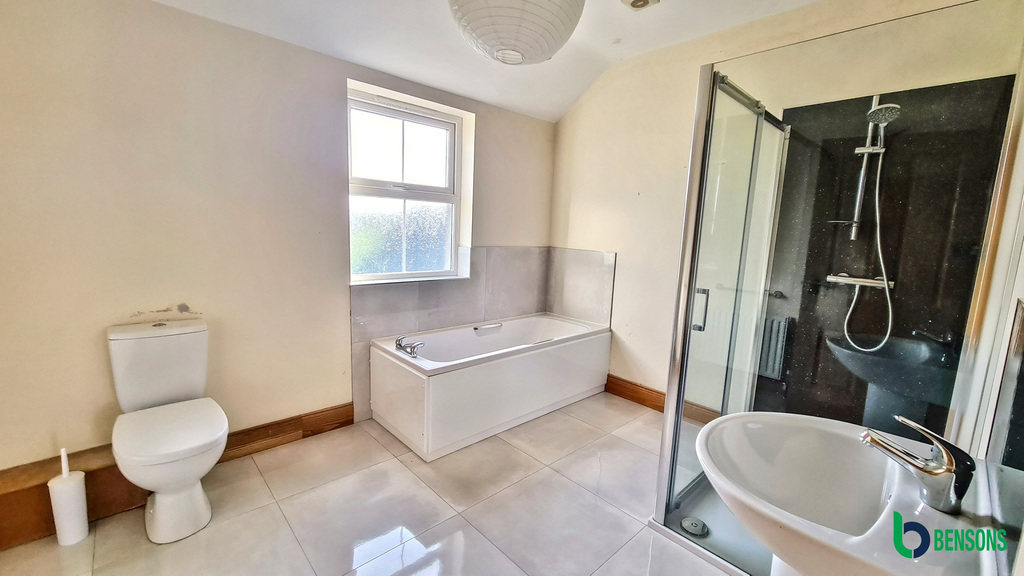 With WC, wash hand basin, bath, PVC panelled walk-in mains shower cubicle and tiled floor.