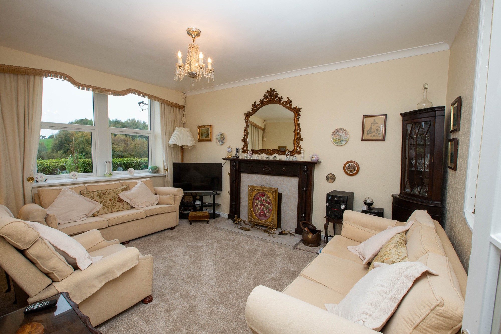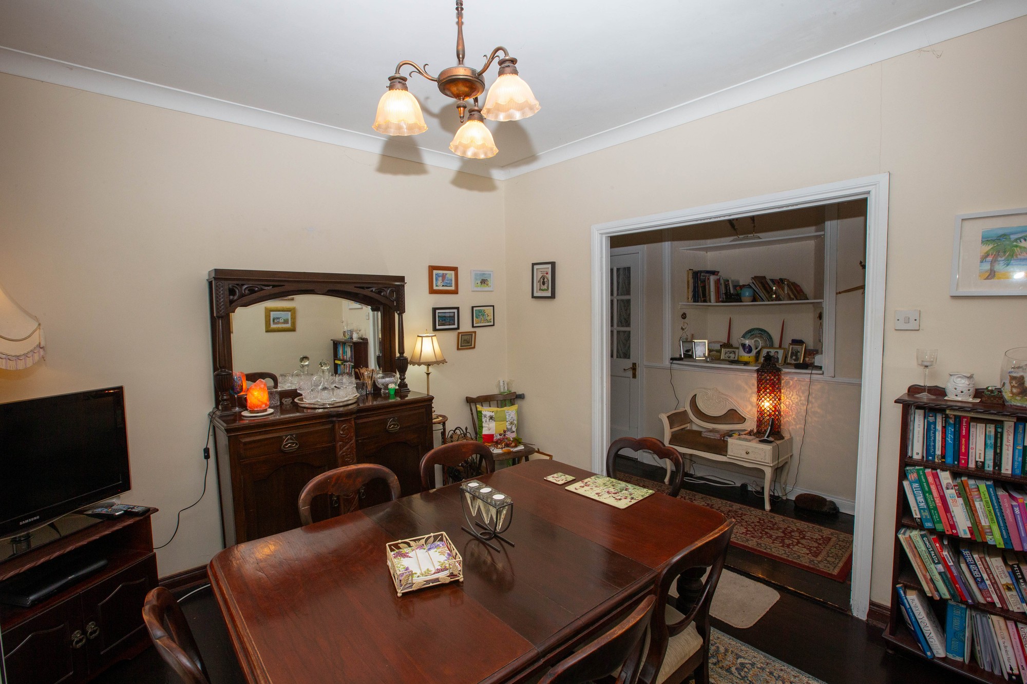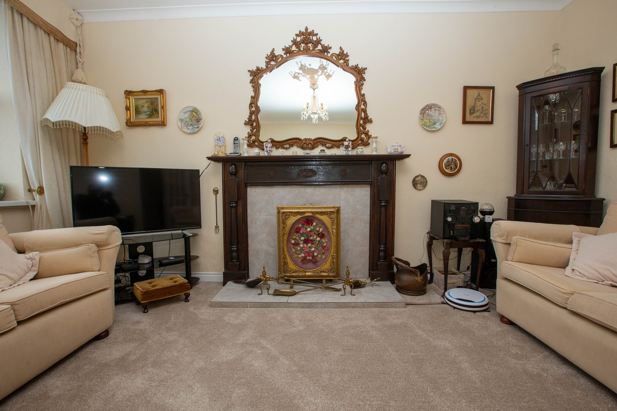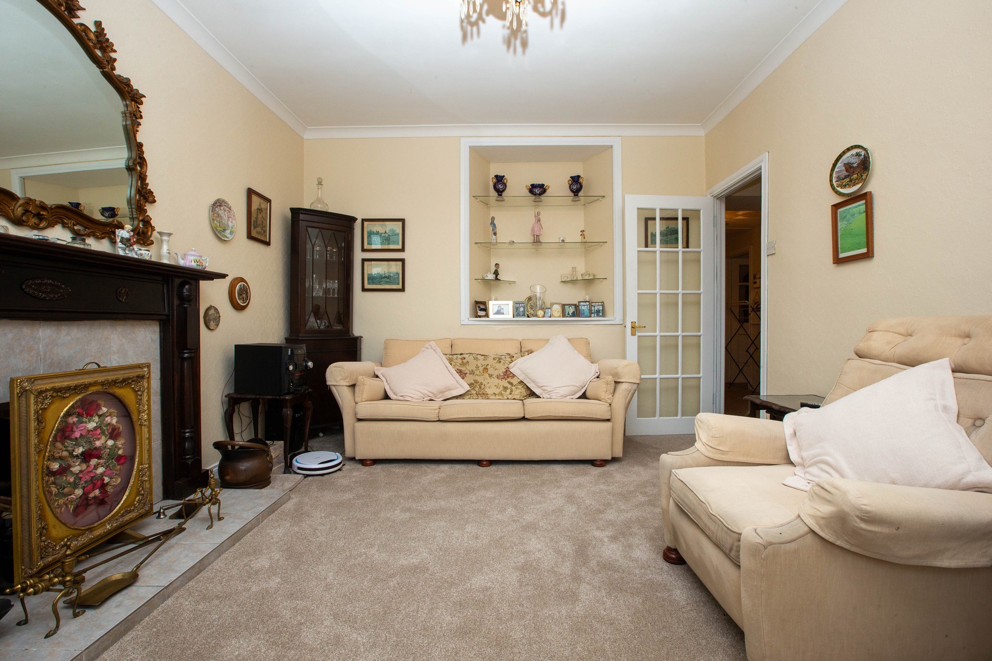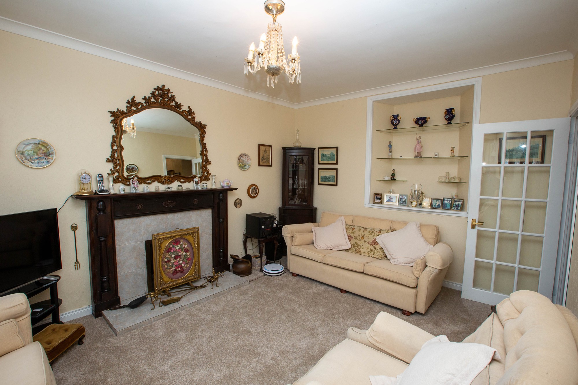 Living Room 15’7” x 11’6” (15.7m x 3.5m) - Feature mahogany fireplace with tiled inset and hearth, cornicing, display shelving.